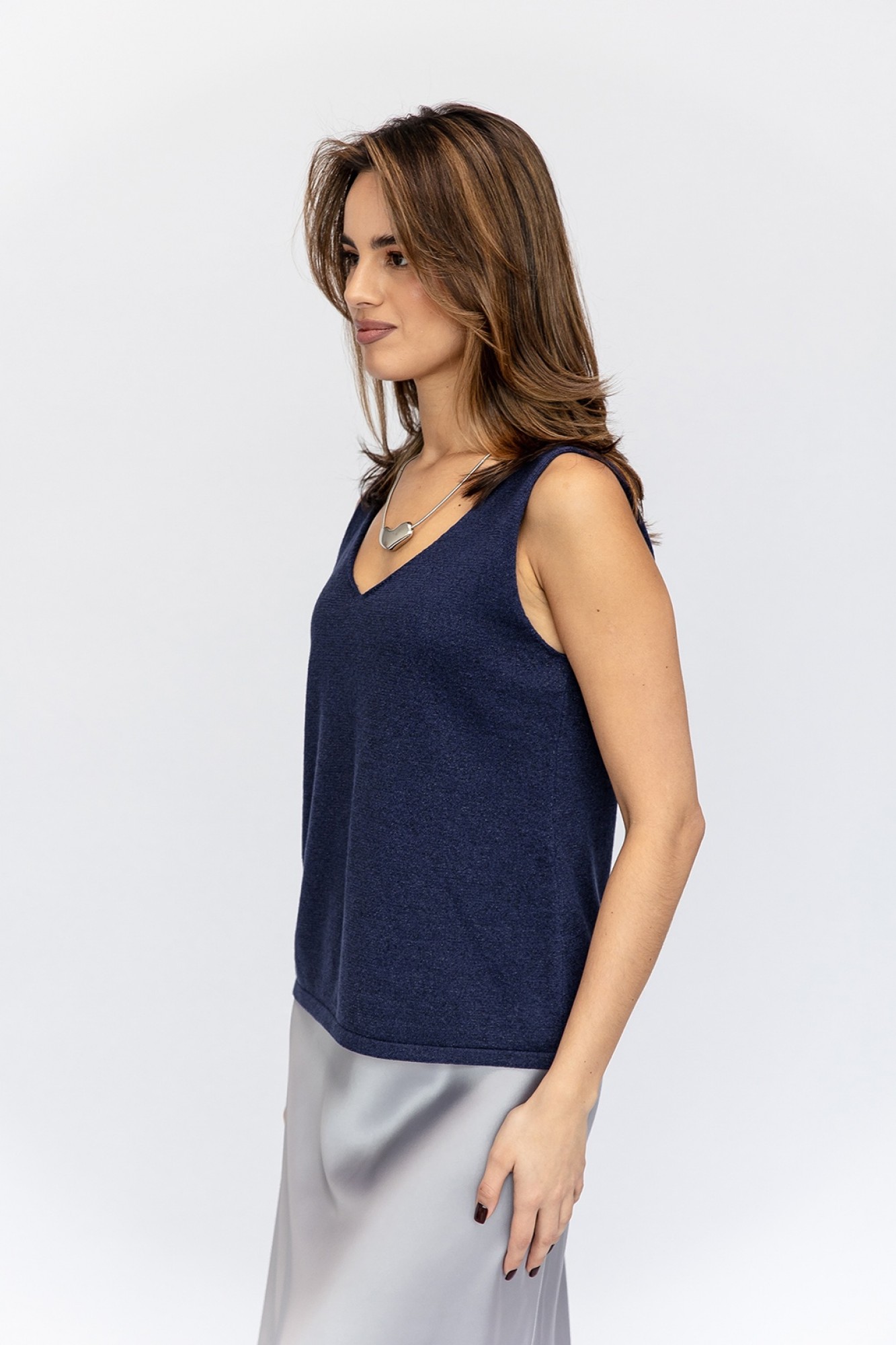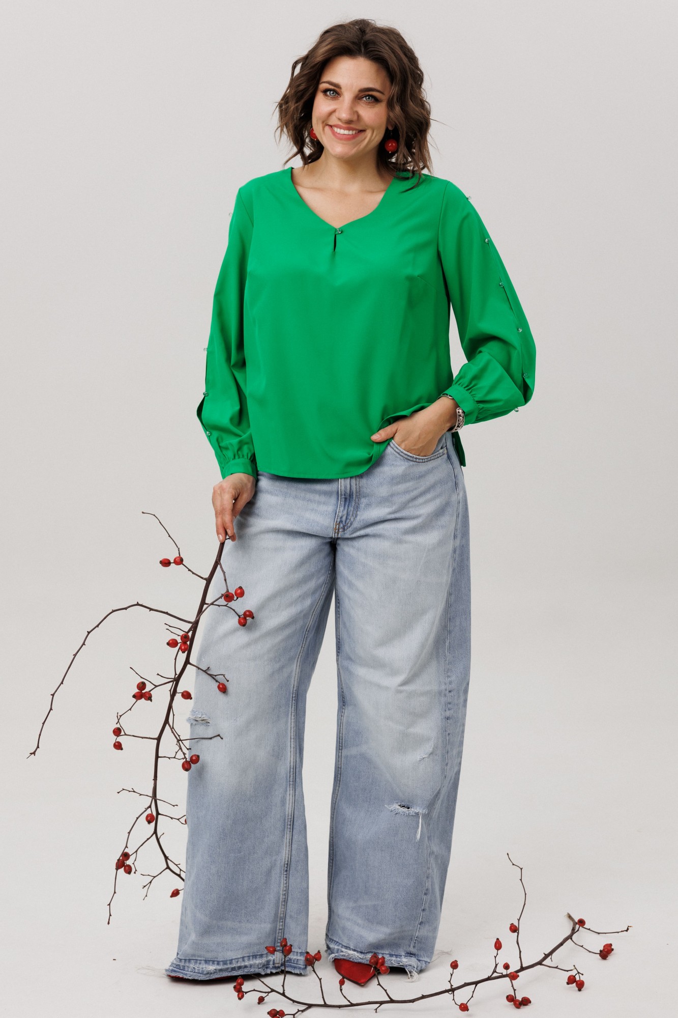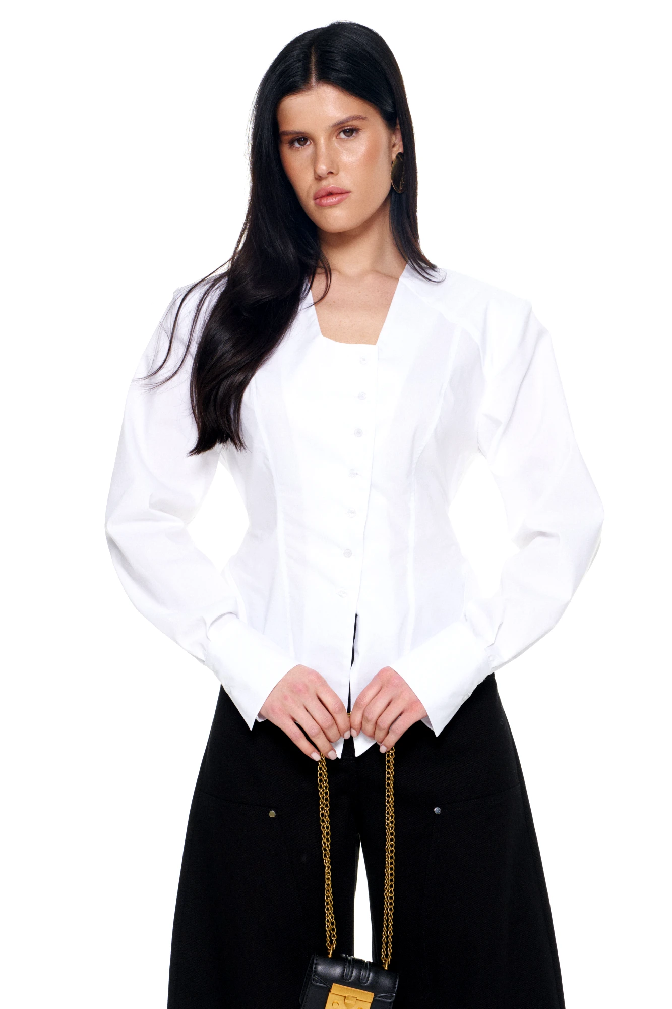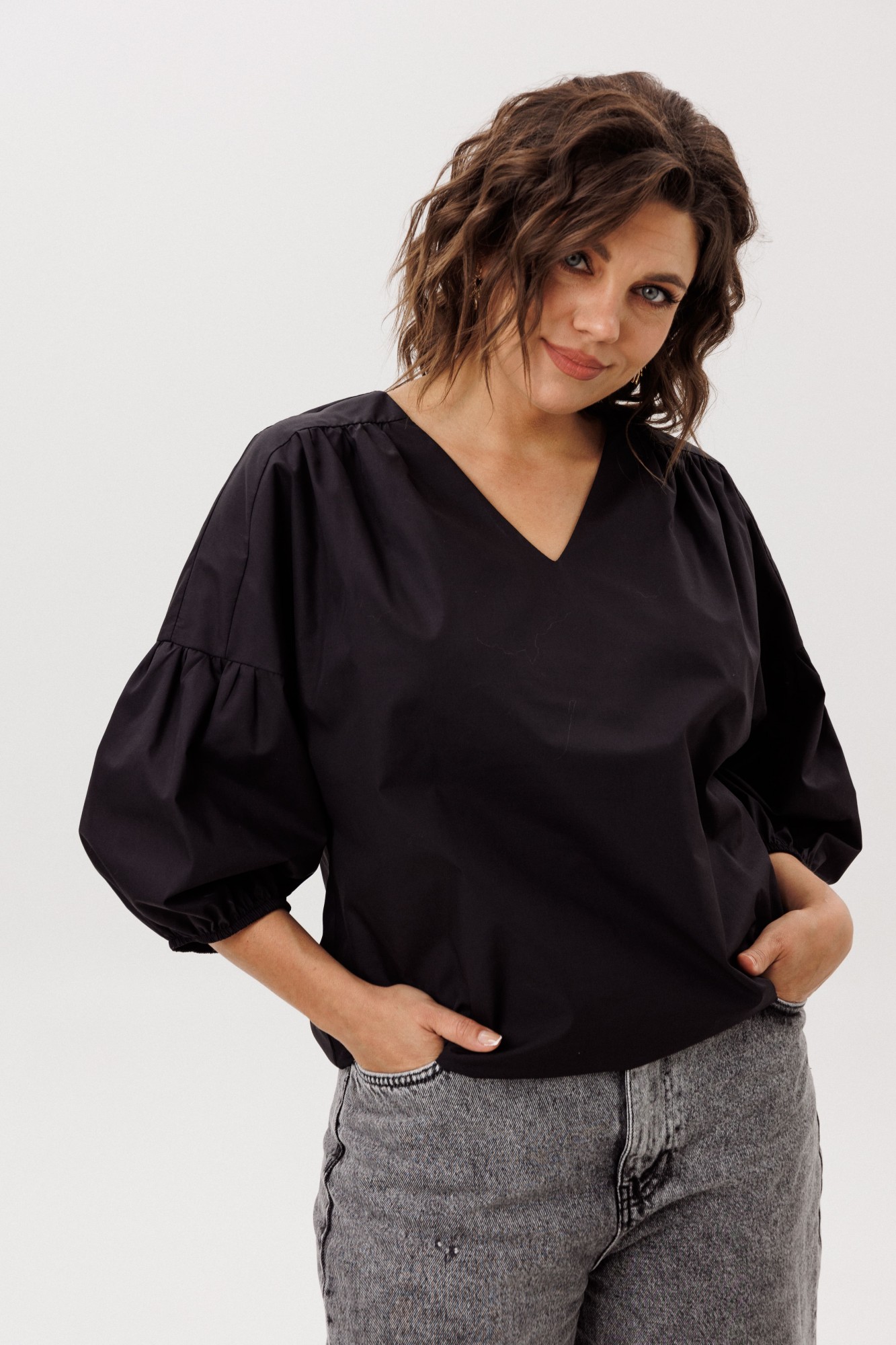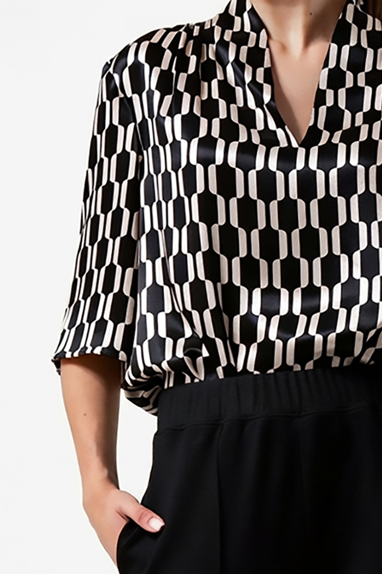 • Блузка с V –образным вырезом горловины – такая модель, наглядно делает больше длину вашей шеи.