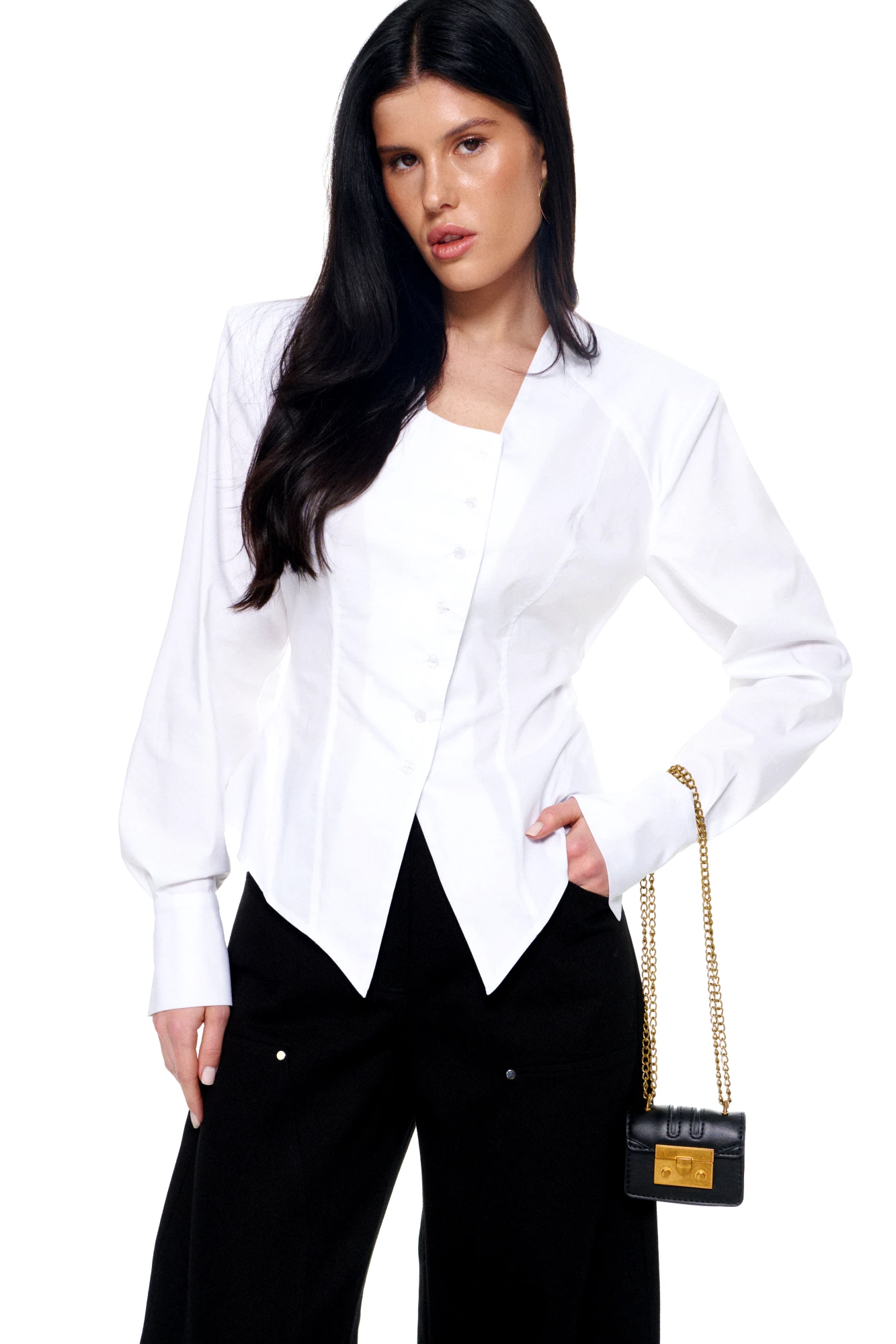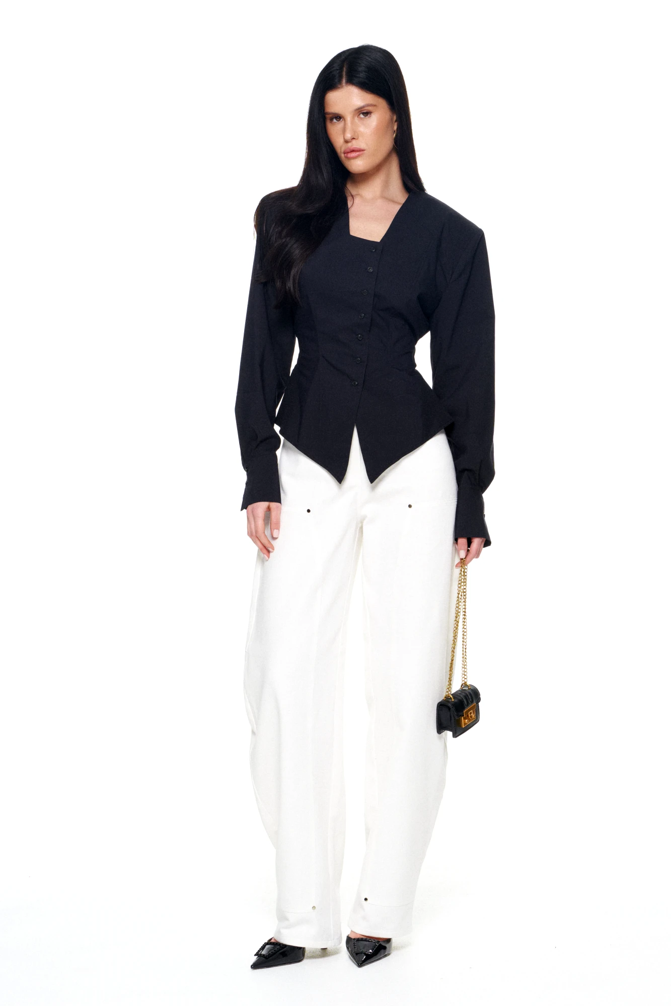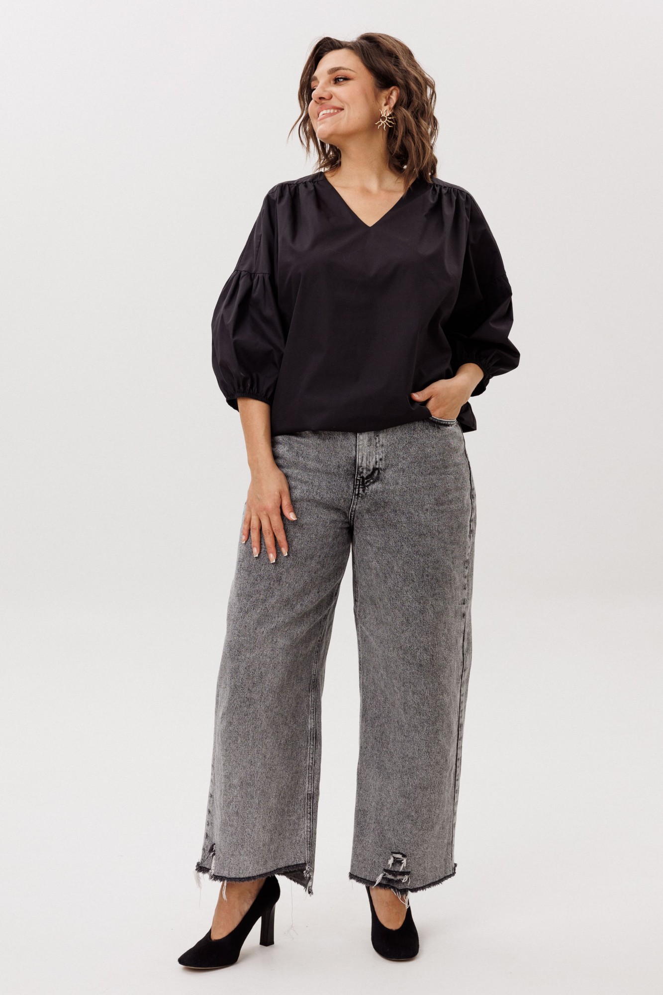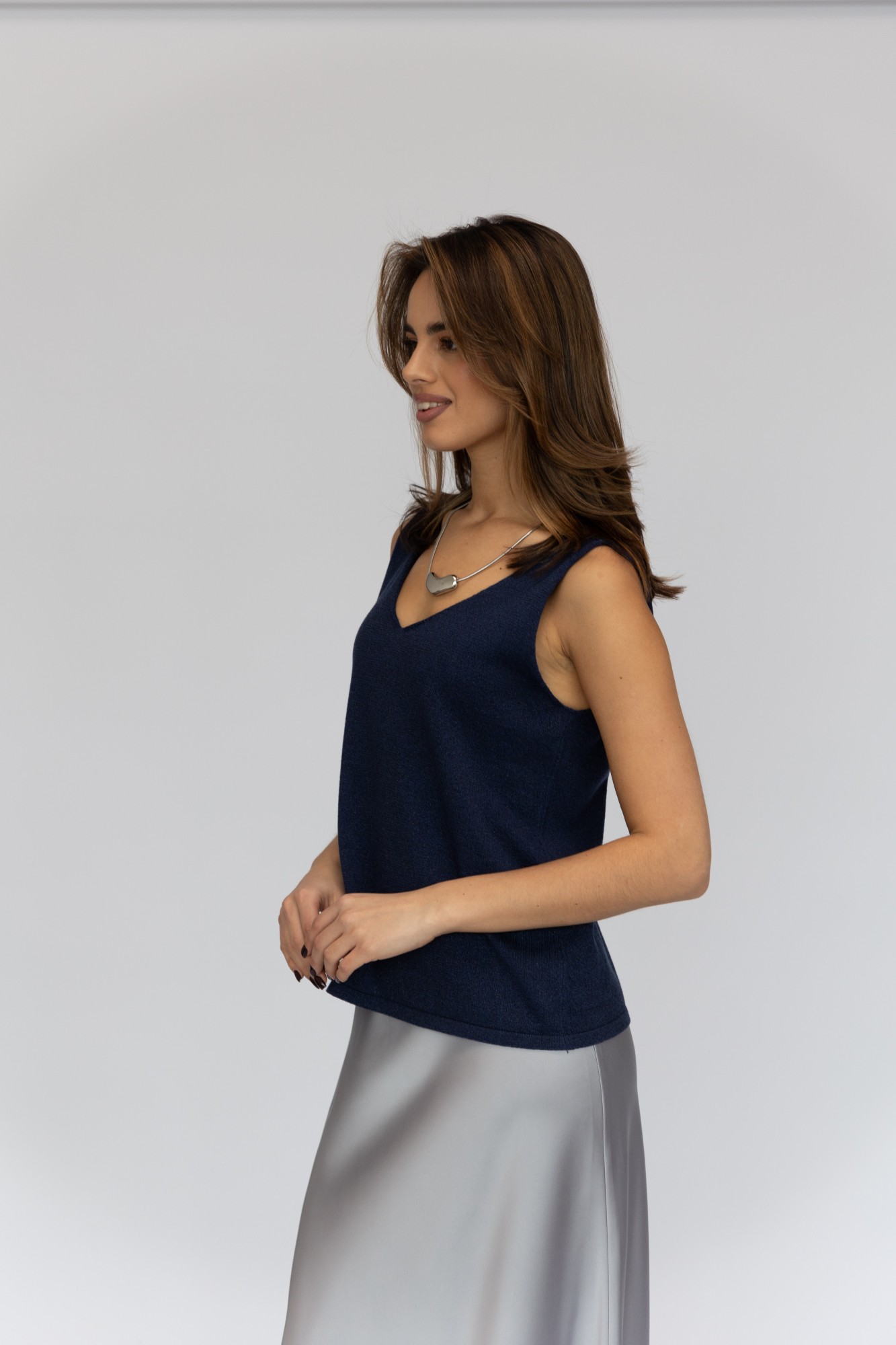 • Блузка с V –образным вырезом горловины – такая модель, наглядно делает больше длину вашей шеи.