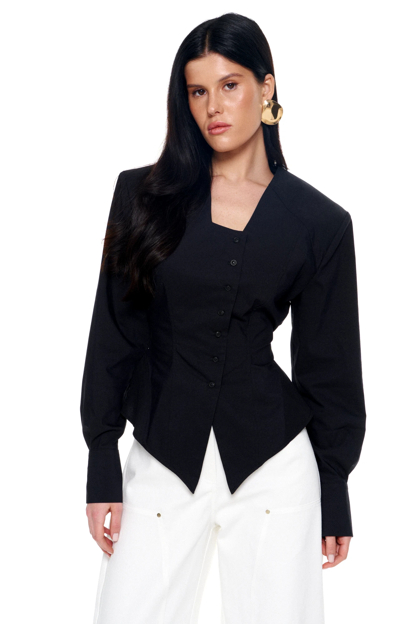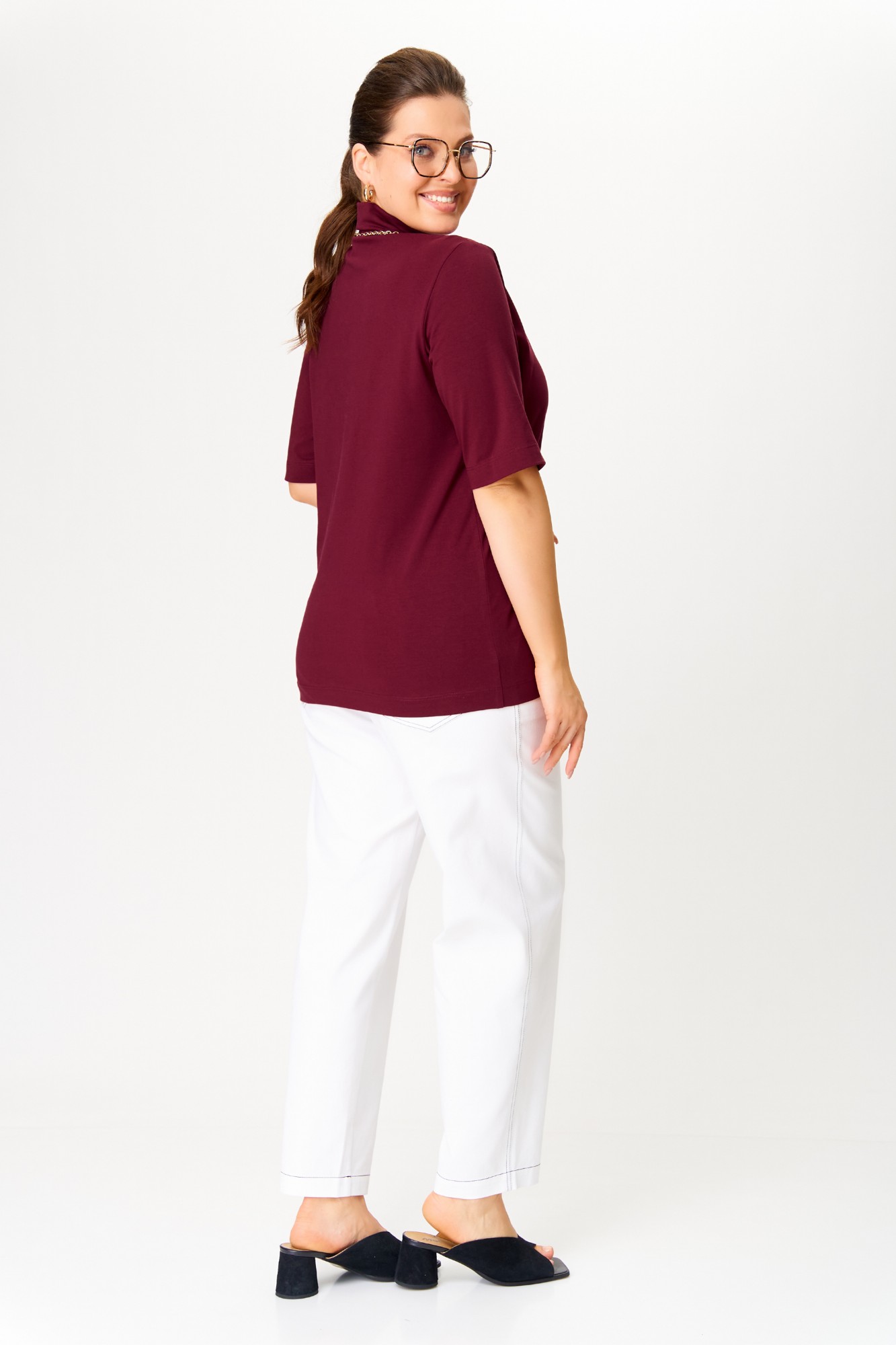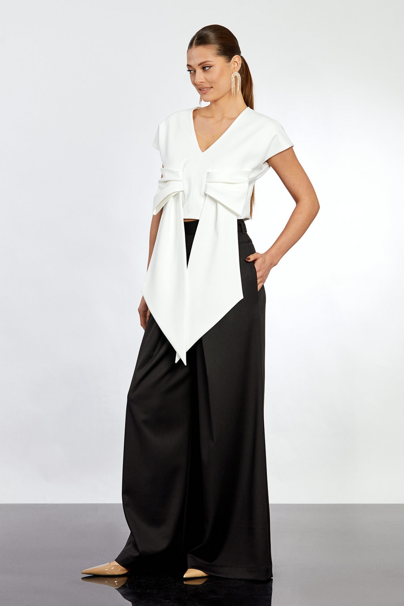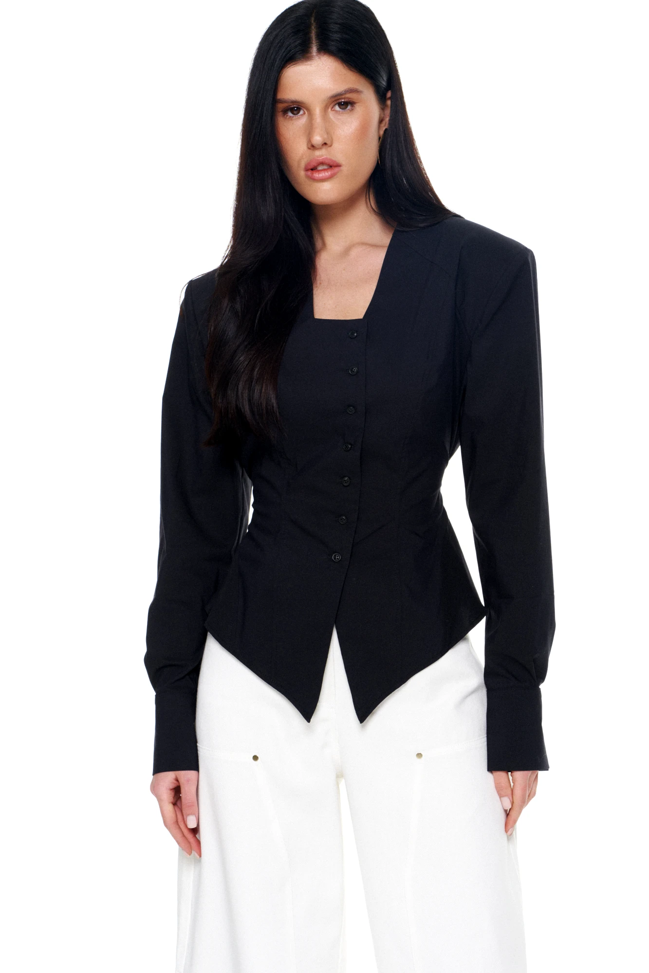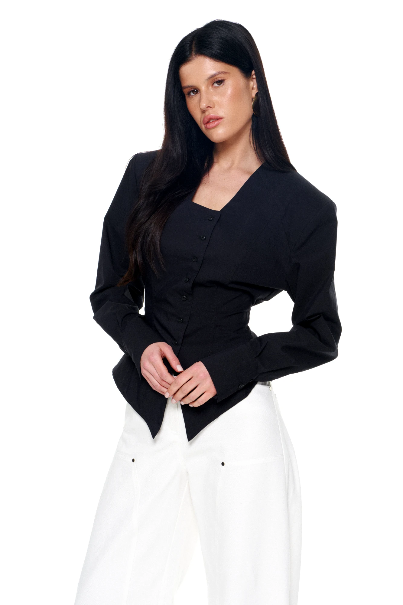 • Блузка с V –образным вырезом горловины – такая модель, наглядно делает больше длину вашей шеи.