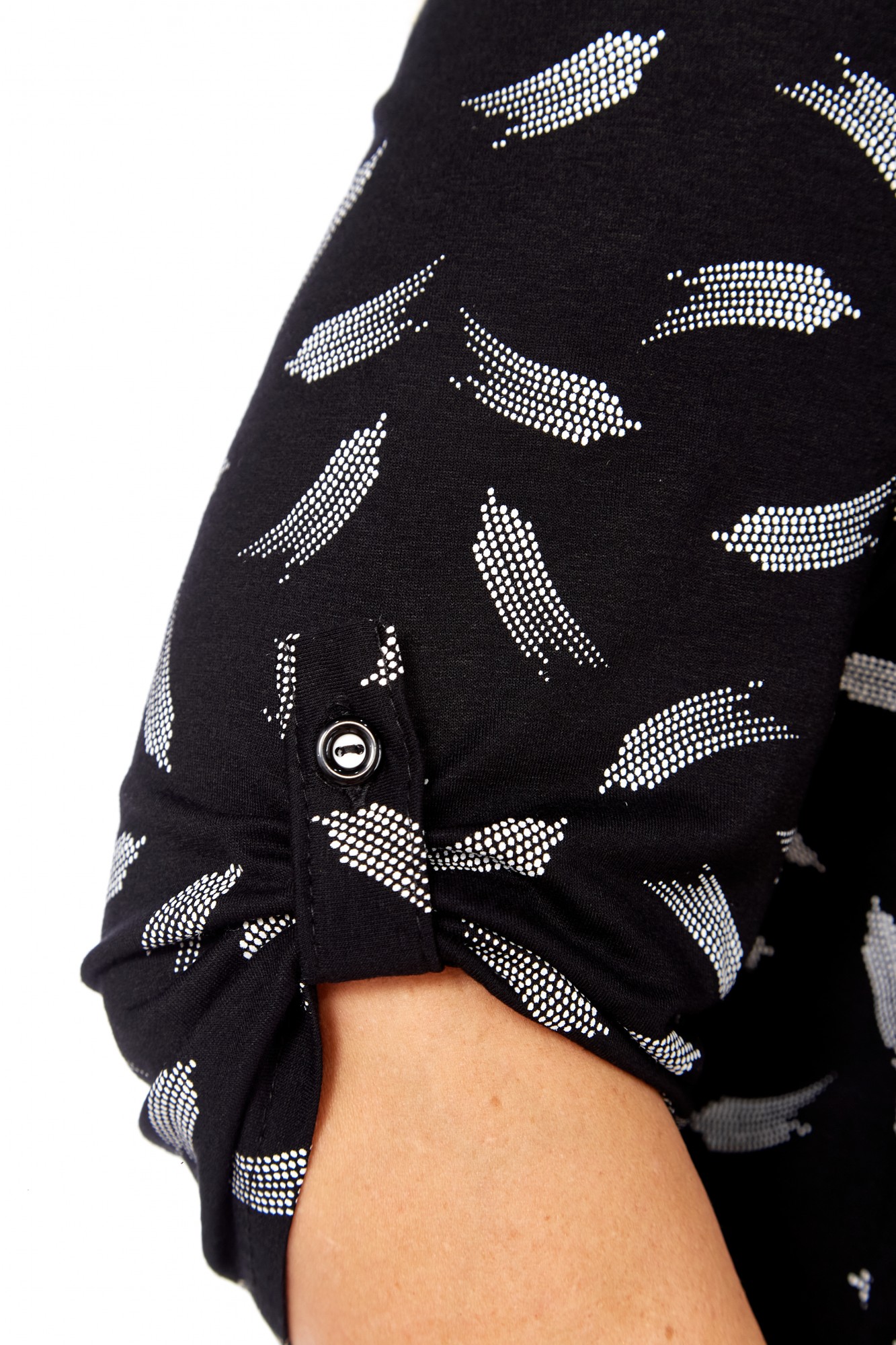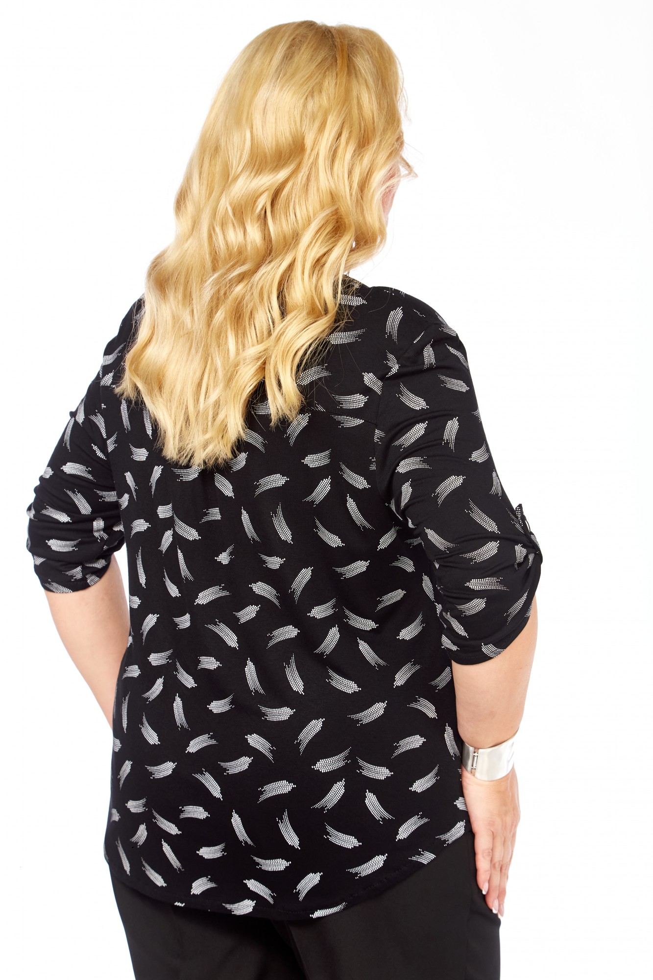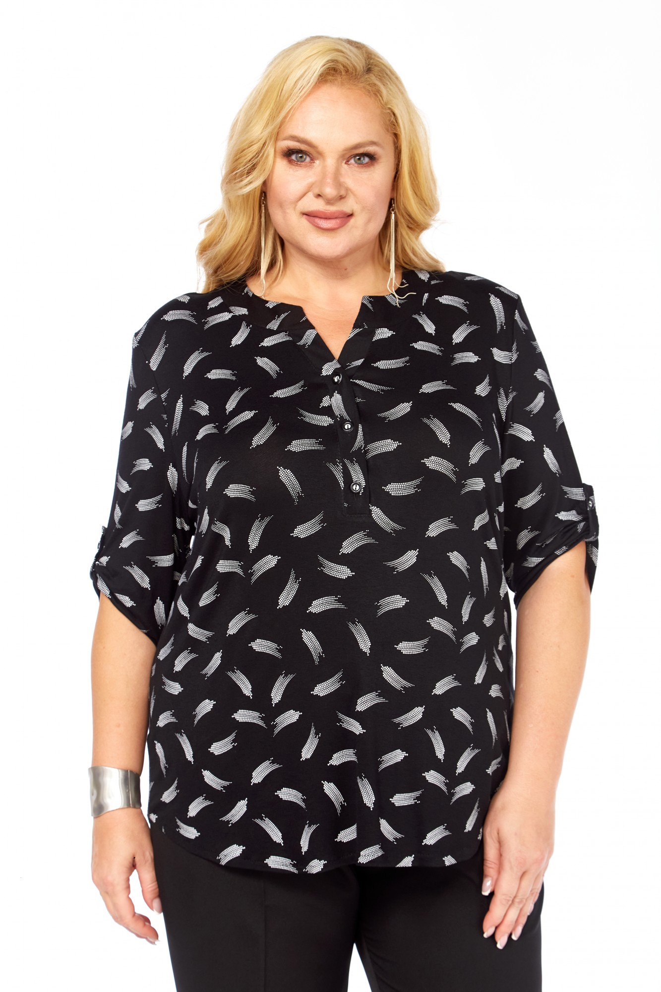Свободный оверсайз-крой скрывает недостатки, такие как живот и бёдра, при этом изящно подчеркивая линию груди. Визуально вытягивающий силуэт абстрактный принт на черной основе придает образу воздушность и легкость.