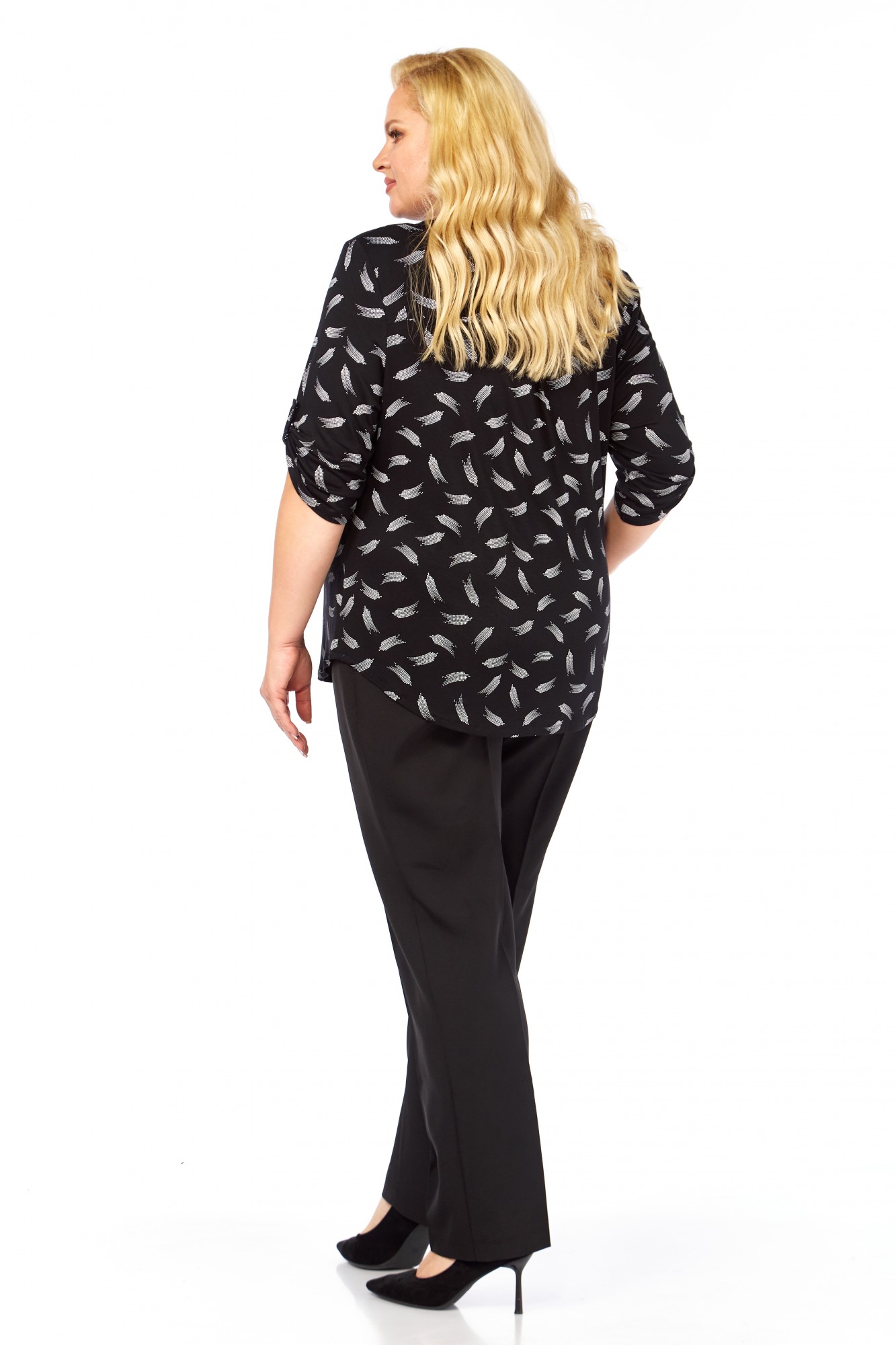 Детали, продуманные до мелочей, делают эту блузку безупречной. Округлая горловина с декоративной планкой и пуговицами добавляет утонченности. Декоративный шов по спинке с мягкой сборкой обеспечивает идеальную посадку и дополнительный объем. Тонкие подплечники формируют красивую линию плеч, улучшая осанку. А асимметричный низ с легким закруглением делает модель универсальной: ее можно носить как навыпуск, так и частично заправленной.
