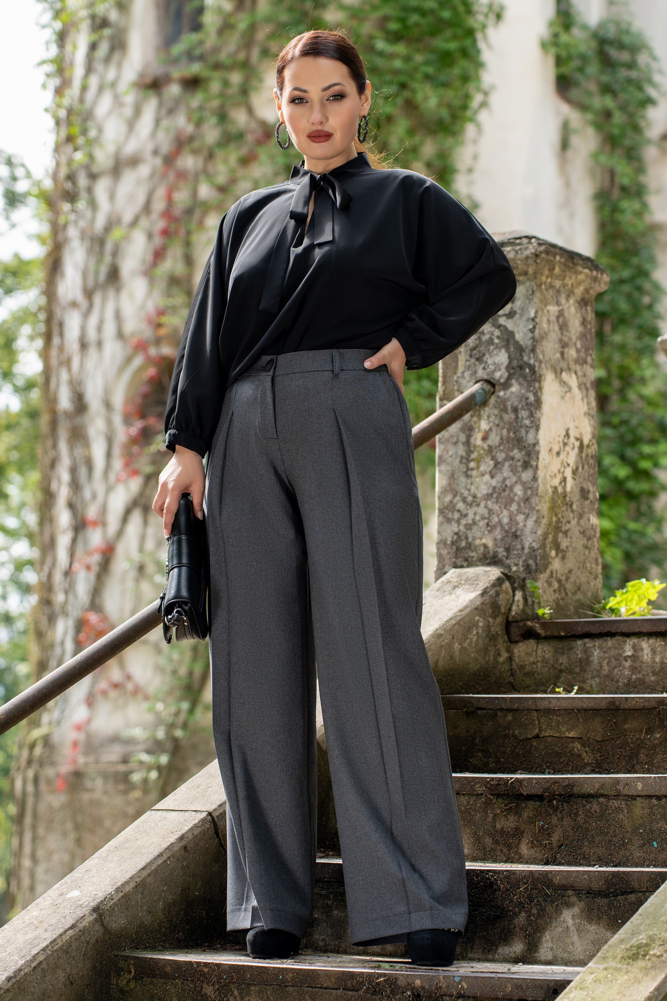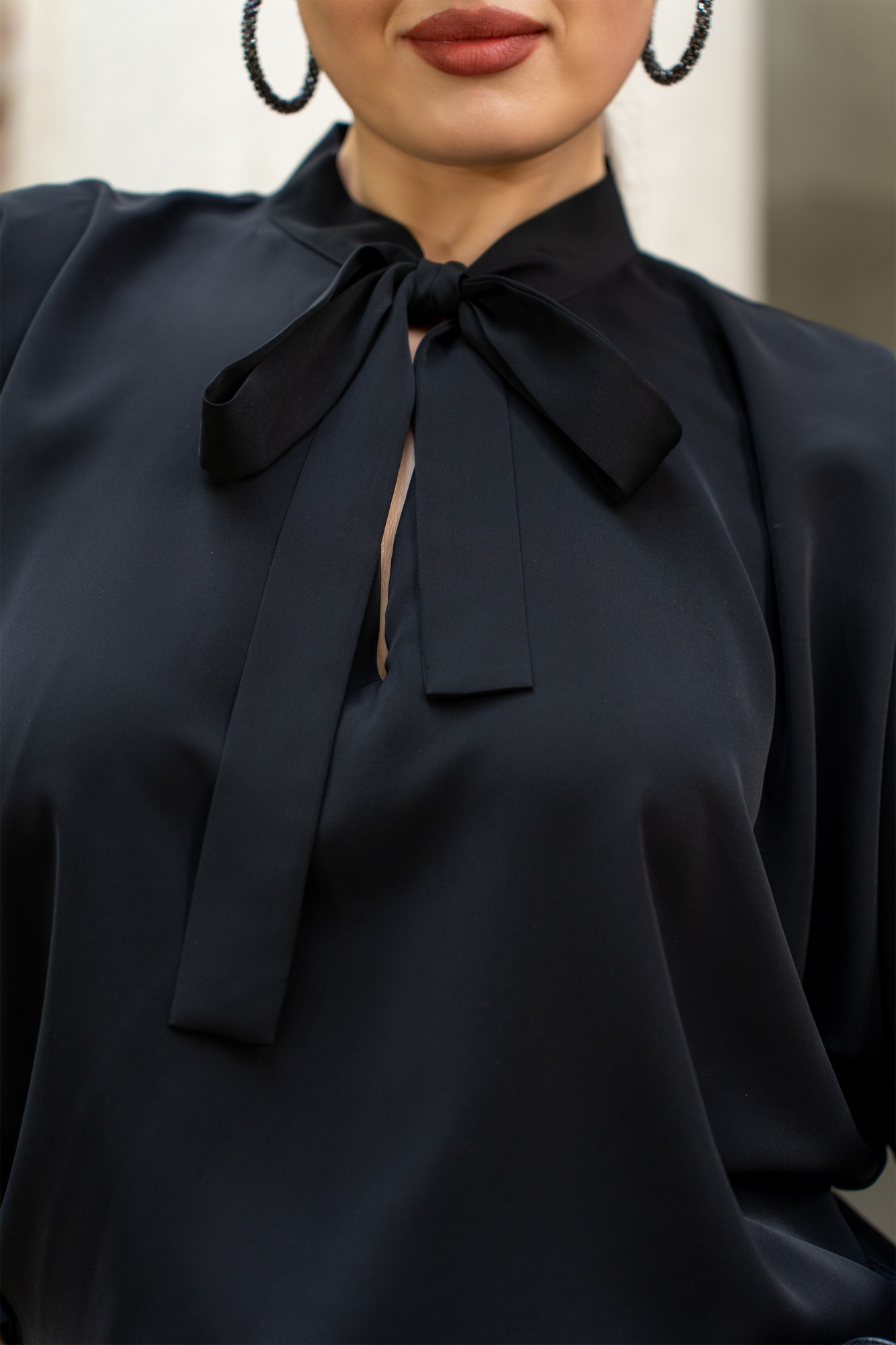Элегантная женская блузка черного цвета, выполненная в стиле "летучая мышь", идеально подойдет как для торжественного мероприятия, так и для повседневной носки. Блузка со стойкой-завязкой, добавляющими изысканности образу. Цельнокроеные рукава с застежкой на петлю и пуговицу. Асимметричный низ блузки спереди короче, сзади длиннее, что придает дополнительный стиль. Эта блузка станет изысканным дополнением к вашему гардеробу.