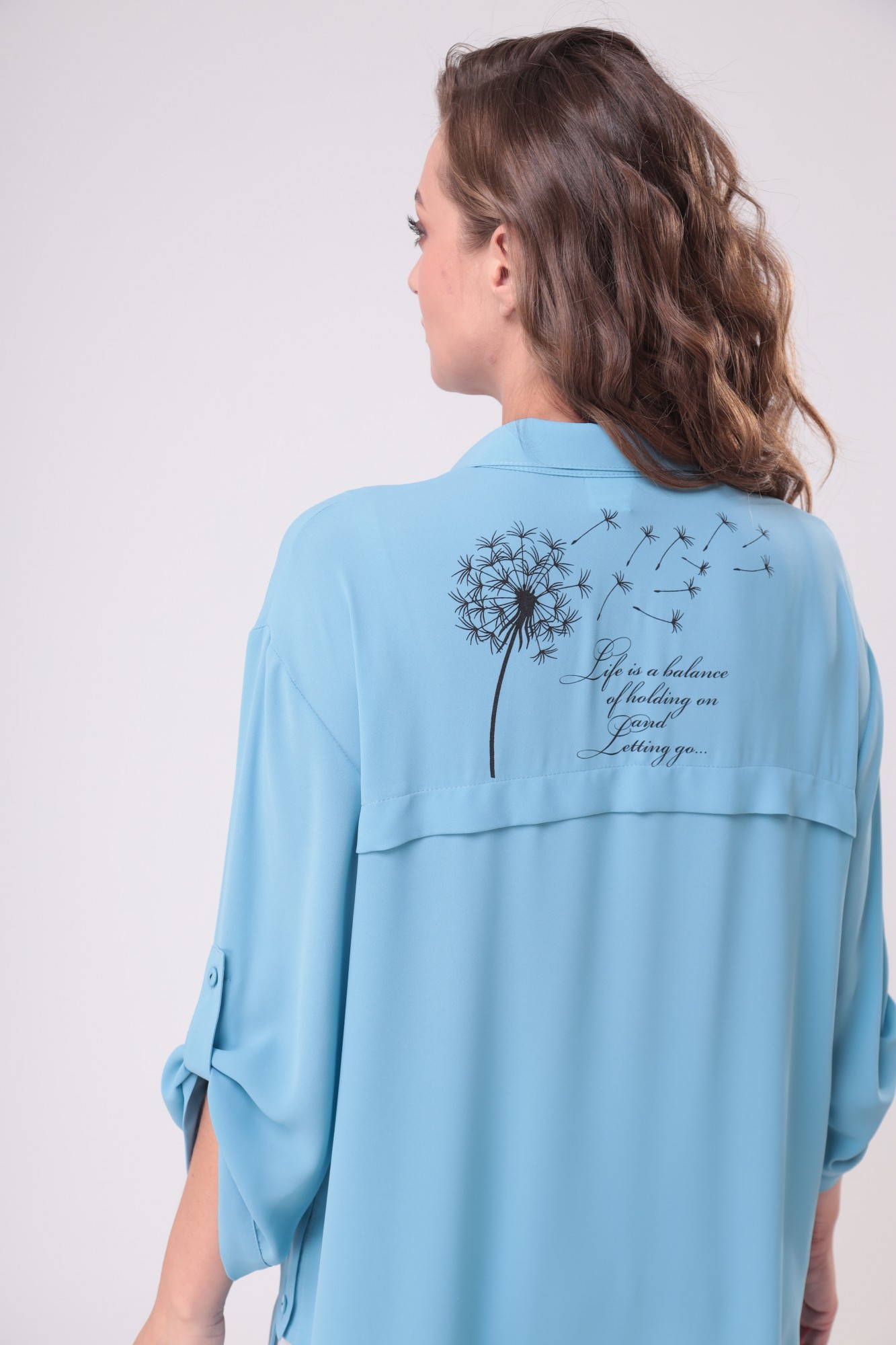 Блузка прямого силуэта, длиной ниже бедер, выполнена из однотонной ткани. Полочка с застежкой на петли и пуговицы, по правой нижней части декор в виде принта. Спинка с отрезной кокеткой, но которой выполнен декор в виде принта. Воротник рубашечного типа, стояче-отложной. Низ блузки ассиметричный, по побоковым швам обработана застежка. Пройма углубленной формы, рукав рубашечного типа, длиной 7/8 по низу с патами.