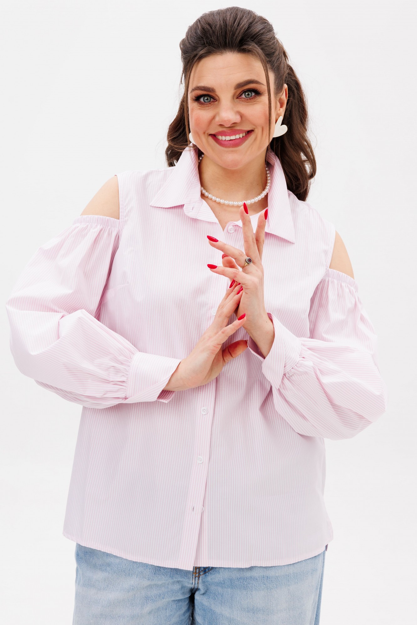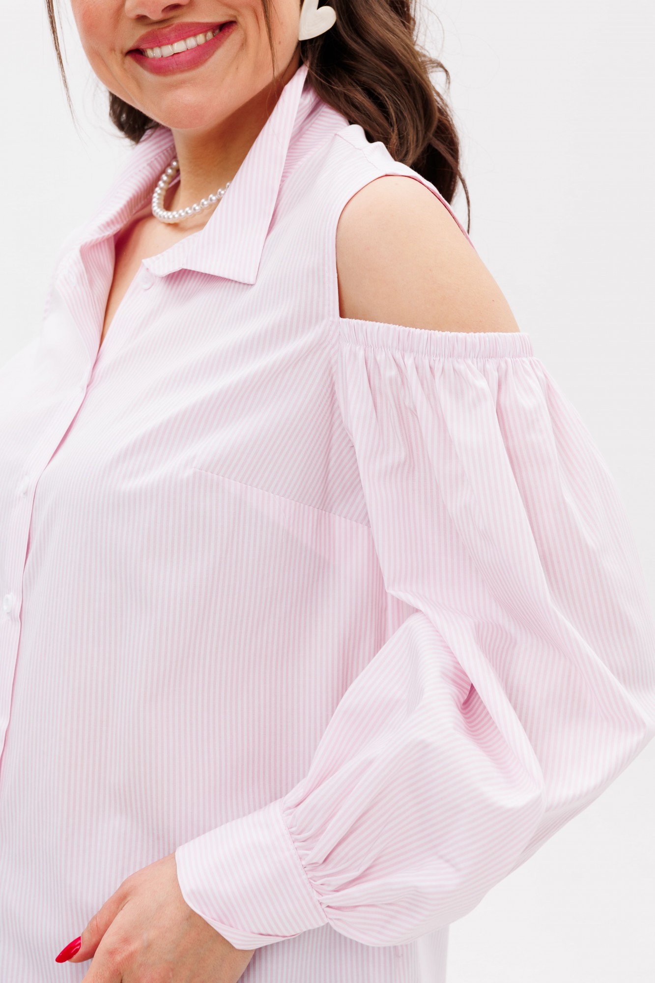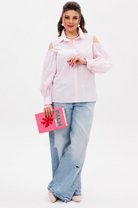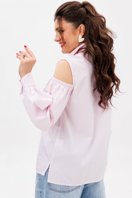 Блуза выполнена из премиального хлопка нежного розового оттенка, который подчеркивает свежесть и утонченность. Она станет идеальным выбором для создания романтичных и стильных образов, сочетаясь с юбками, брюками или джинсами.