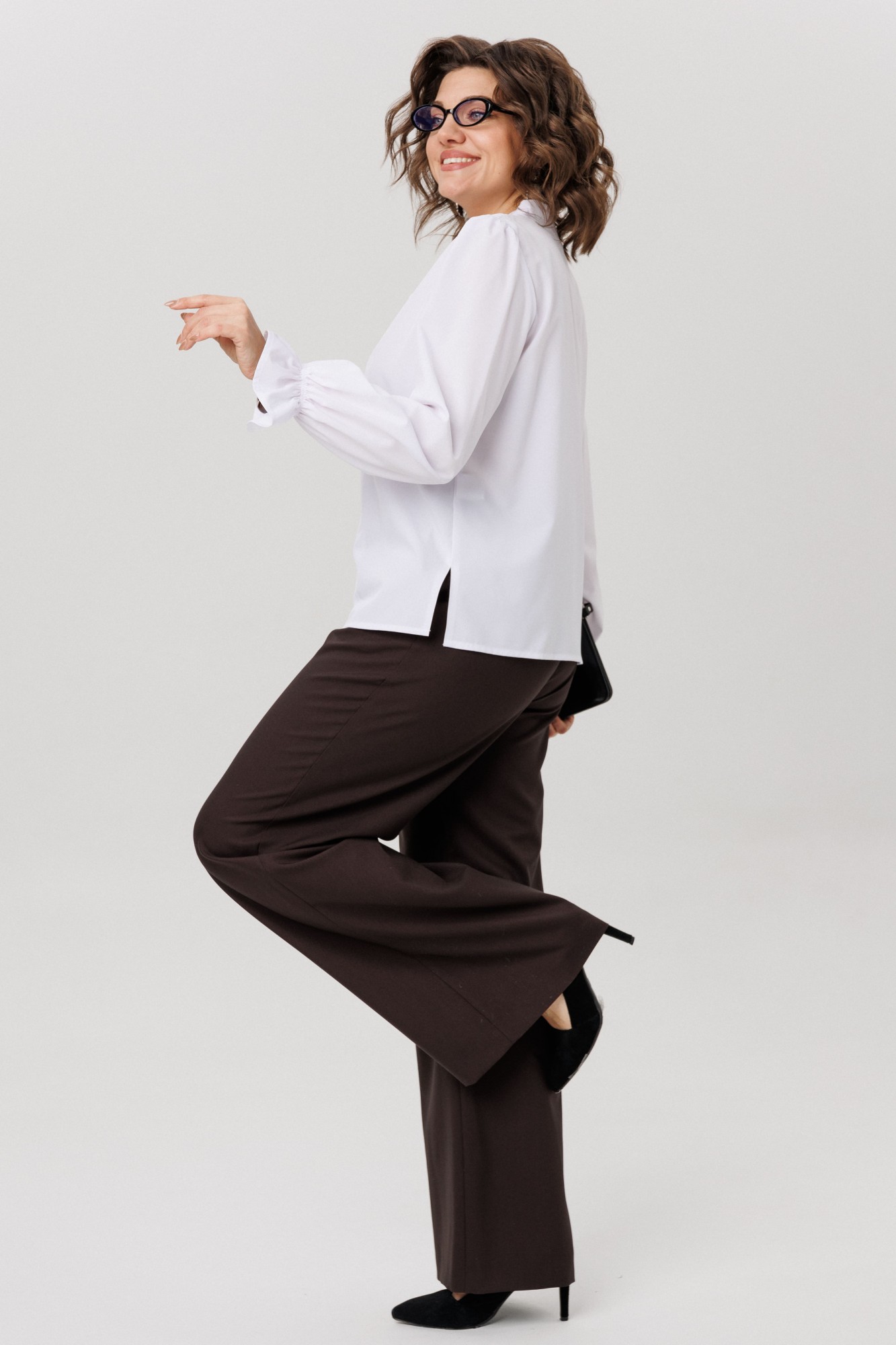 Передняя часть блузы оснащена средним швом, который формирует элегантный вырез-щель, дополненный сборкой по плечевому шву для создания изысканного образа.