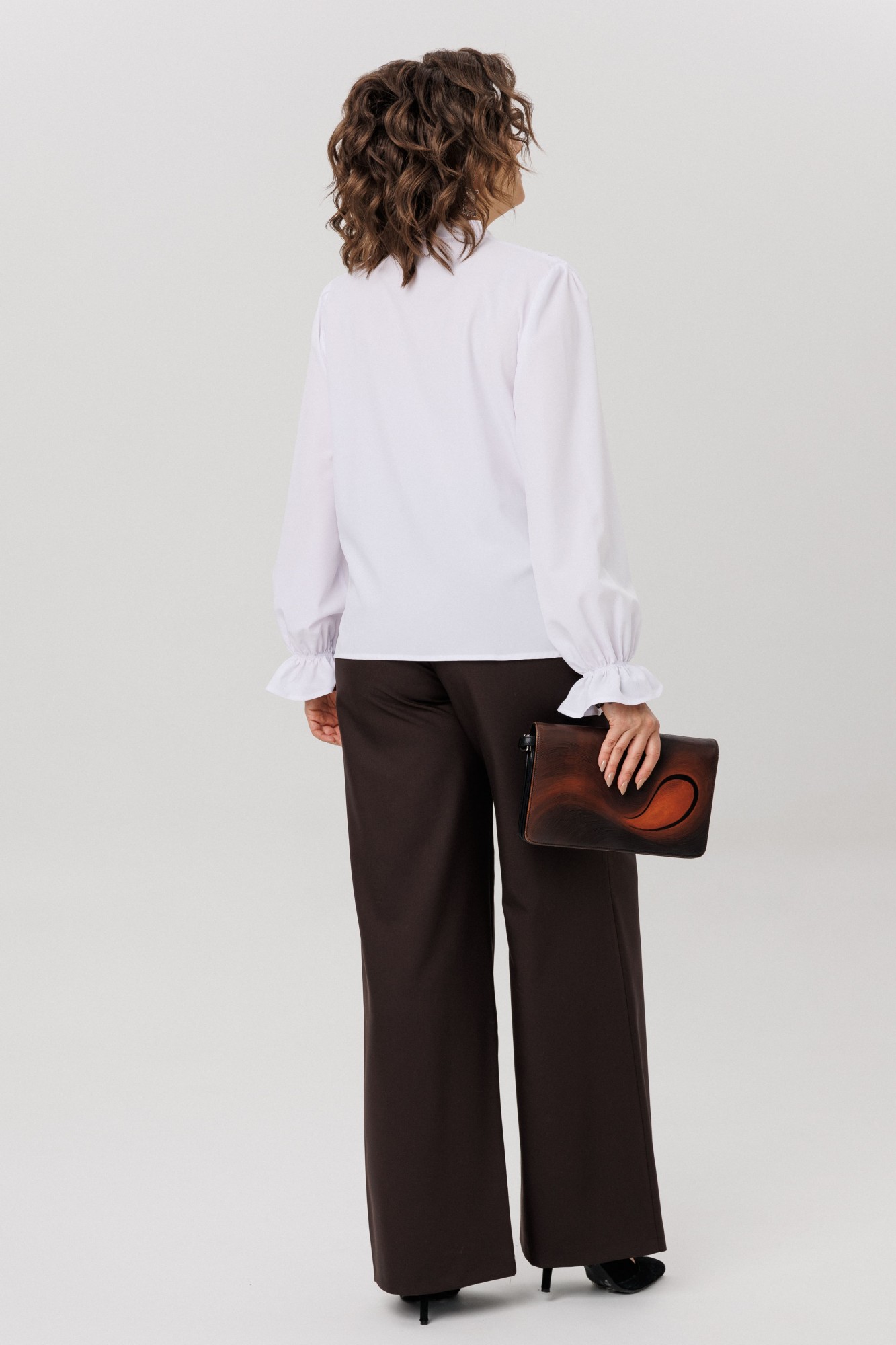 Длинные втачные рукава свободного кроя украшены сборкой по низу и декоративными завязками, добавляя нотку игривости и оригинальности. Воротник-стойка, отделанный бархатной тесьмой, придает блузе особый шарм и утонченность.