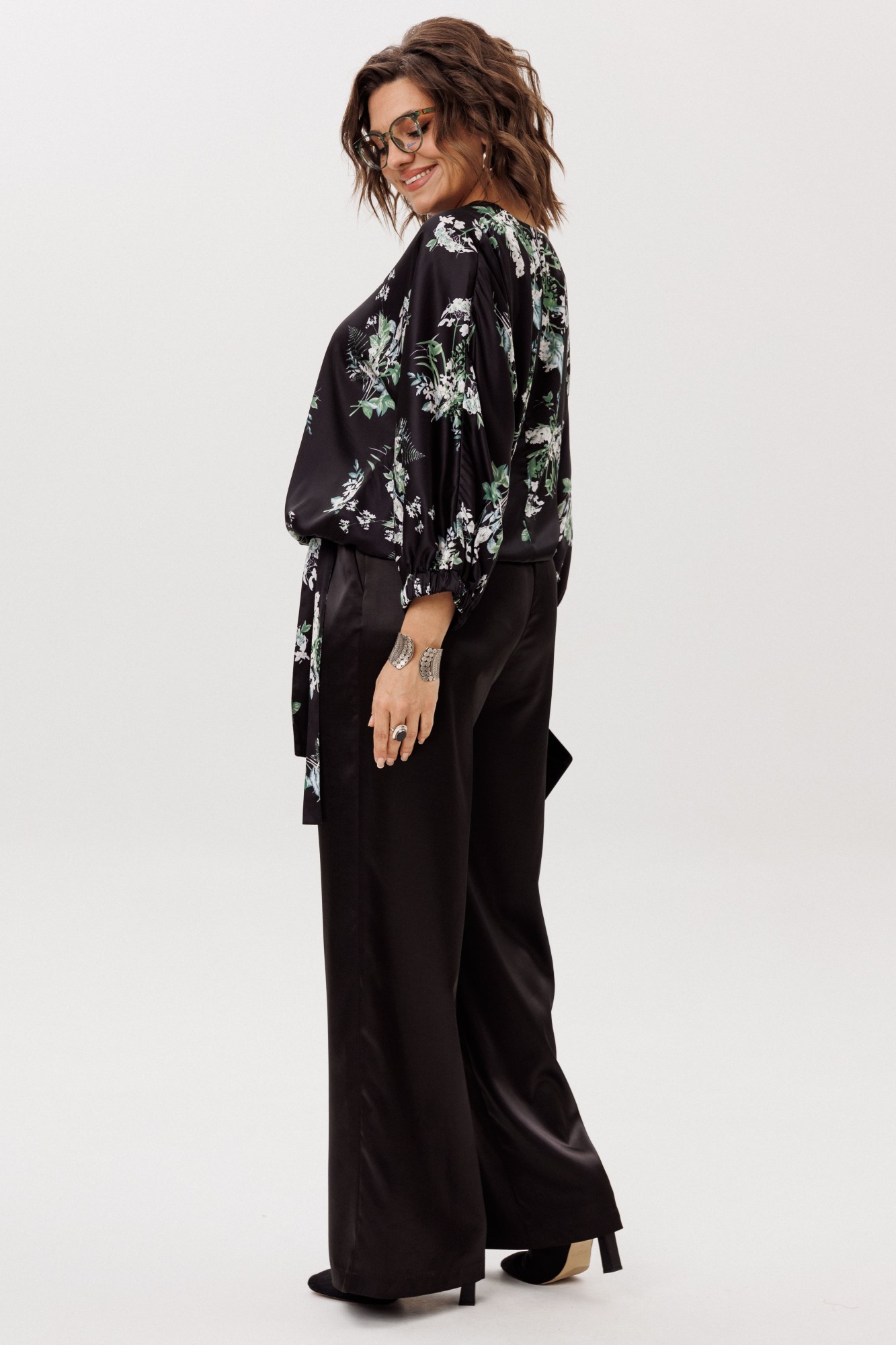 Особую динамику и индивидуальность блузе придают детали: цельнокроеные рукава три четверти подчёркивают целостность и плавность линий, а притачной пояс и манжеты, собранные в нежную сборку благодаря эластичной резинке, создают выразительный контраст с текучестью основной ткани. Эта умная конструкция позволяет вам самостоятельно регулировать длину блузы, творчески преобразуя её силуэт — от парящего и расслабленного до более собранного и чёткого.