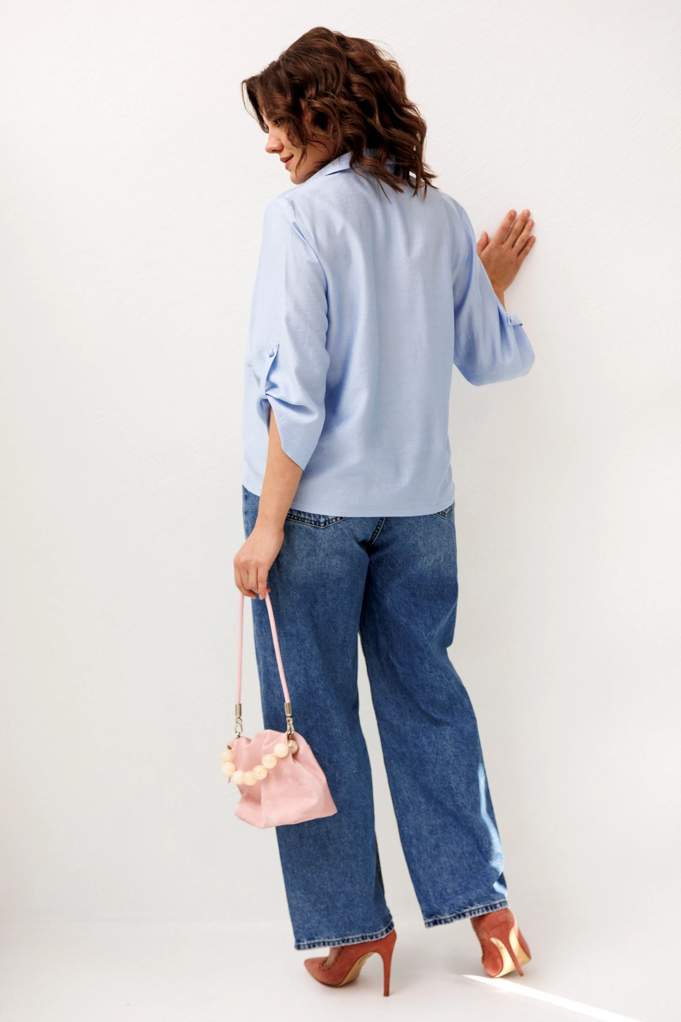 Ассиметричный низ придаёт рубашке современную динамику, а декоративный узел становится деликатным акцентом, который делает образ интересным и живым. Втачной рукав 3/4 с хлястиком добавляет удобства и легкой непринужденности, сохраняя аккуратный вид.
