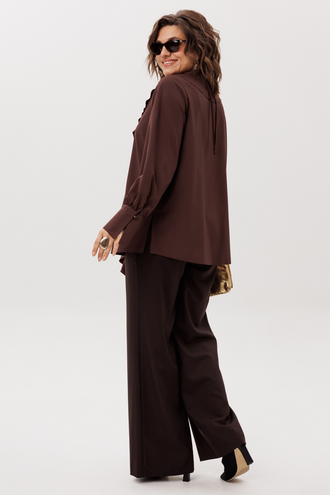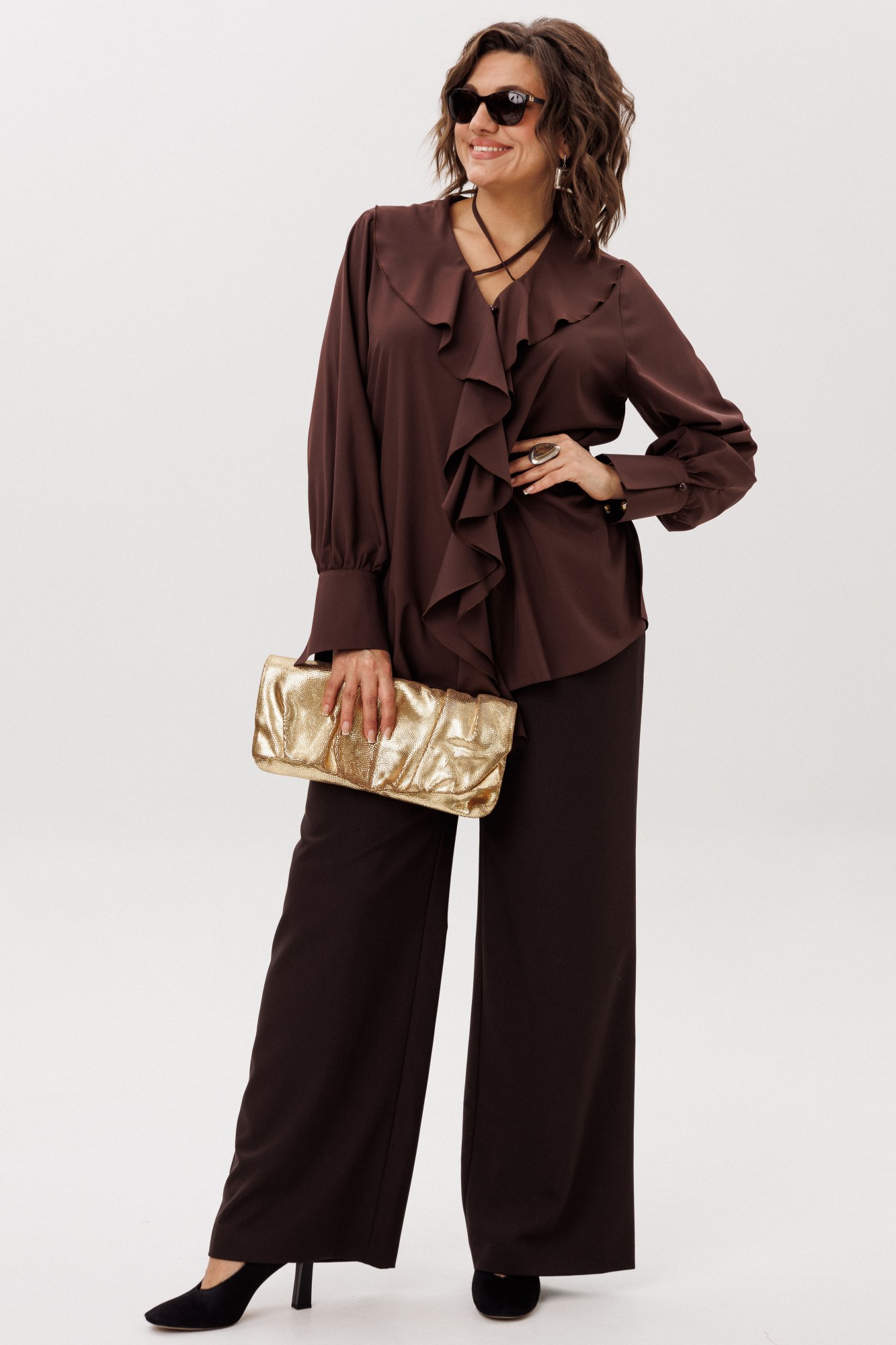Эта блуза от Анелли — воплощение нежной романтики и воздушной лёгкости. Её прямой свободный крой струится мягкими складками, создавая изящный и непринуждённый силуэт, а лёгкая воздушность ткани придаёт образу пленительную невесомость. Глубокий V-образный вырез, украшенный воланами, подчеркивает изысканно-романтичный характер блузы. Эту историю дополняет игра завязок: их можно распустить для непринуждённой элегантности или завязать на шее, чтобы подчеркнуть трогательную женственность. Мягкие сборки на длинных рукавах, переходящие в аккуратные манжеты, и лёгкие разлетающиеся разрезы по бокам завершают картину, делая каждый жест и каждое движение частью изящного и мечтательного стиля. На модели брюки 1702.