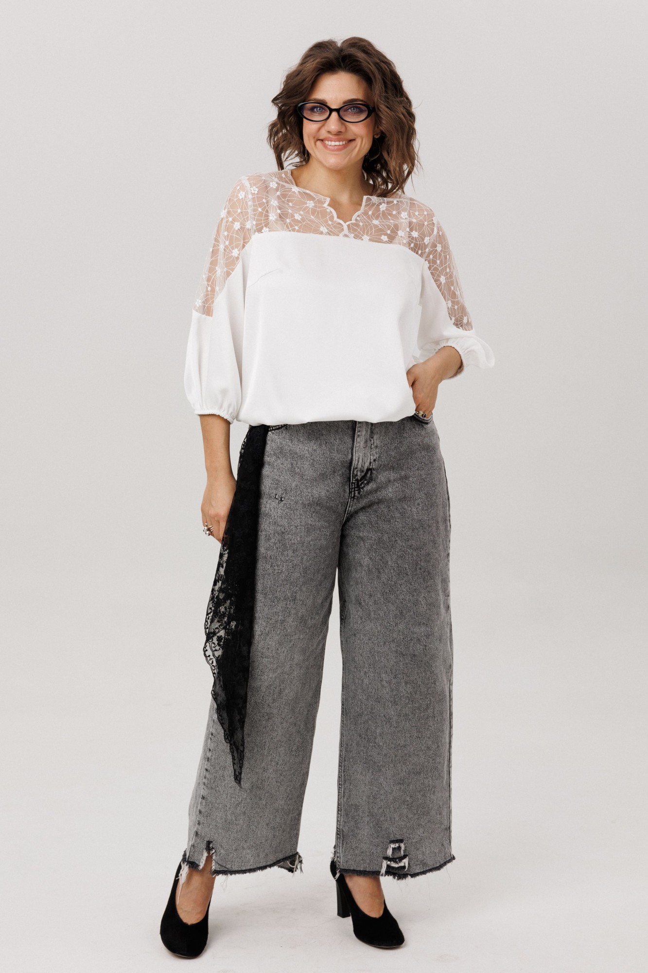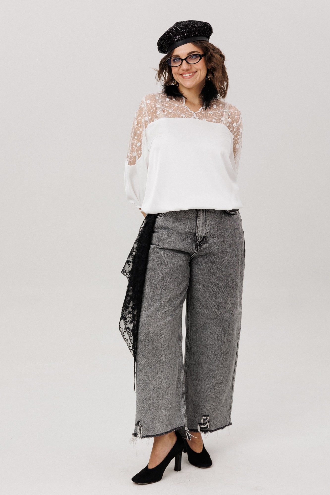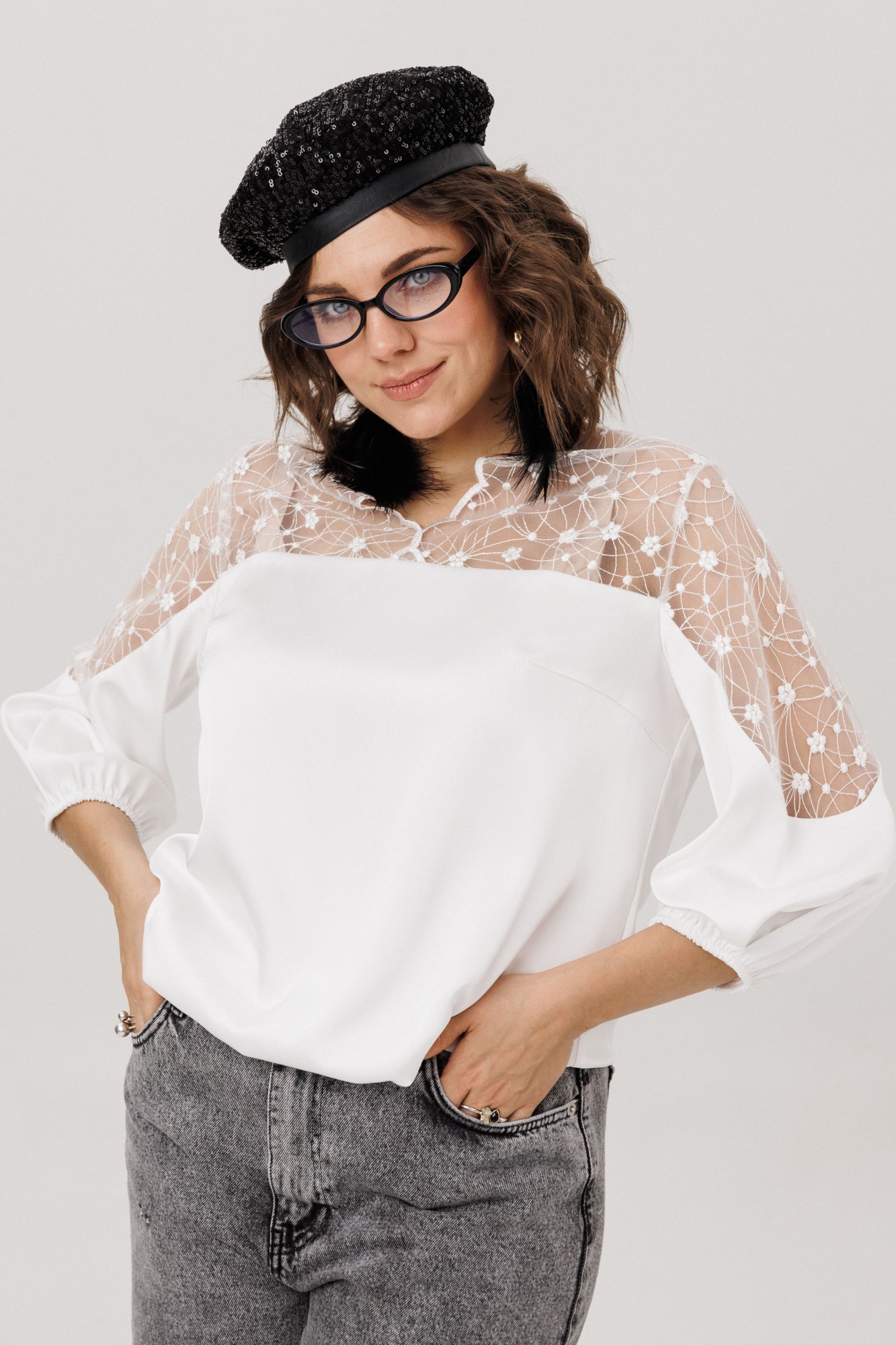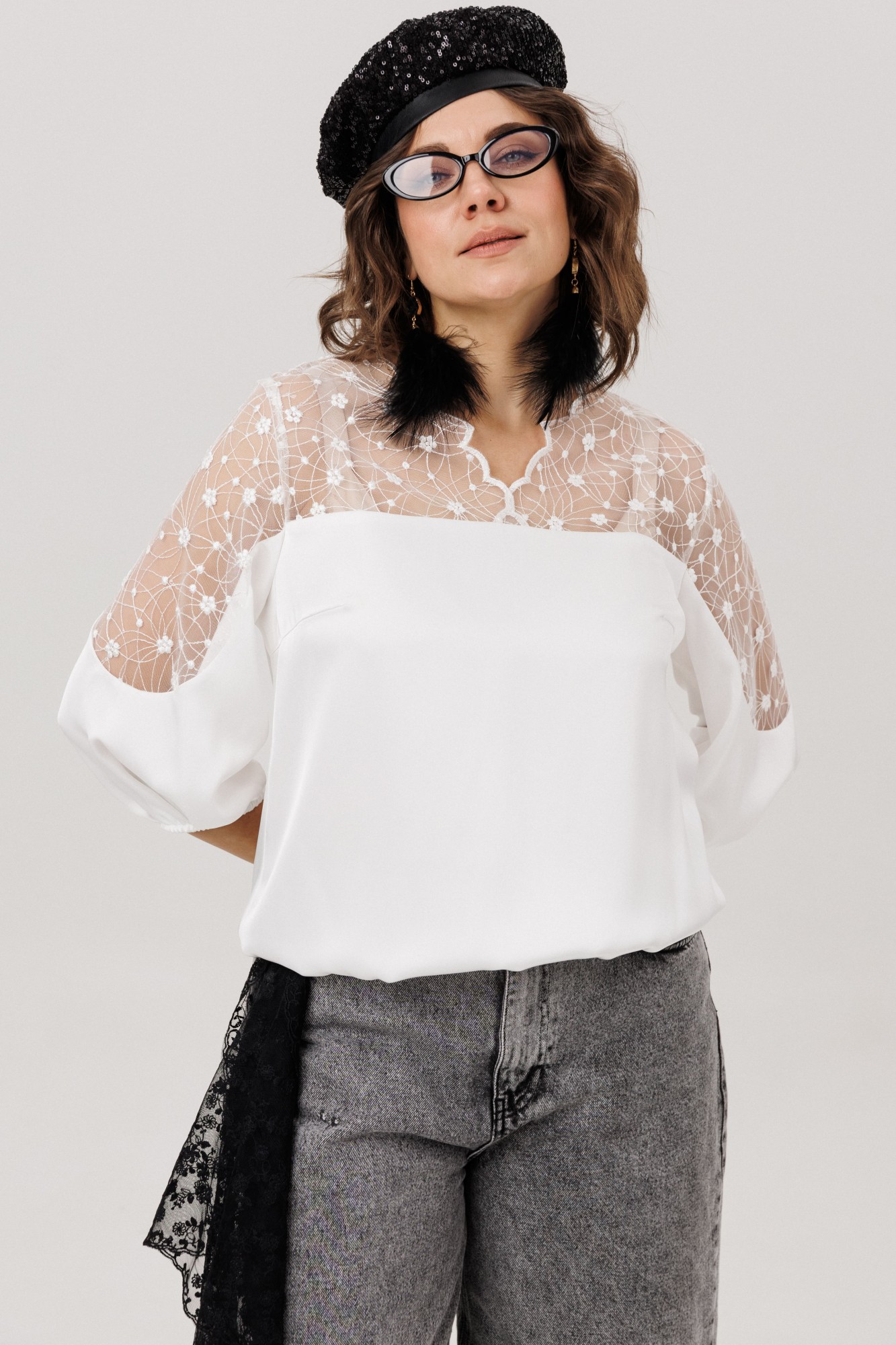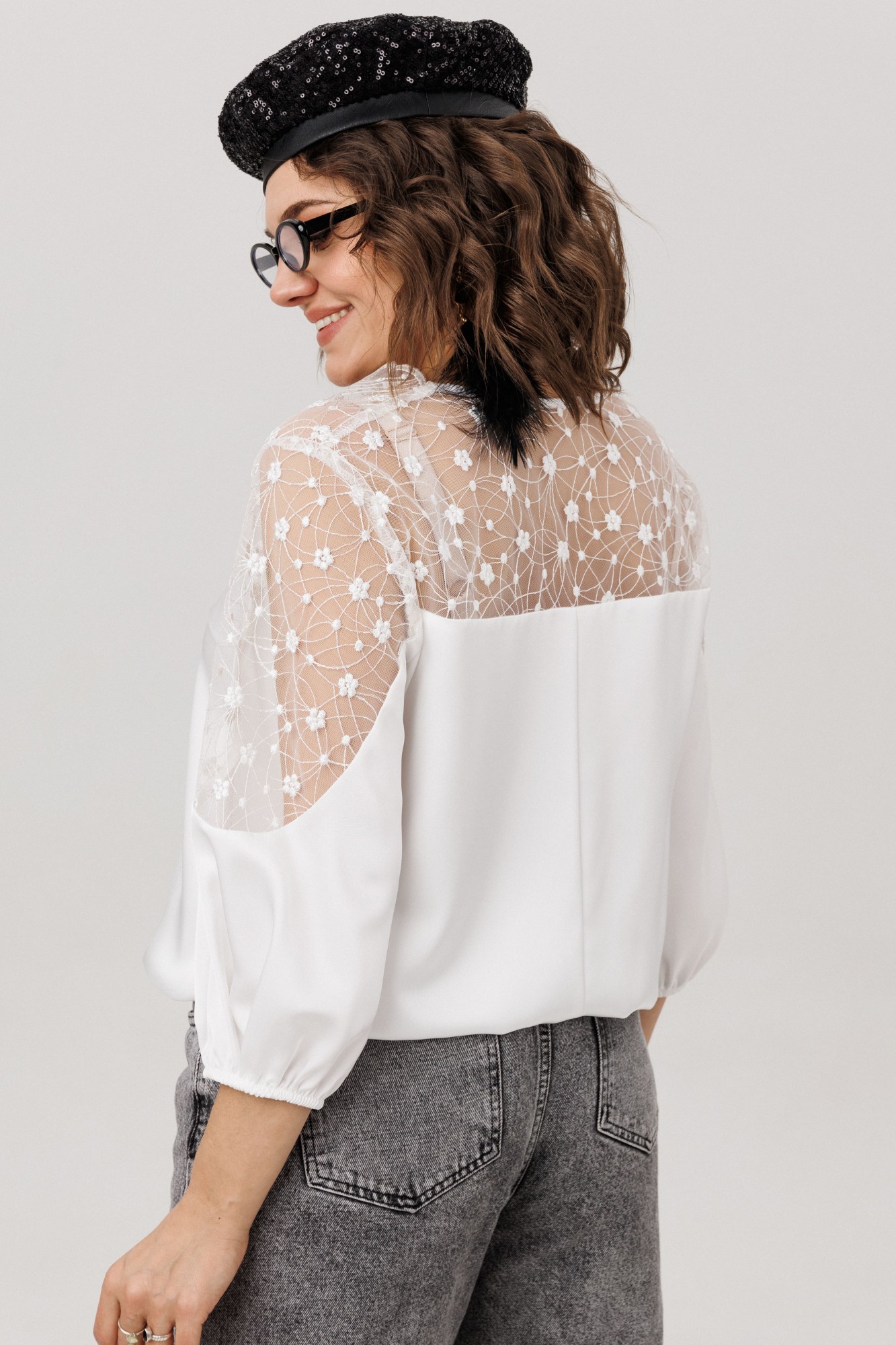 Верхняя часть, словно лёгкое кружевное облако с изысканными кокетками на полочке, спинке и изящными вставками на рукавах, переходит в благородный гладкий атлас, мерцающий приглушённым блеском. Рукава три четверти, собранные у низа на тонкую резинку, и такой же аккуратный низ самой блузы создают мягкие, едва уловимые волны, добавляя образу воздушности и динамики.