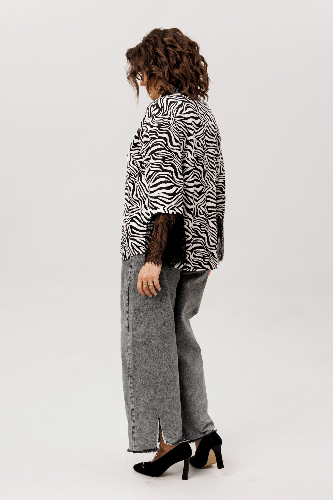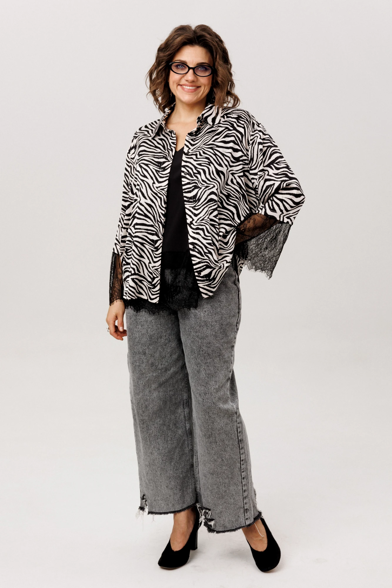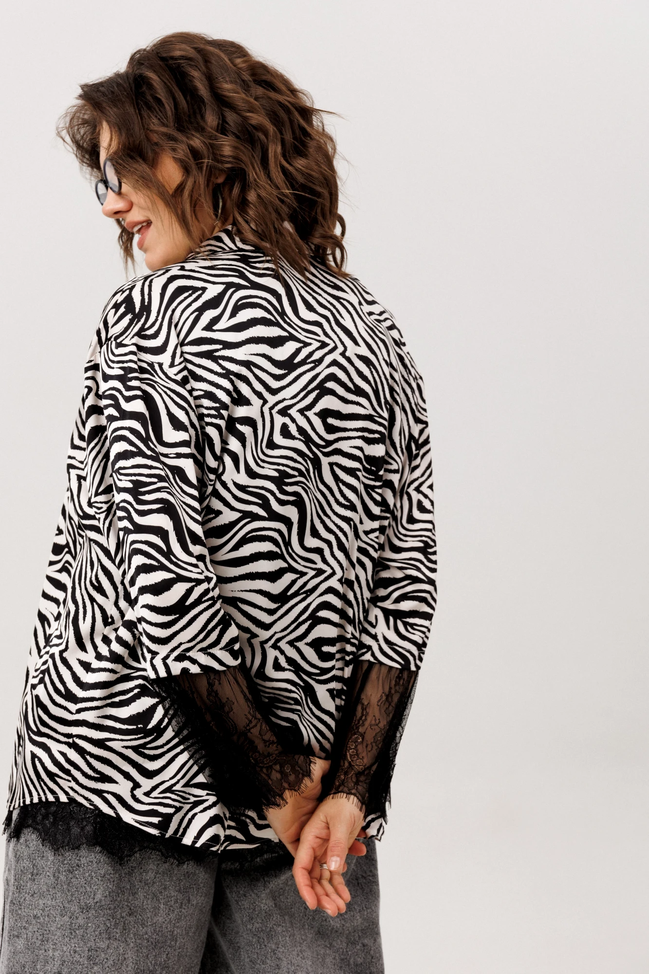 Роскошная рубашка от Анелли с фигурным низом в цвете «зебра». Мягкое спущенное плечо задаёт плавный ритм всему силуэту, а отложной воротник и идеально скрытая застёжка на пуговицах говорят о внимании к деталям.