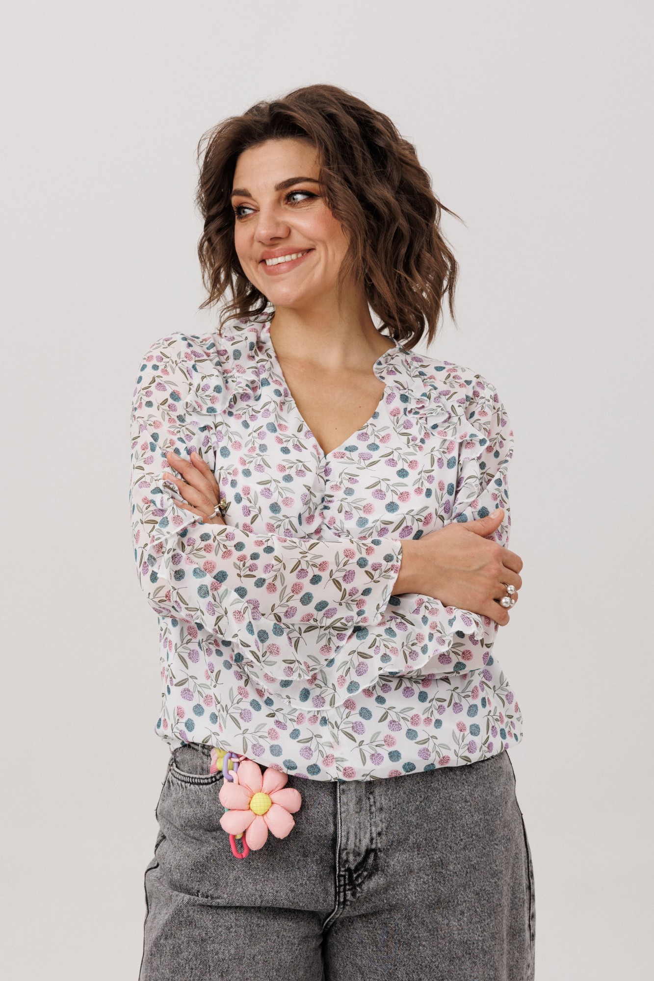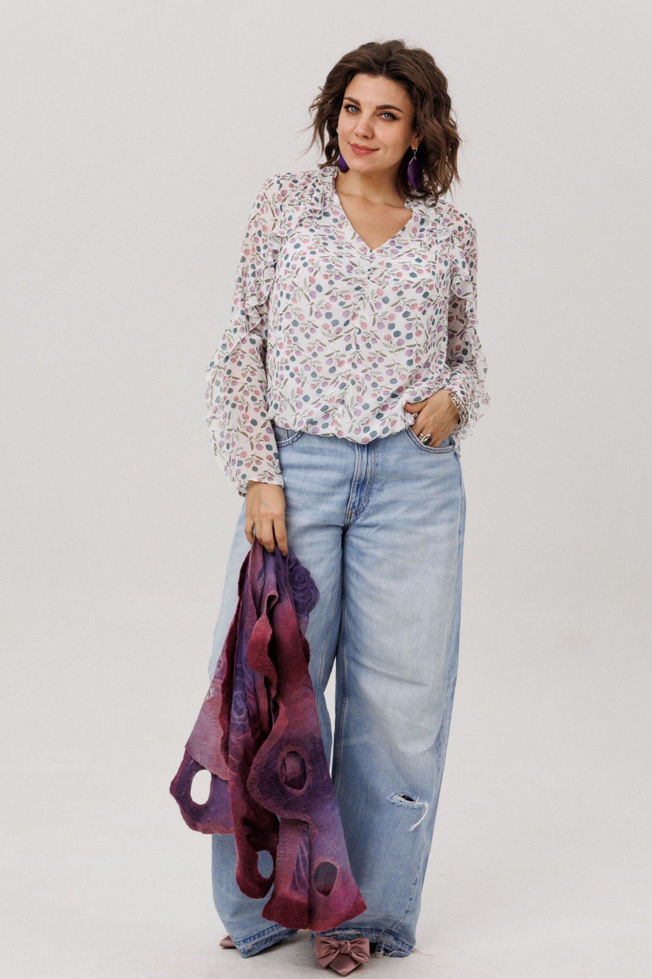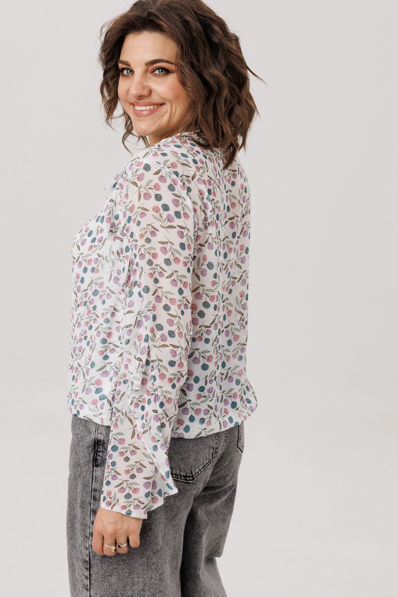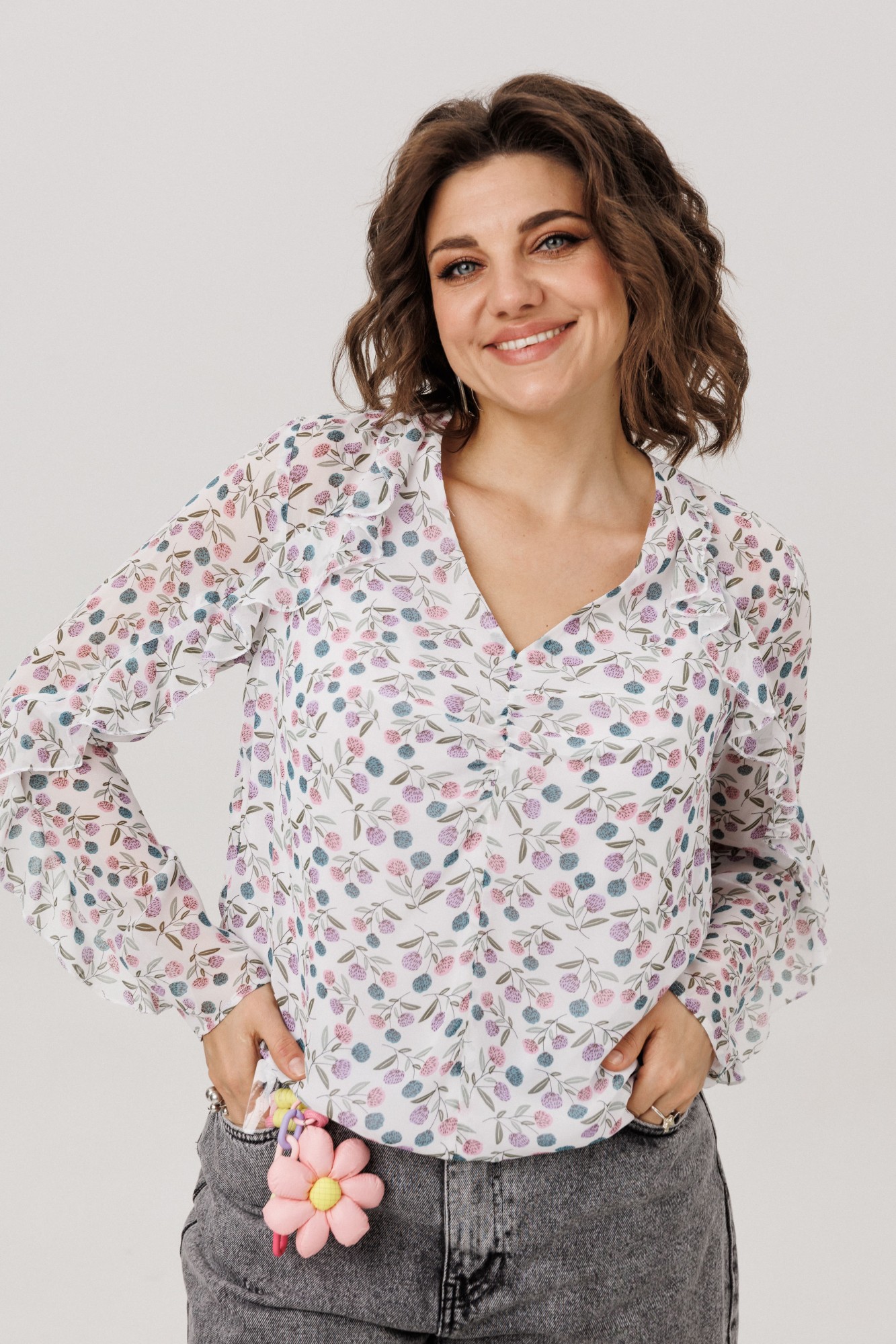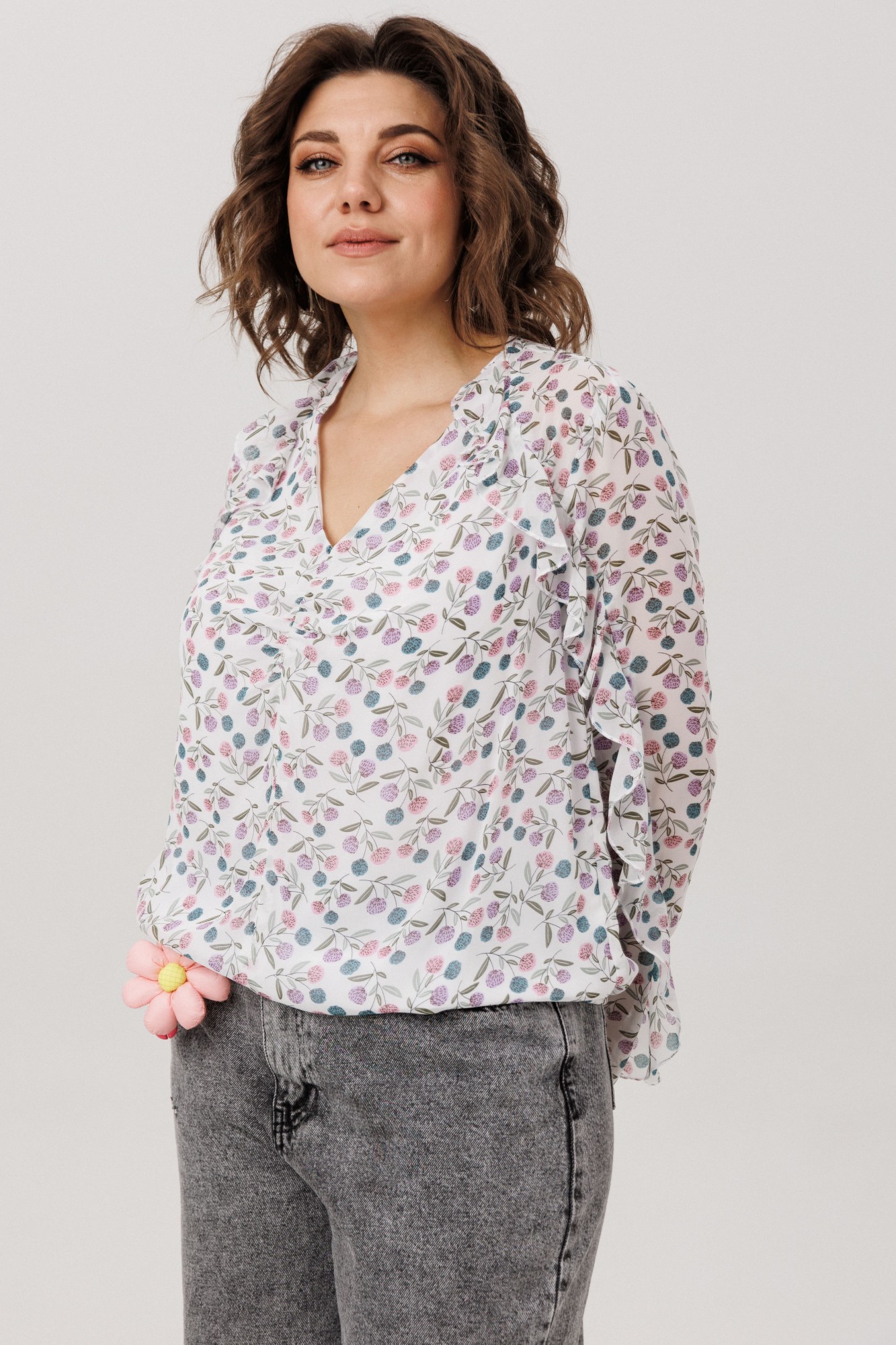 Окутанная лёгкостью воздушного шифона с пленительным принтом «клевер», эта блуза становится воплощением нежной элегантности. Её прямой силуэт, струящийся вдоль фигуры, украшен едва уловимыми сборками у груди, добавляющими мягкий объём. Главная мелодия образа - волнующий волан, что, будто случайный шёпот, рождается у самой горловины и, следуя изгибу кокетки, закручивается вокруг рукава нежной спиралью, полной романтики. Глубокий V-образный вырез подчёркивает изящество линий, а скрытая подкладка по переду и резинка по низу дарят комфорт, делая эту блузу от Анелли идеальным спутником для создания лёгкого и вдохновенного образа на каждый день. Она столь же уместна для романтической городской прогулки и для неспешного бранча в уютной кофейне. Эта вещь преобразит строгий офисный лук, смягчив его нежной спиралью волана, и станет изысканным выбором для свидания, когда каждое движение будет отмечено воздушной игрой ткани.