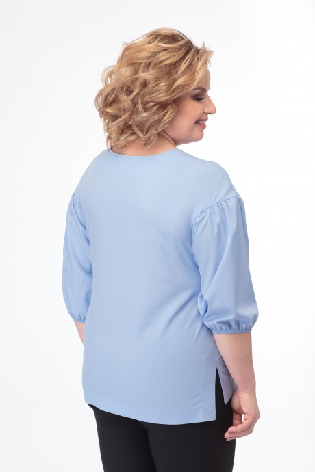 По переду выполнены нагрудные вытачки, линия плеча удлинена, что обеспечивает отличную посадку на любой фигуре, рукава свободные, укороченные, кокетливо присобраны вверху, по низу собраны на резинку.