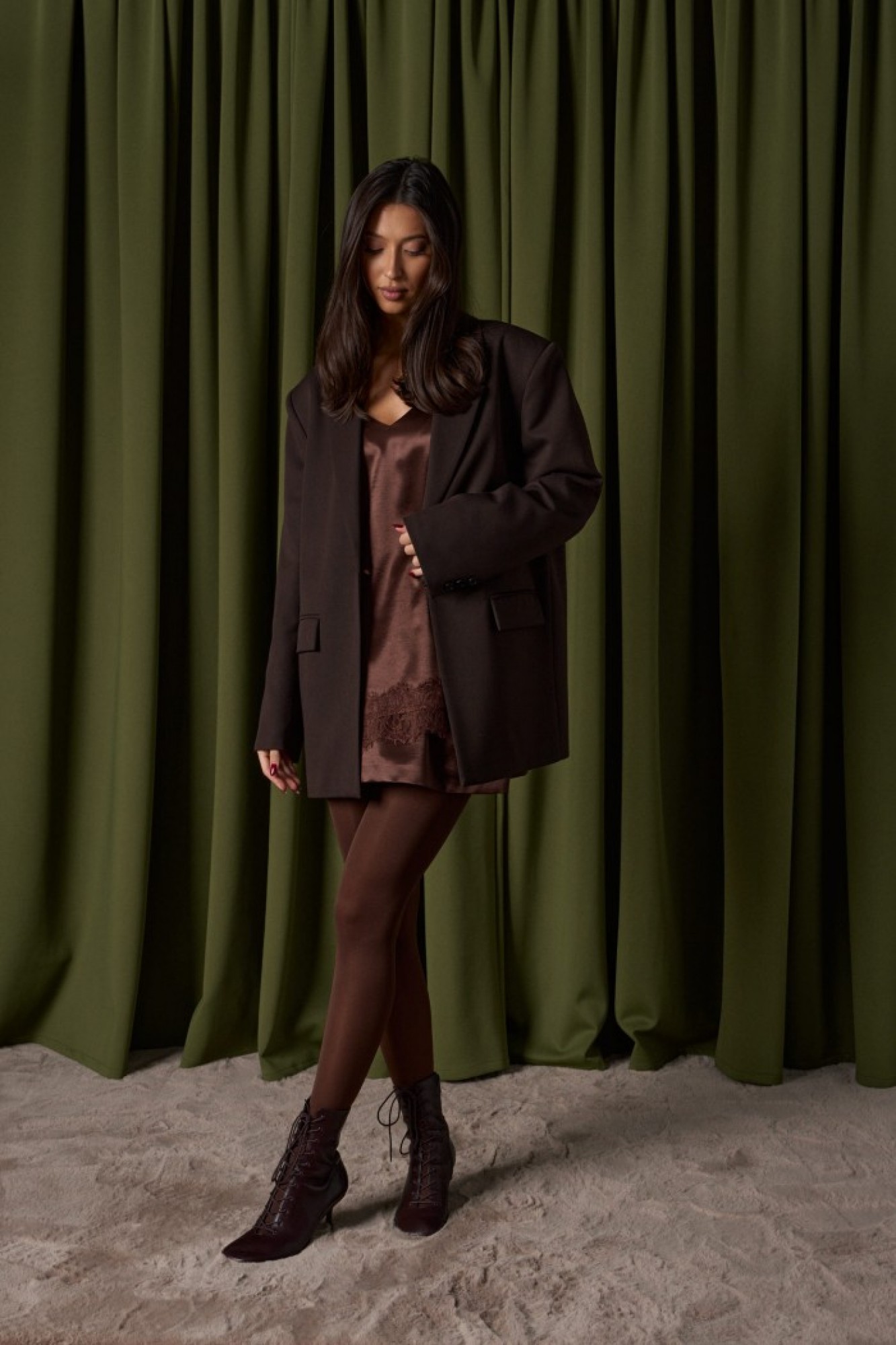 Блузон в крое трапеция, выполнен из струящейся ткани коричневого цвета. Характеристика: крой трапеция - расширяется к низу, широкие бретели, спереди v-образный вырез, по спинке овальная горловина, спинка изделия чуть удлинена, по низу изделия пришито кружево.