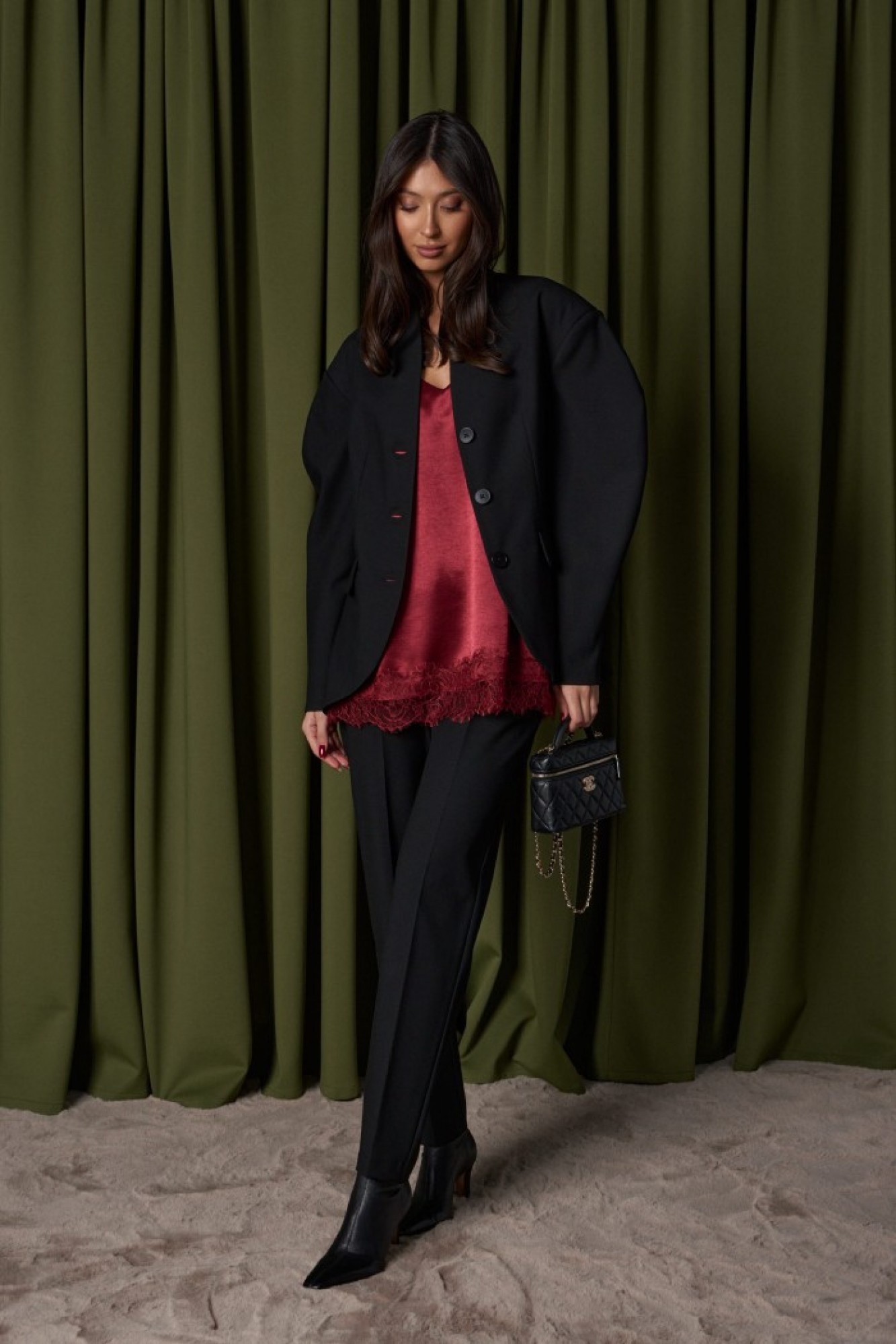 Блузон в крое трапеция, выполнен из струящейся ткани бордового цвета. Характеристика: крой трапеция - расширяется к низу, широкие бретели, спереди v-образный вырез, по спинке овальная горловина, спинка изделия чуть удлинена, по низу изделия пришито кружево.