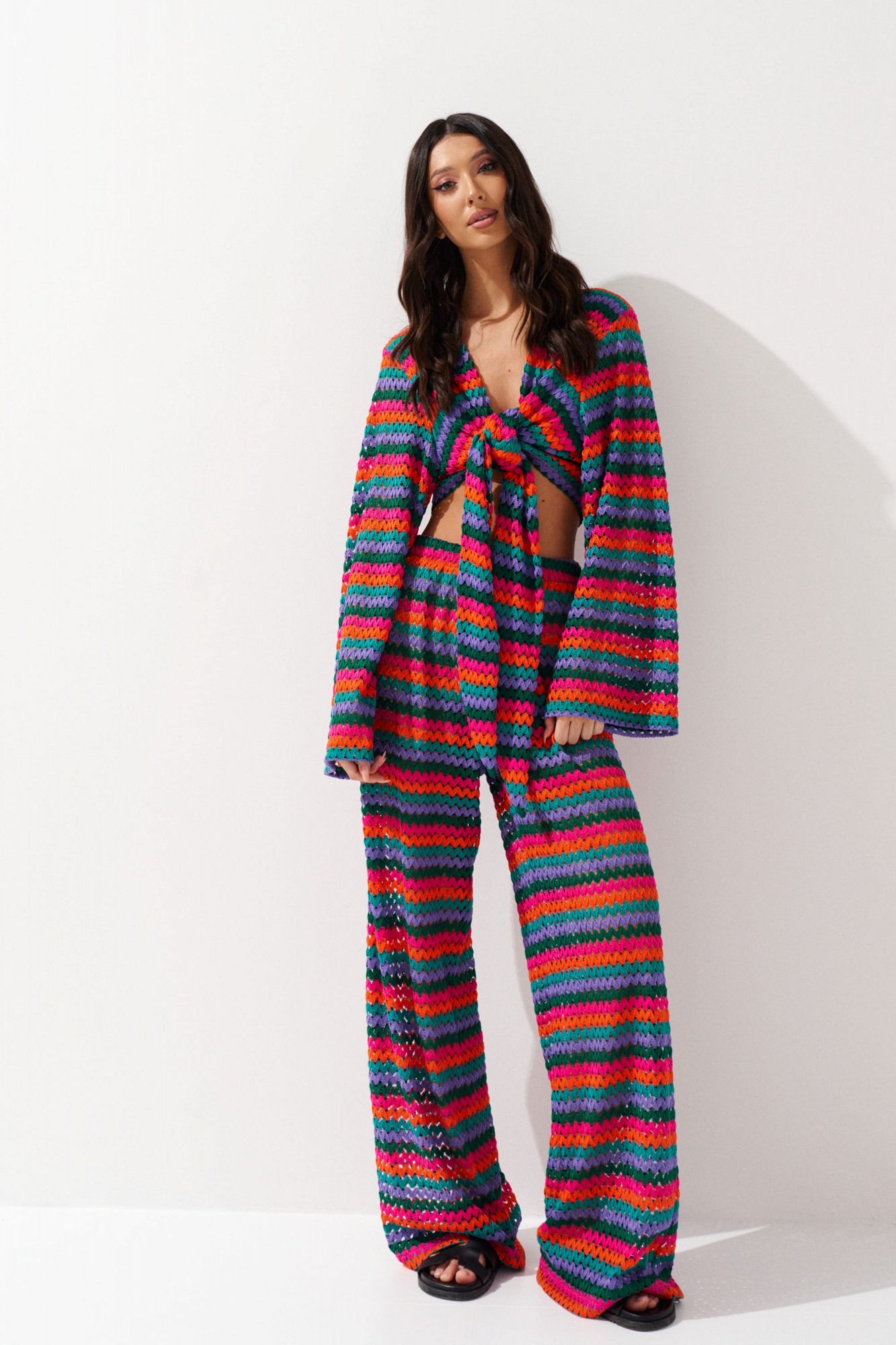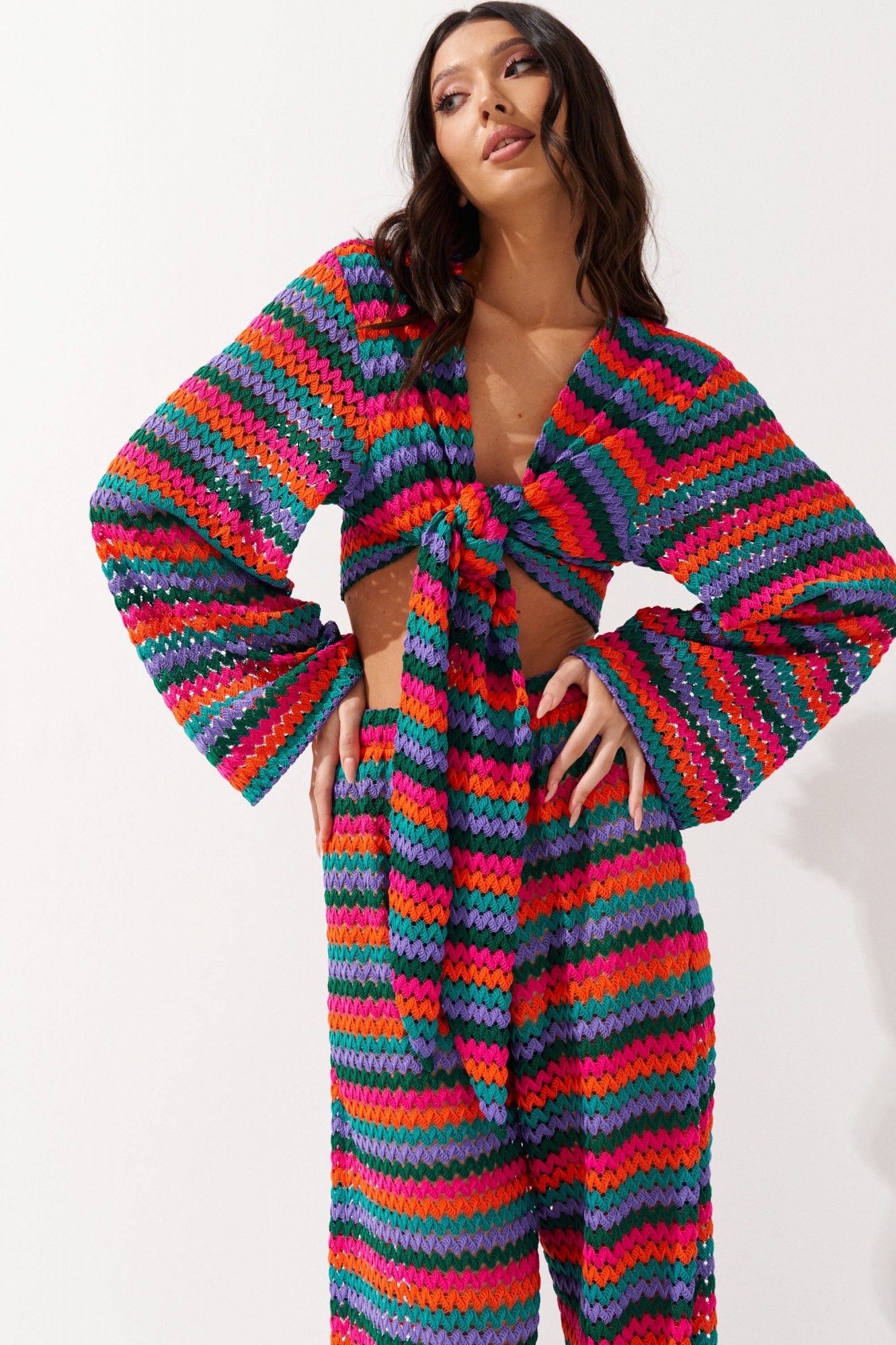 Рубашка прямого кроя с цельнокроеными удлиненными завязками выполнена из полотна ажурной вязки разных ярких цветов.