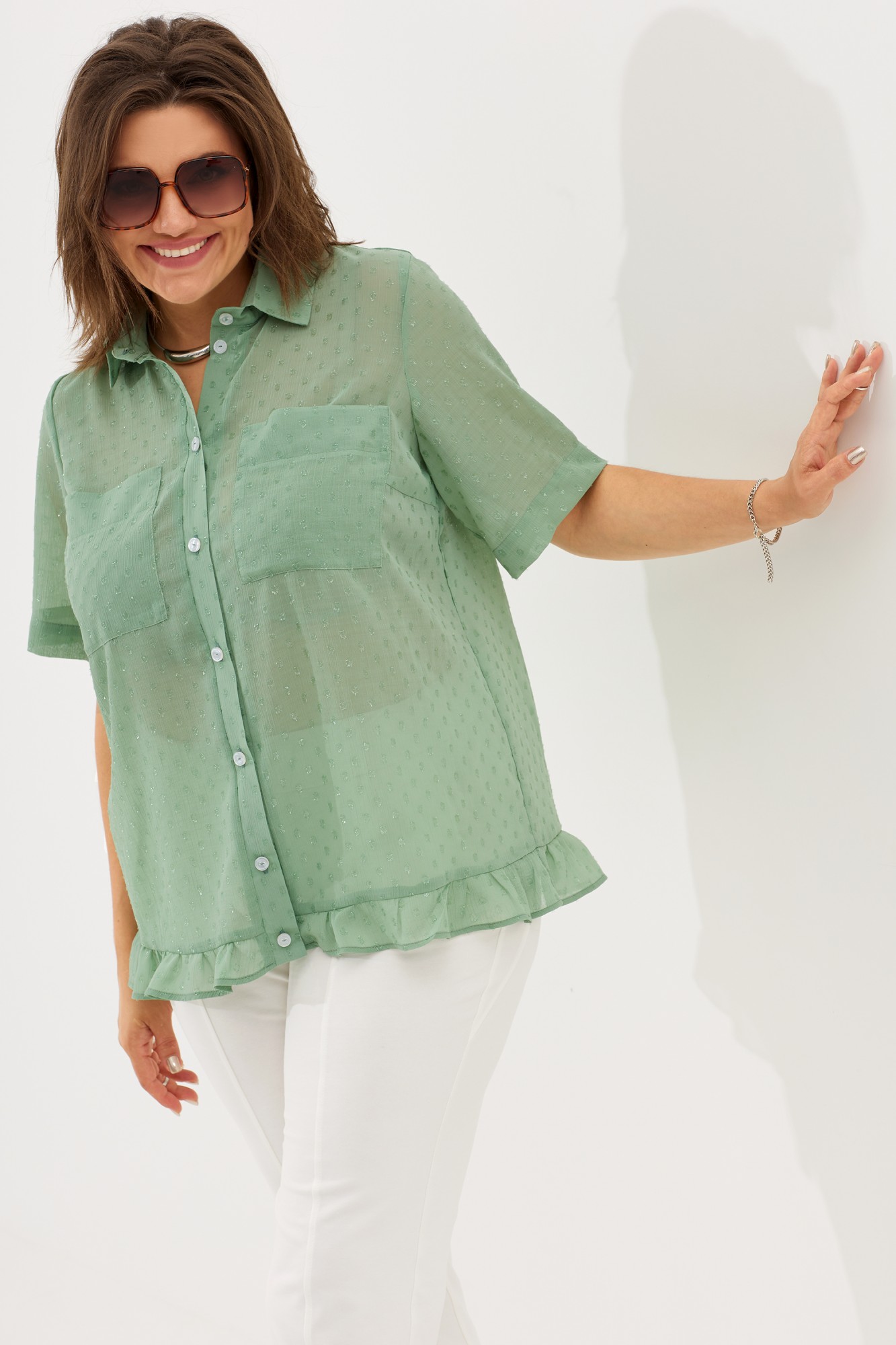 Лёгкая шифоновая блуза прямого кроя идеальна для летнего периода. Отлично подойдет как для офисного стиля, так и для повседневного. Ткань нежная, струящаяся, с оригинальным фактурным рисунком из вплетенных нитей. Лёгкий и воздушный материал с эффектом жатки, преимуществом которого является то, что он не мнётся. Лекала выполнены таким образом, что позволяют модели «сидеть» идеально и скрыть все недостатки фигуры. Перед имеет застёжку на петли-пуговицы, а так же декорирован настрочными карманами в области нагрудных вытачек. Воротник втачной, классический, рубашечного типа. Рукав втачной, низ которого обработан в подгибку. Блуза идеально подойдёт как для повседневных образов, так и для особых случаев, добавляя шарм и изысканность в любой обстановке. На фото представлены брюки арт. 6045.