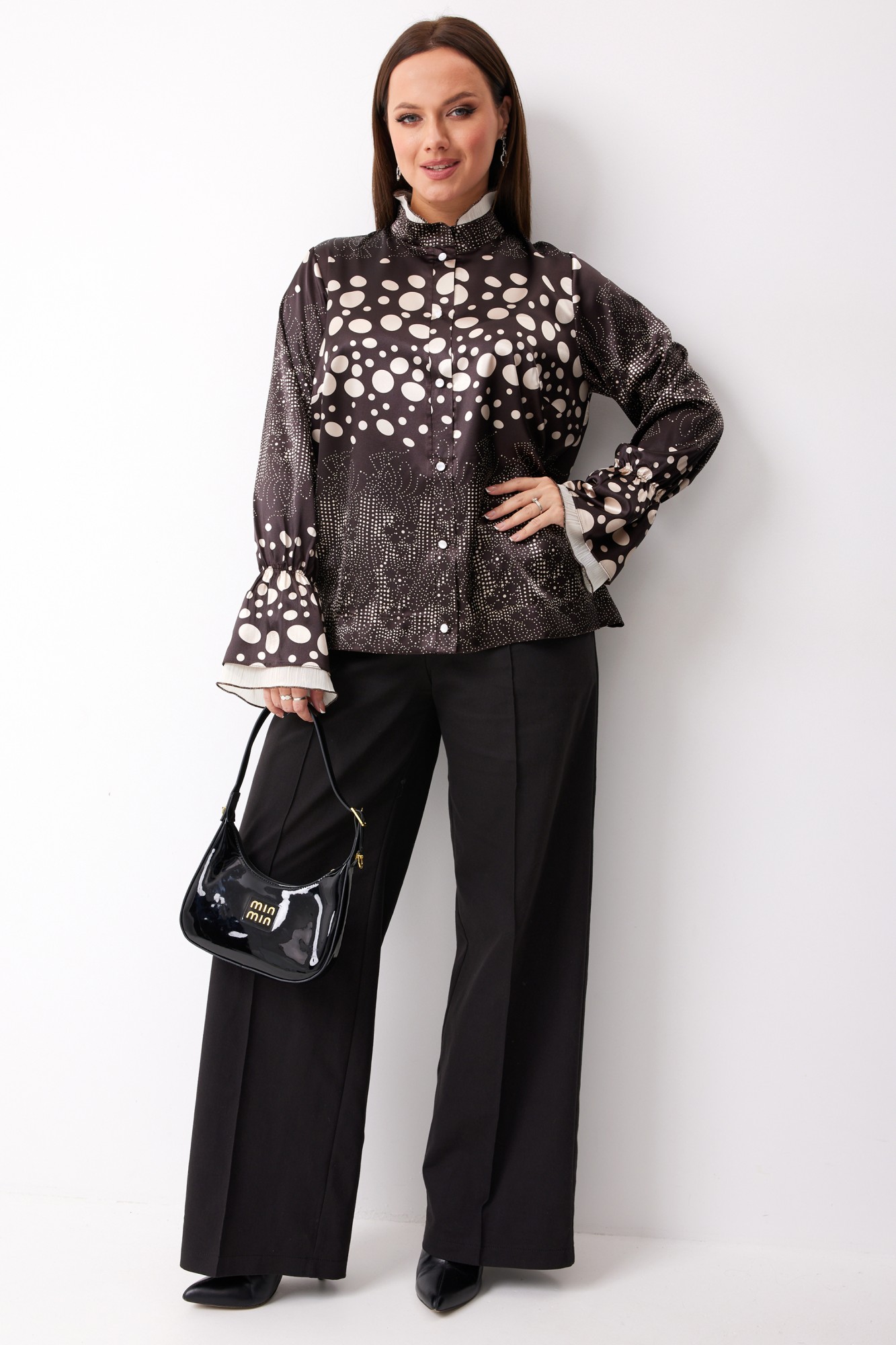 Если Вы мечтаете о блузе, которая подчеркнёт Вашу женственность и добавит образу элегантность, у нас есть готовое решение! Эта блуза из мягкой ткани с переливом в глубоком шоколадном цвете с нежной шифоновой отделкой – именно то, что Вам нужно! Мягкий блеск роскошной ткани, изящные элементы отделки придают Вашему образу утончённость и лоск во время вечернего выхода, деловой встречи либо отдыха с друзьями в любимом кафе.