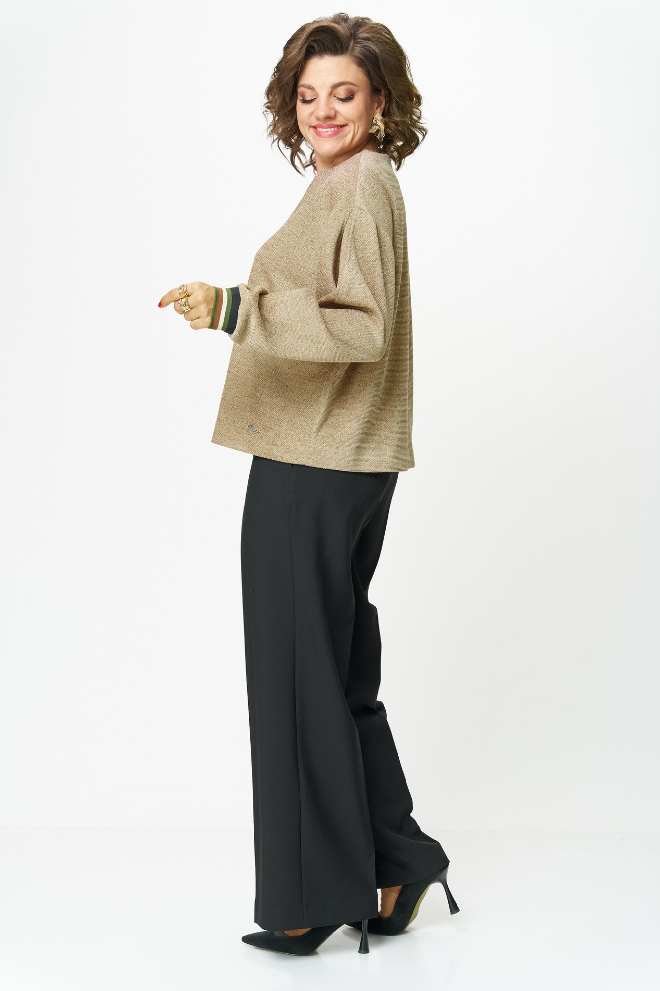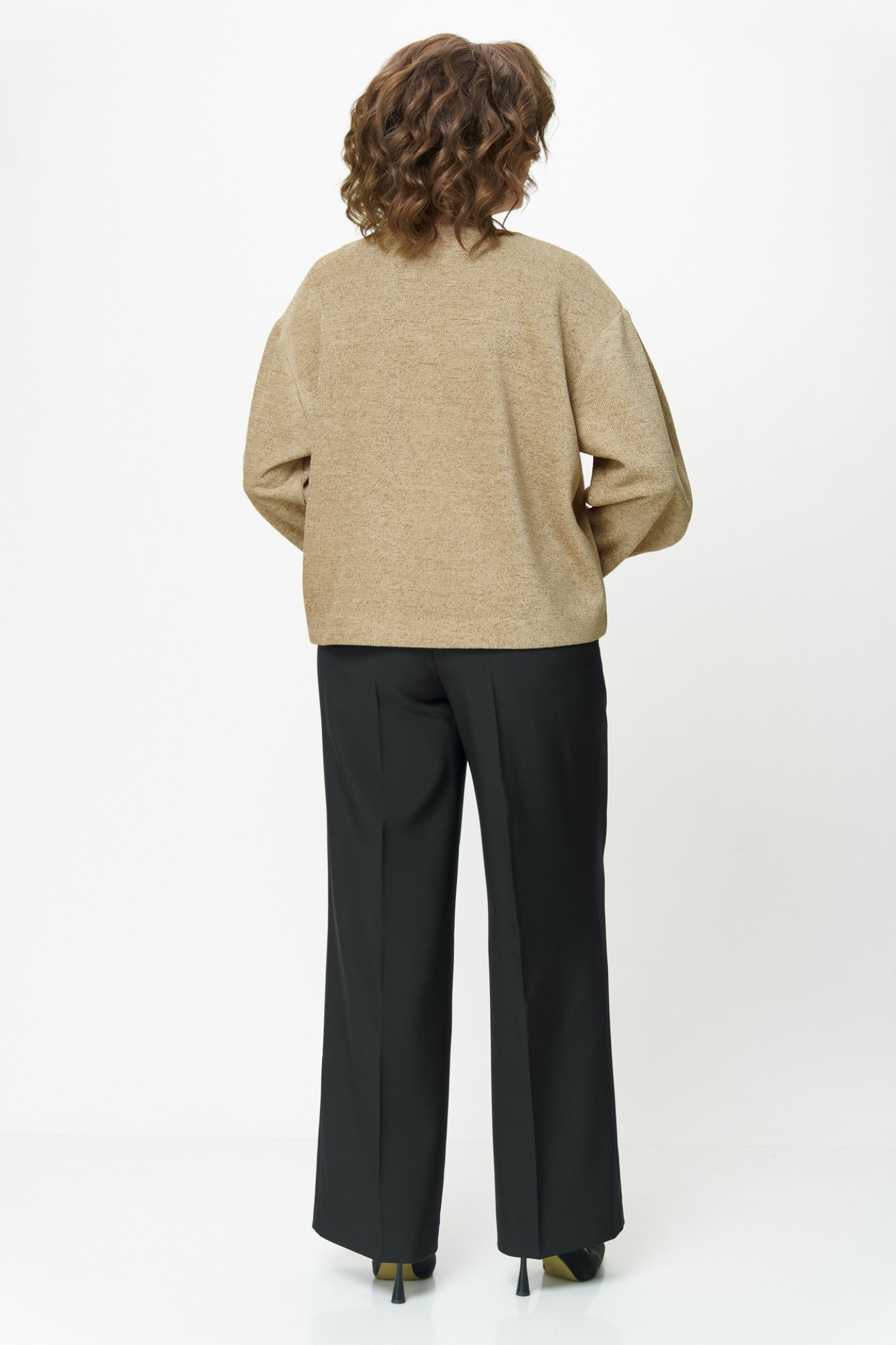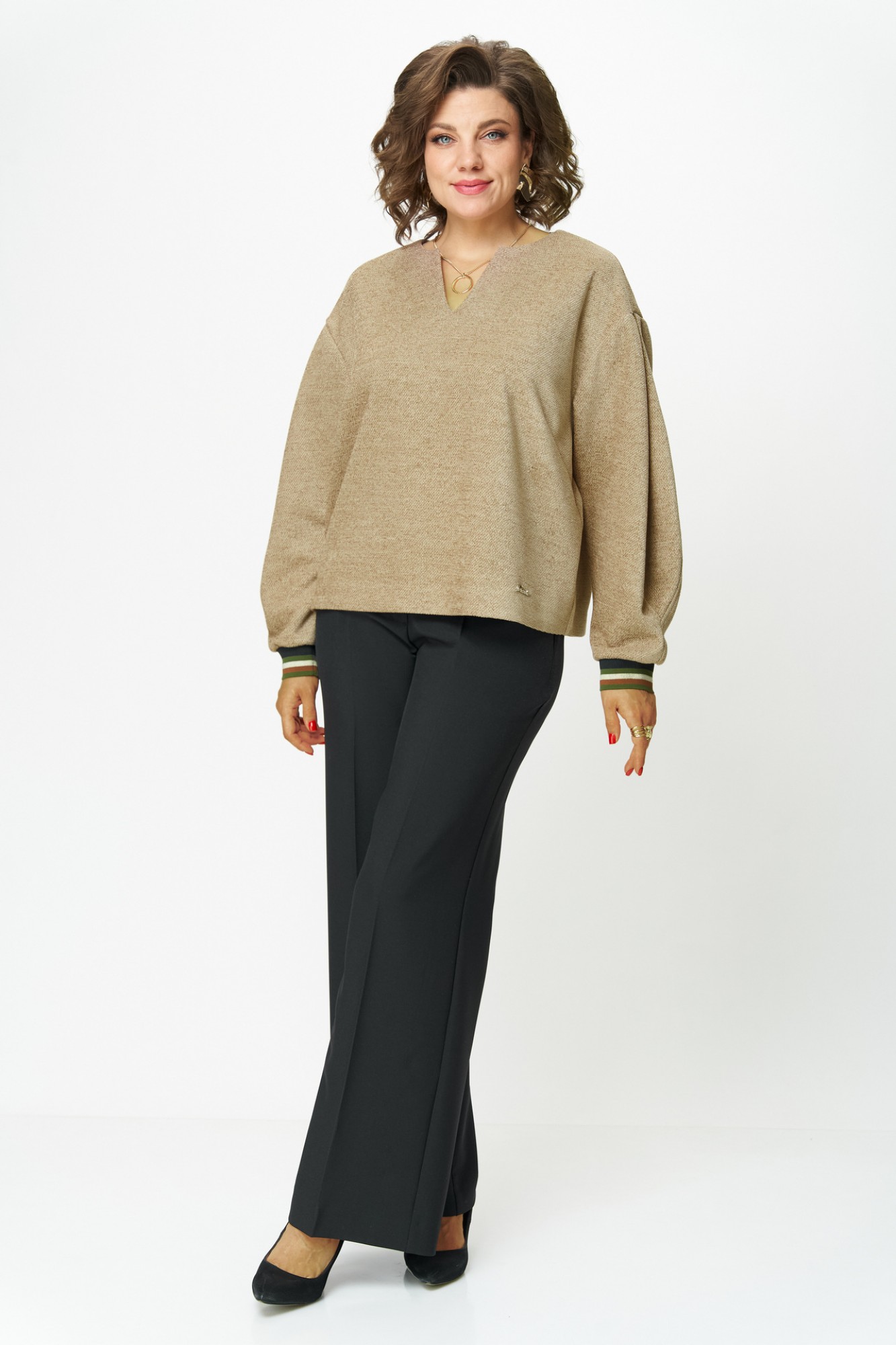 Блуза, свободного силуэта, из трикотажной ткани, вырез горловины V-образный, рукав немного спущенный, фигурный, спинка цельная.