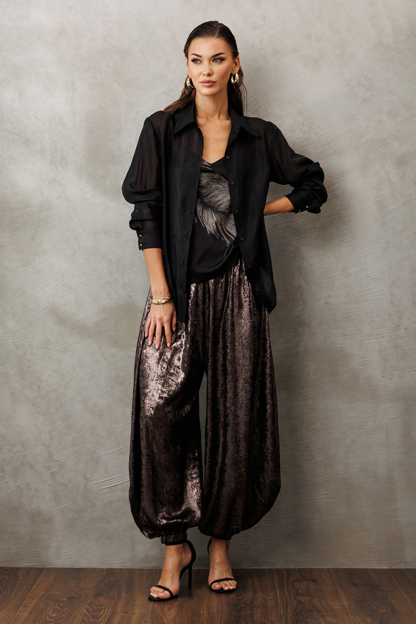 Блузка из креп-шифона с напылением. Прямого силуэта, с втачным рукавом внизу на манжете с застежкой на петли пуговицы. Полочка с центральной застежкой на петли-пуговицы на цельнокроеной планке. Воротник рубашечный отложной на стойке. Спинка и полочка с фигурным низом. Внизу по боковым швам обработаны разрезы.