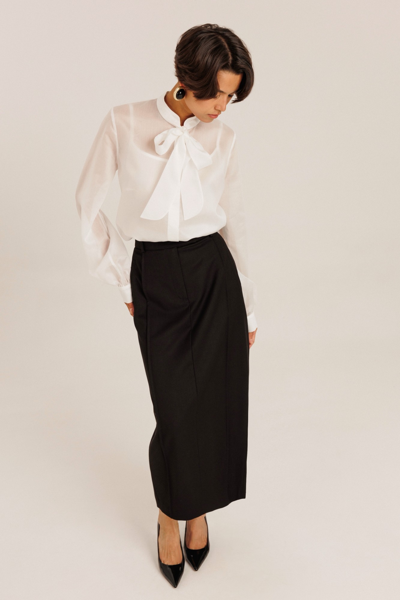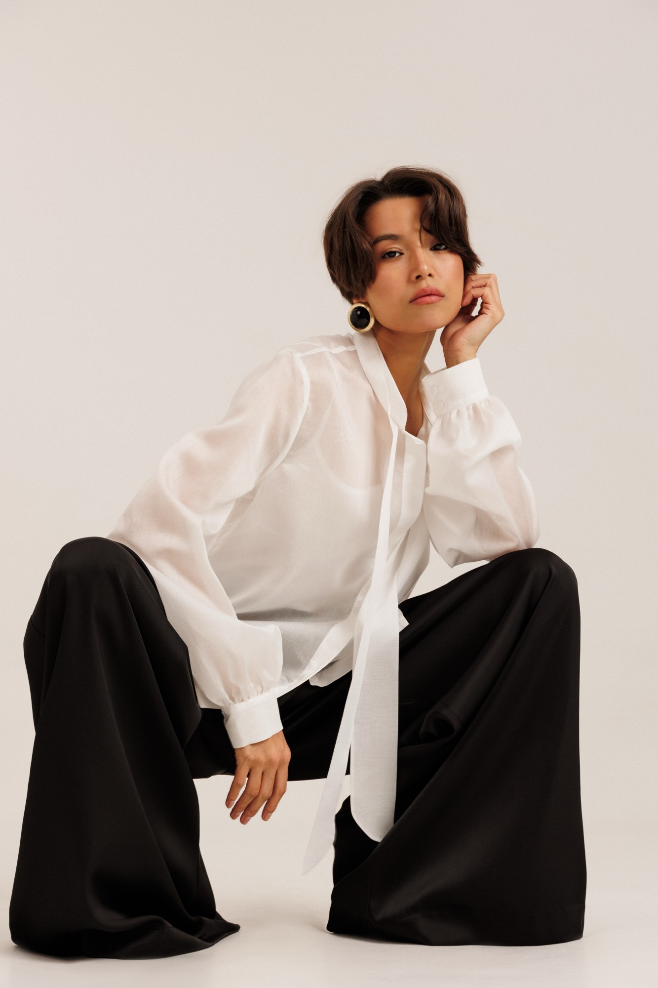 Блузка женская выполнена из полупрозрачного лиоцела. По горловине изделия выполнена стойка. Рукав длинный. Застежка потайная на пуговицах. В комплекте с блузкой идет топ на регулируемых бретелях.