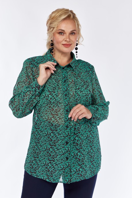 Блуза прямого силуэта из принтованной ткани. По центру полочки застежка в виде планки на миниатюрные пуговицы, что служит декоративным элементом изделия. Полочки с накладными карманами. Воротник стояче-отложной, рукав втачной, внизу обработан притачной манжетой. Спинка с отрезной кокеткой, и встречной складкой, для повышенной комфортности. В боковых швах небольшие разрезы.