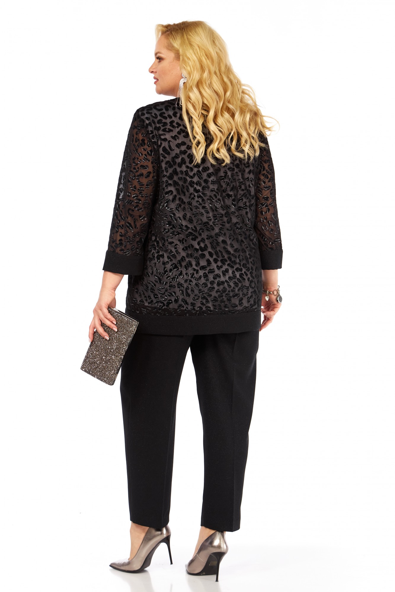 Блузка полуприлегающего силуэта выполнена из легкого шифона с дизайнерским флоком на контрастной подкладке. Горловина округлой формы. Полочка с нагрудными вытачками. Рукав втачной, свободный 7/8. В боковых швах предусмотрены разрезы.