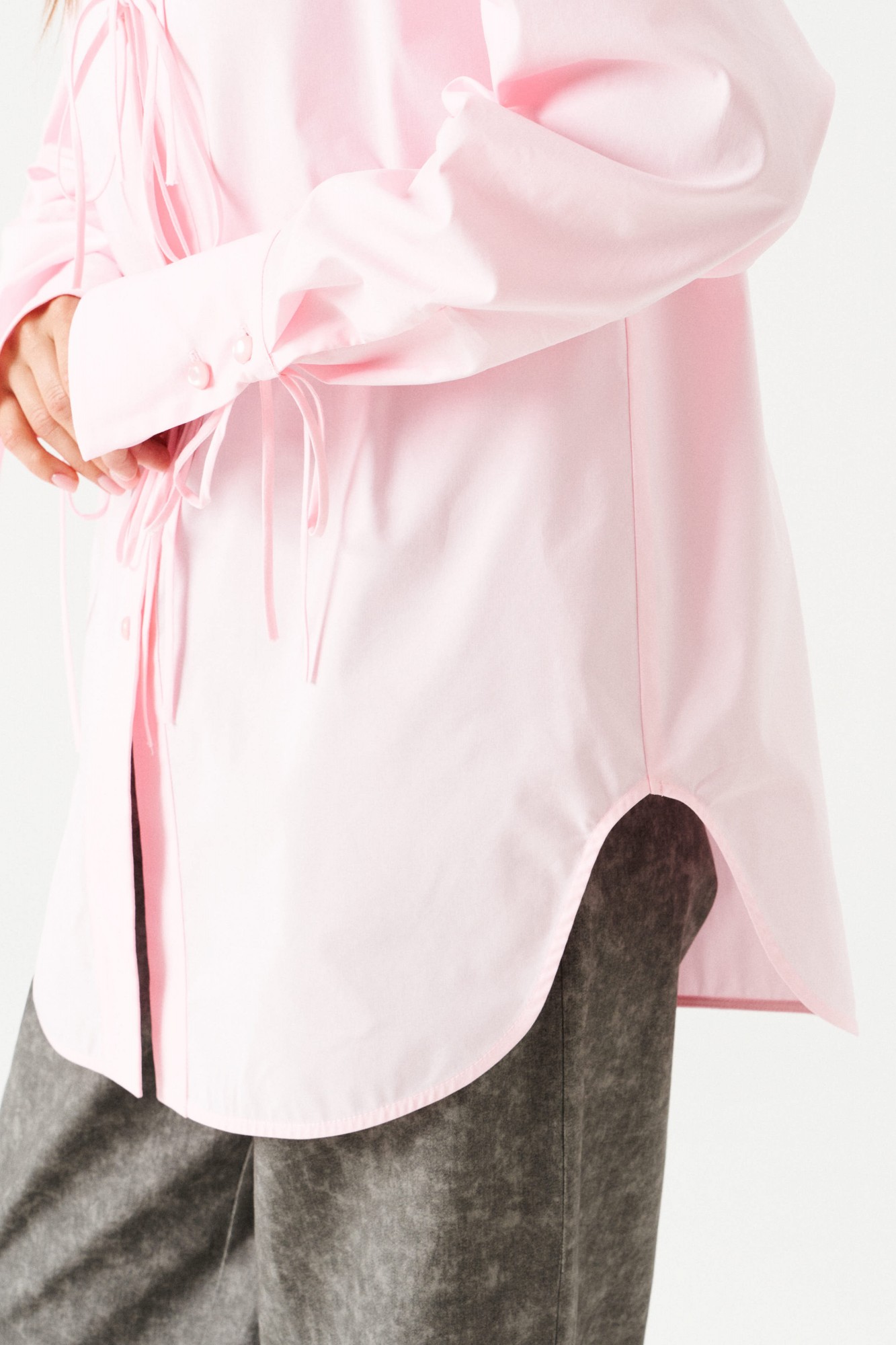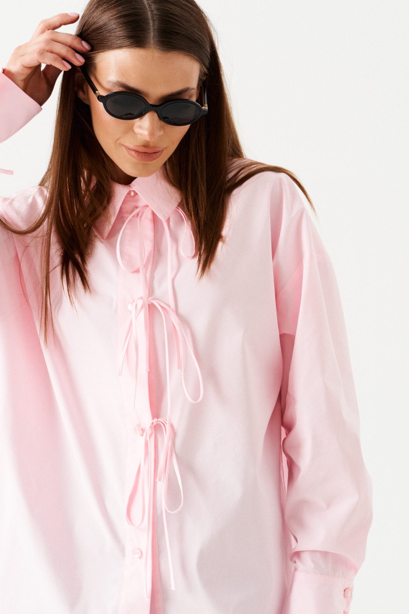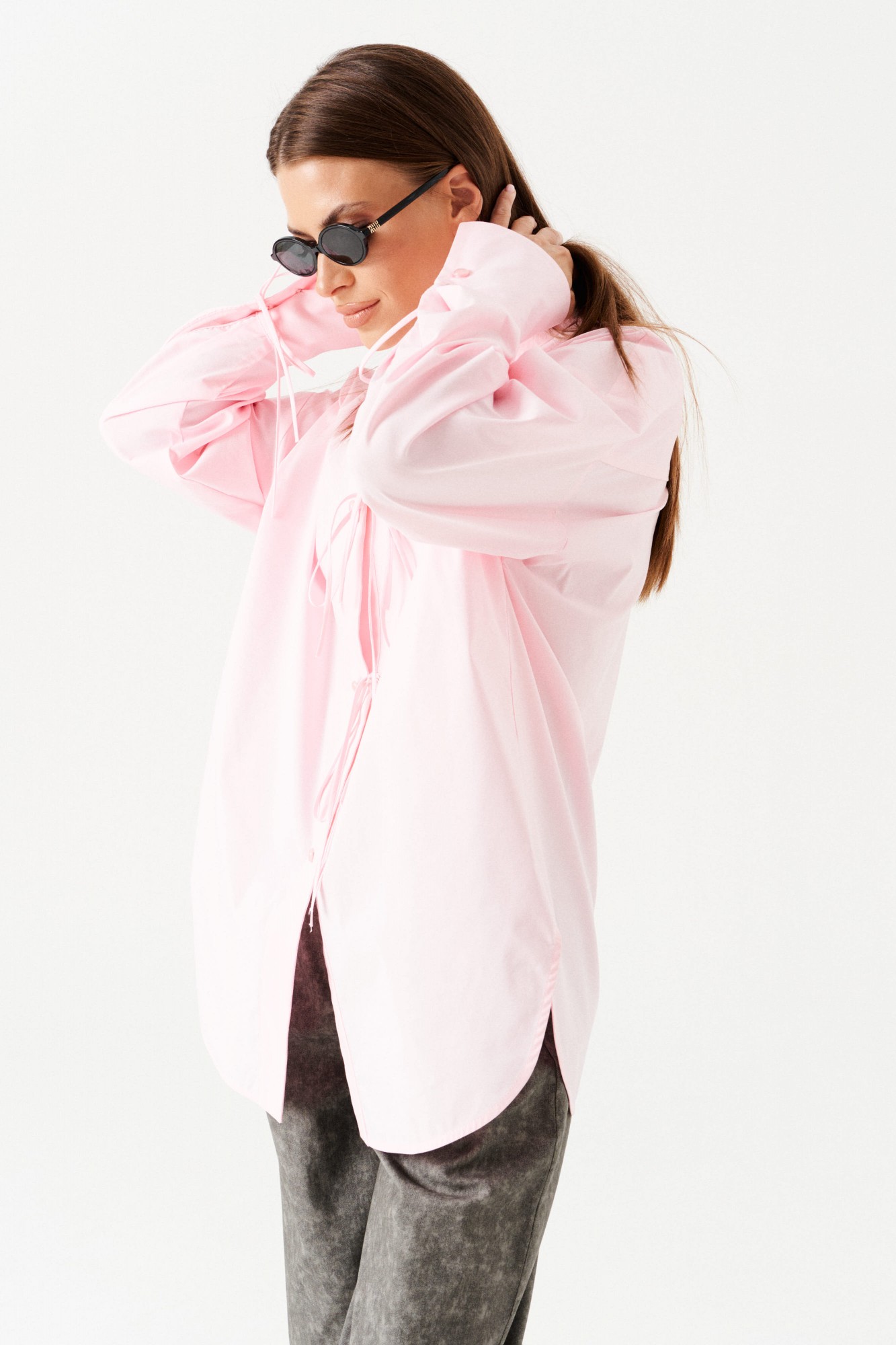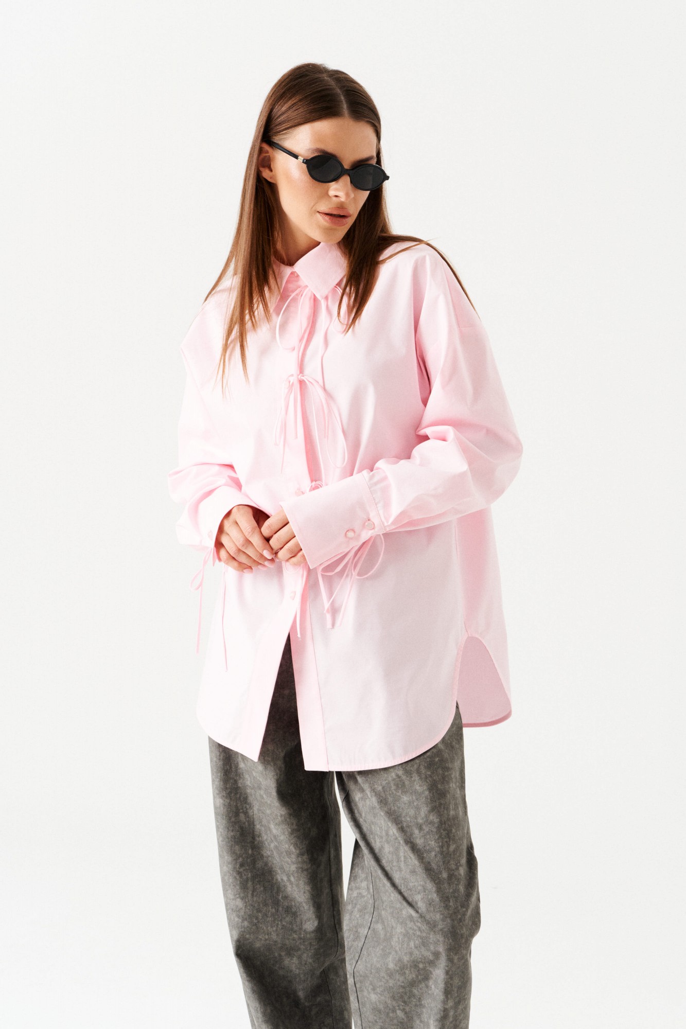 Блузка-рубашка, прямая, свободная, со спущенным плечом, с центральной застежкой на петли и пуговицы на завязках. Воротник рубашечный, отложной, на притачной стойке. Спинка с отрезной кокеткой, встречной складкой по шву притачивания кокетки. Линия низа – фигурная. Рукав втачной, длинный, с отрезной манжетой, застежкой на петли и пуговицы на завязках.