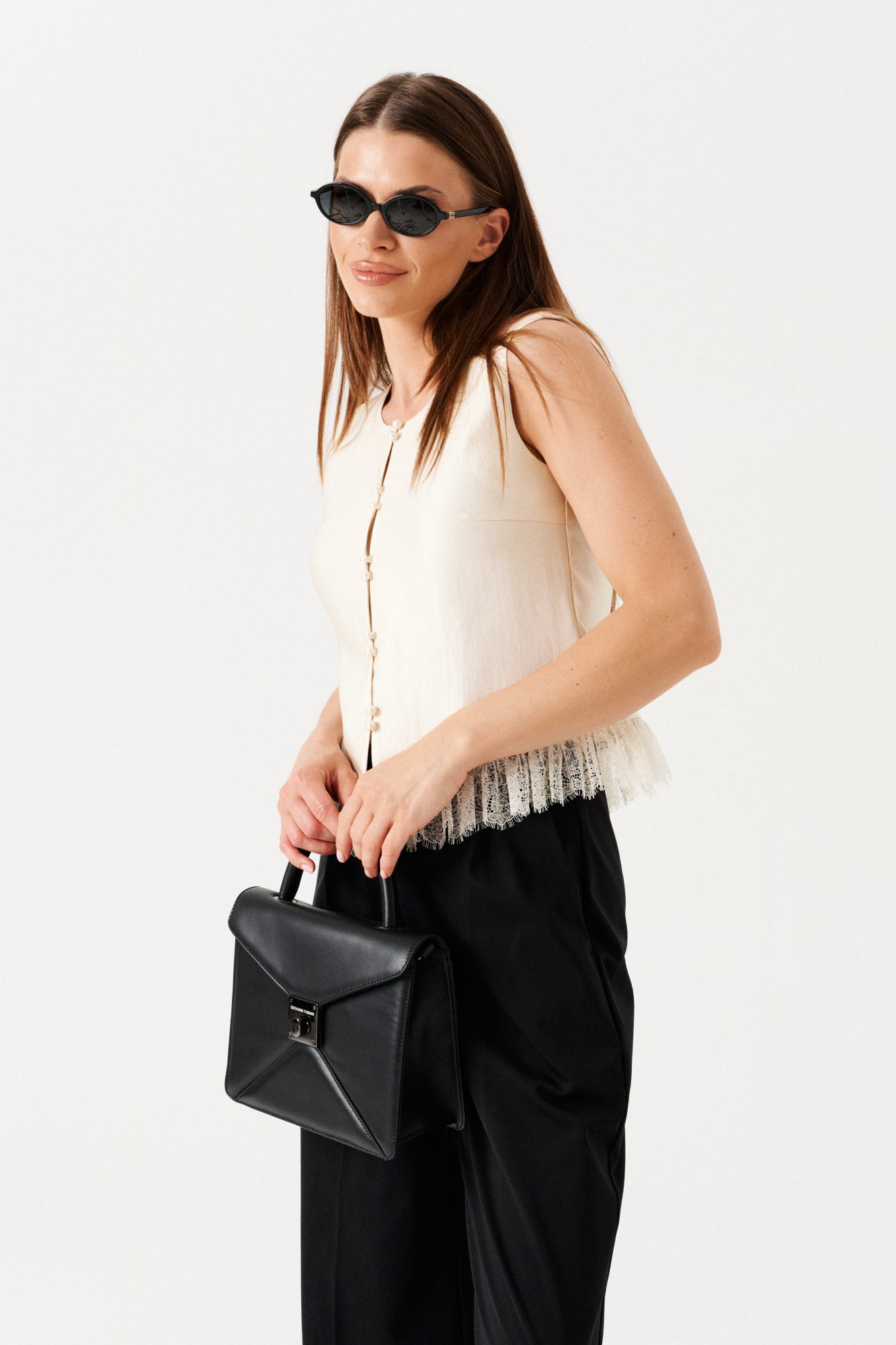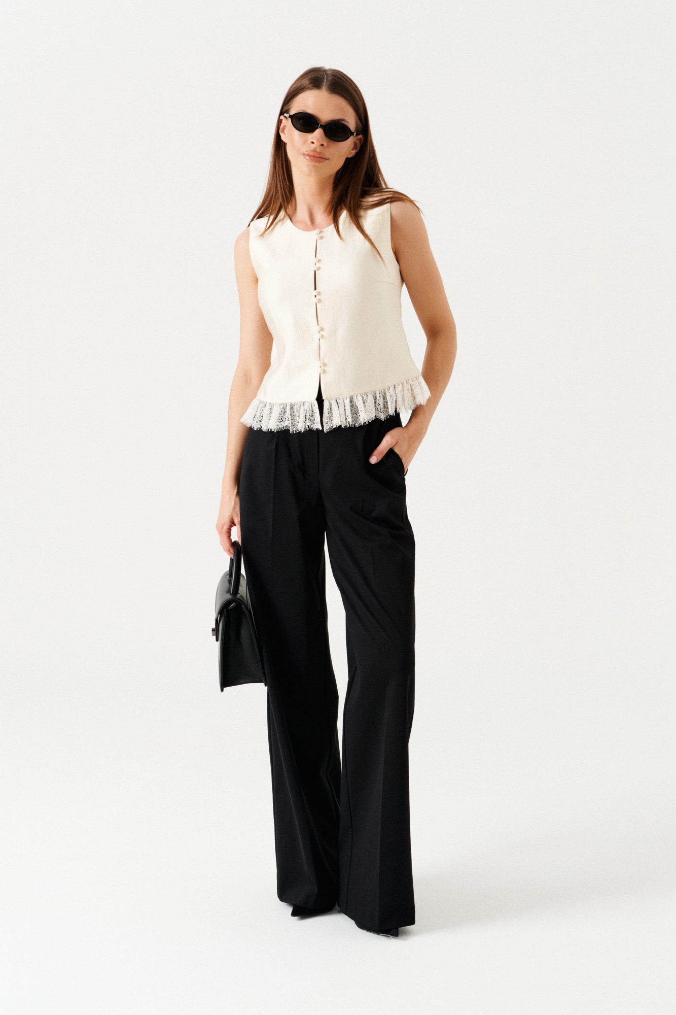 Блузка полуприлегающего силуэта, с центральной застежкой на навесные петли и пуговицы, круглым вырезом горловины. Перед с нагрудными вытачками. Спинка со средним швом и таллиевыми вытачками. Линия низа оформлена кружевом.