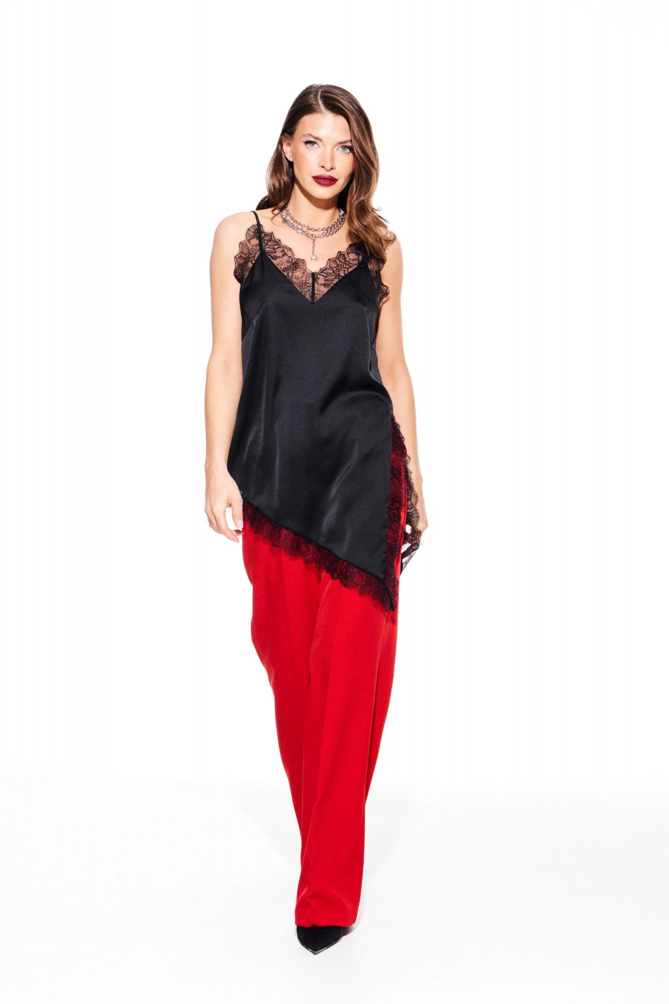 Блузка из струящейся ткани с блеском, с асимметричной линией низа, отделкой из кружева, на тонких регулируемых бретелях. Перед с V-образным вырезом горловины и нагрудными вытачками. В левом боковом шве фигурный разрез. Горловина, линия низа и разрез оформлены тесьмой из кружева.