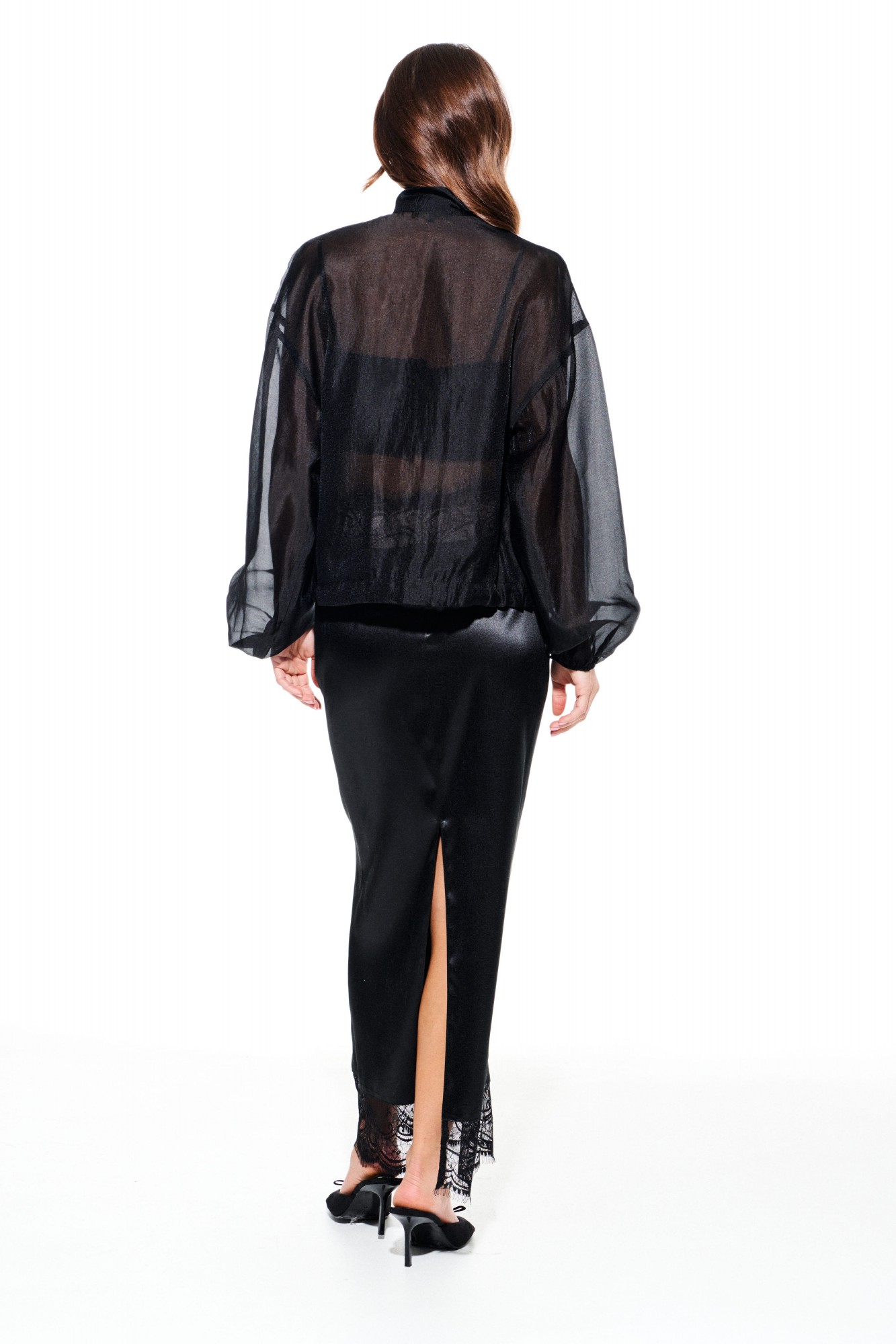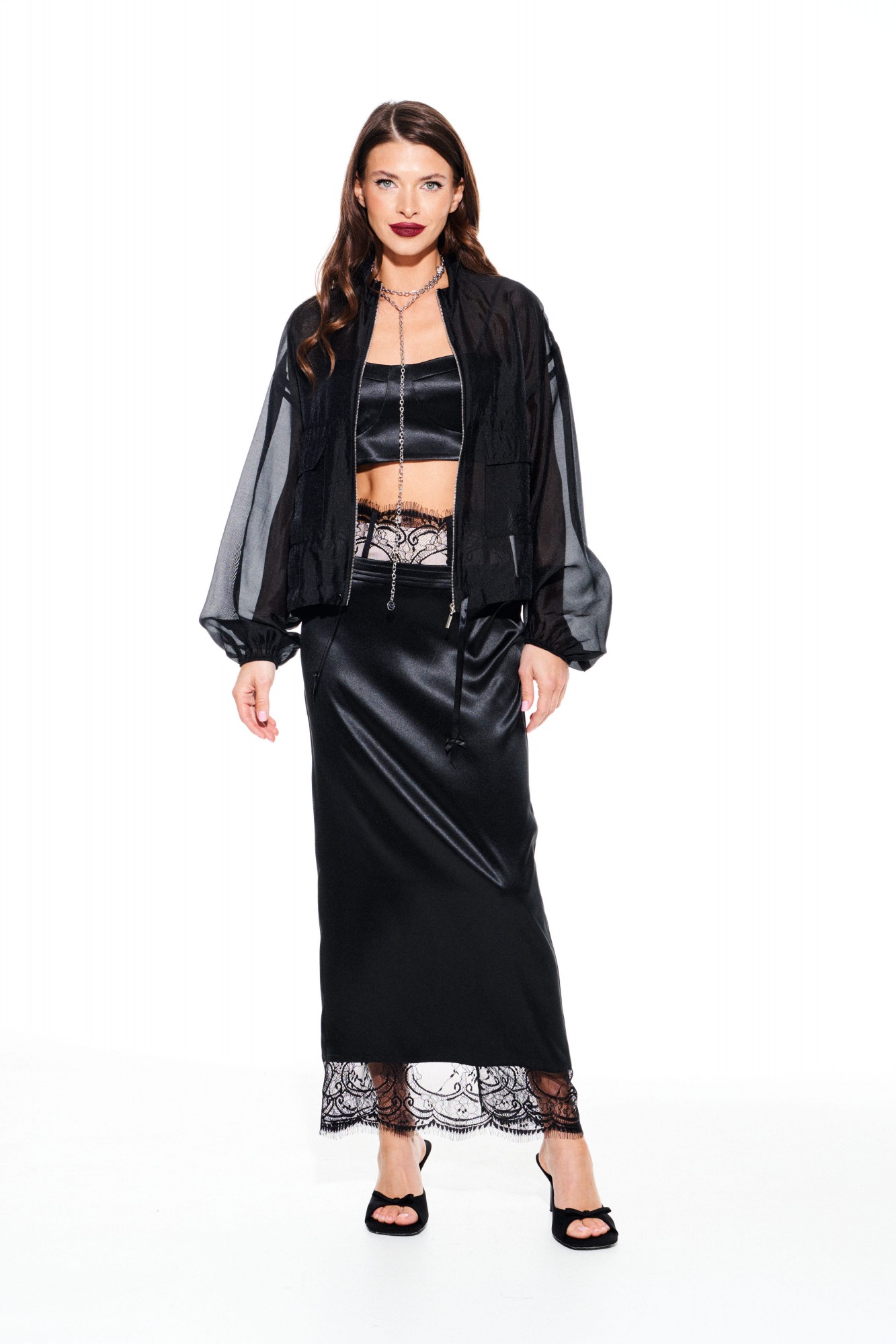 Блузон из органзы, умеренного объема, прямого силуэта, со спущенной линией плеча, с центральной застежкой на тесьму-молнию. На деталях переда горизонтальный подрез и накладные карманы с клапаном. Воротник – стойка. Спинка цельная. Нижний срез оформлен кулиской. В кулису продета декоративная тесьма для регулировки объема и формирования сборки. Рукав втачной, длинный, со сборкой на резинку по нижнему срезу.