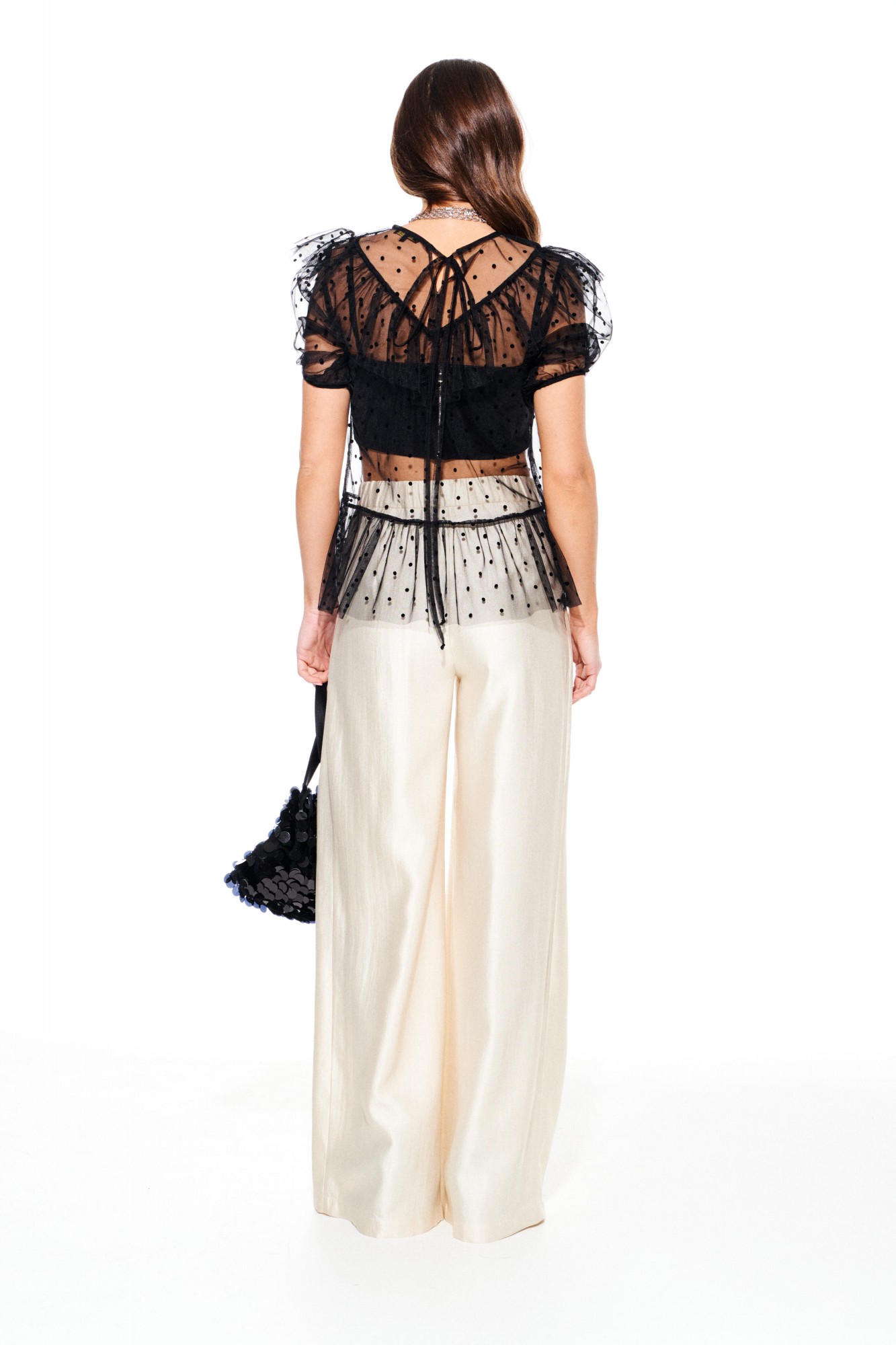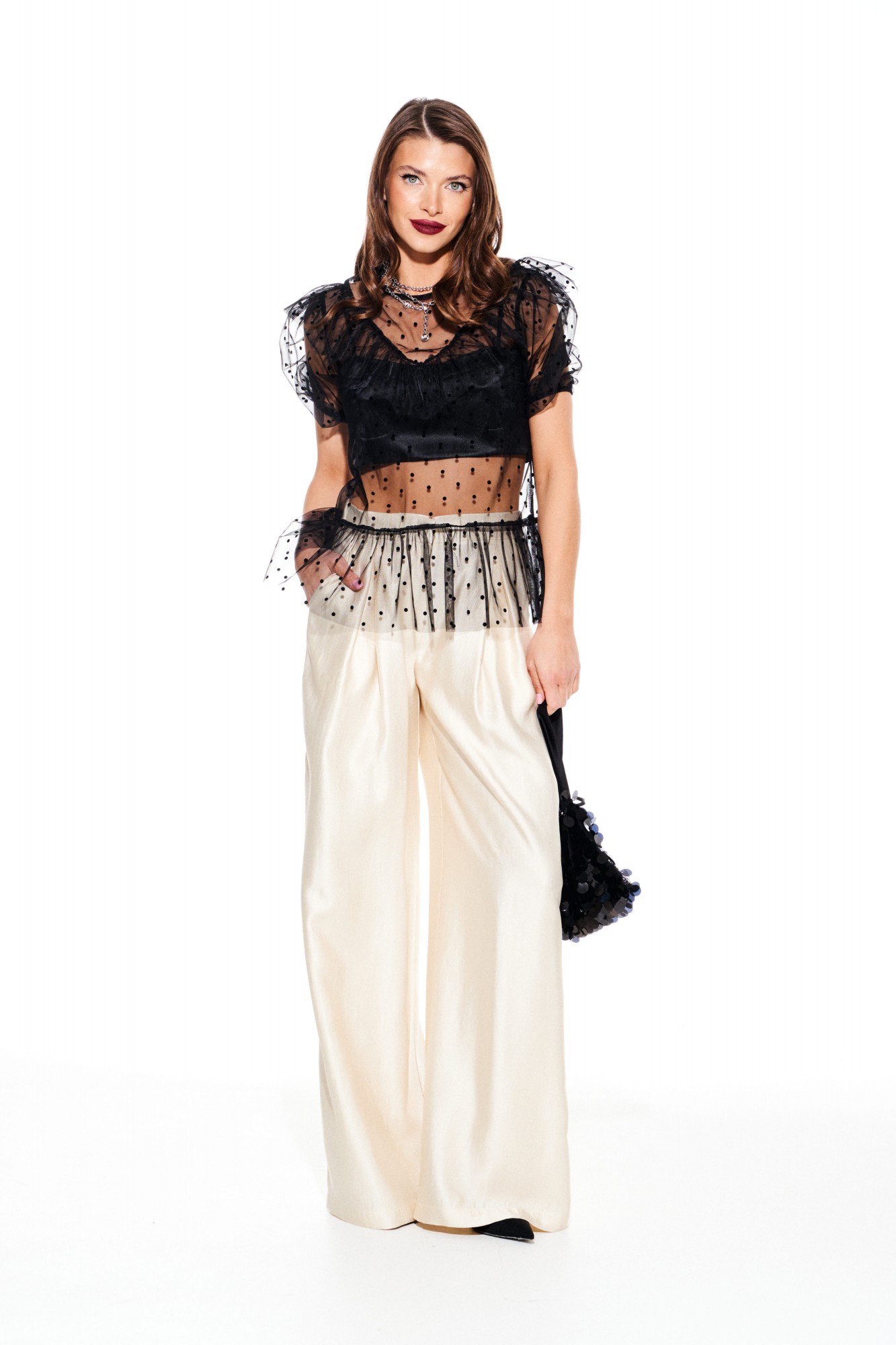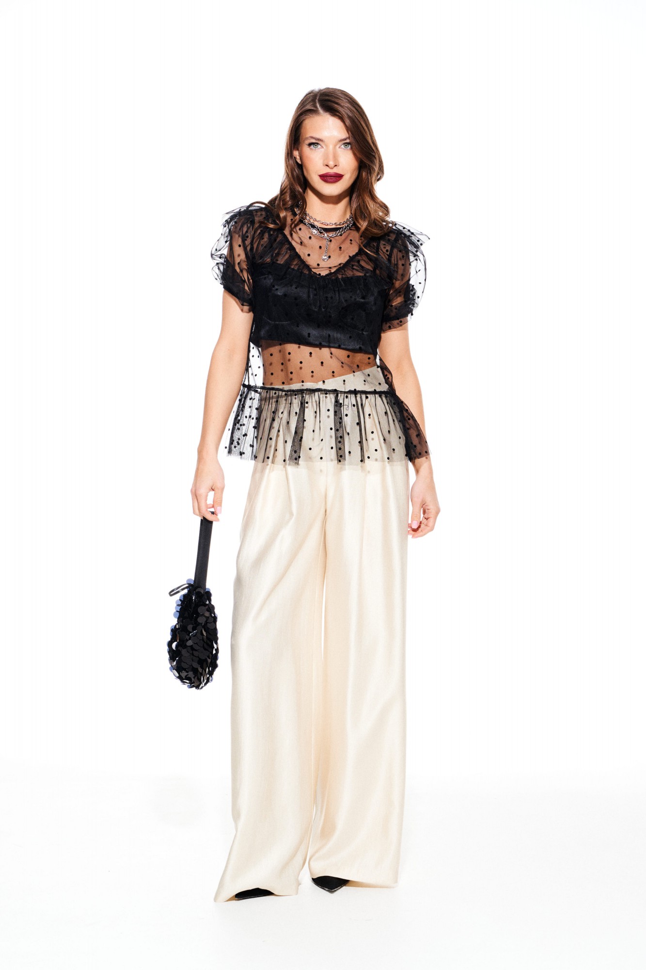 Блузка из различных материалов. Верхний слой блузки из сетчатого материала в горошек, полуприлегающего силуэта, с круглым вырезом горловины. Детали полочки и спинки с горизонтальным подрезом и отрезной фигурной кокеткой с воланом. Нижние части полочек и спинки собраны на сборку. Спинка с завязками на горловине. Кокетка спинки с средним швом и разрезом. Рукав втачной, короткий, со сборкой на резинку по нижнему срезу. Нижняя блузка из струящейся ткани с блеском, прилегающего силуэта, на тонких регулируемых бретелях, на подкладке. Лиф переда с рельефами и отрезными чашками. Спинка с рельефами, с центральной застежкой на тесьму-молнию.
