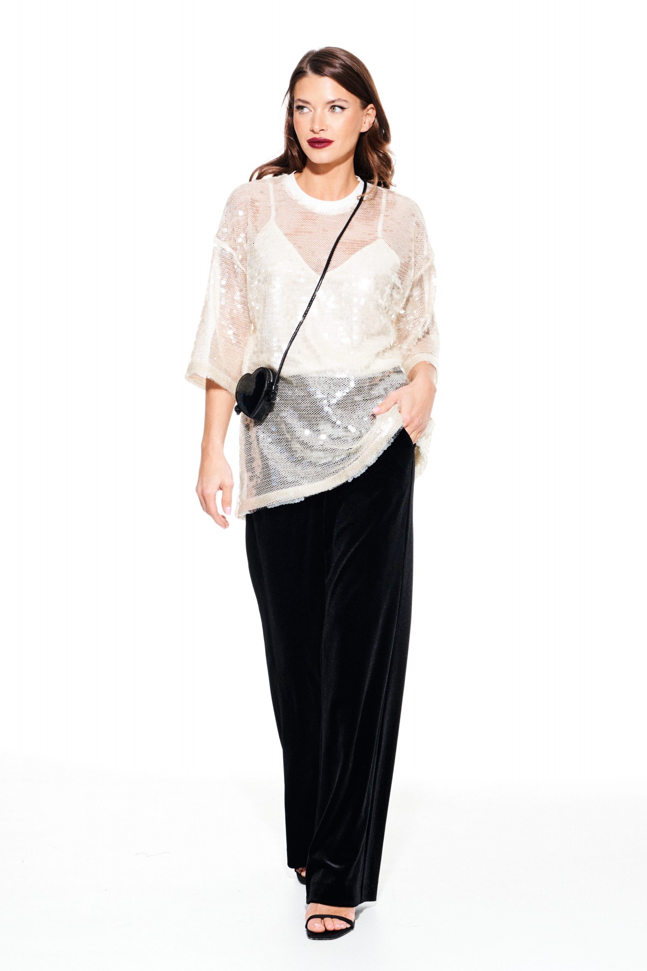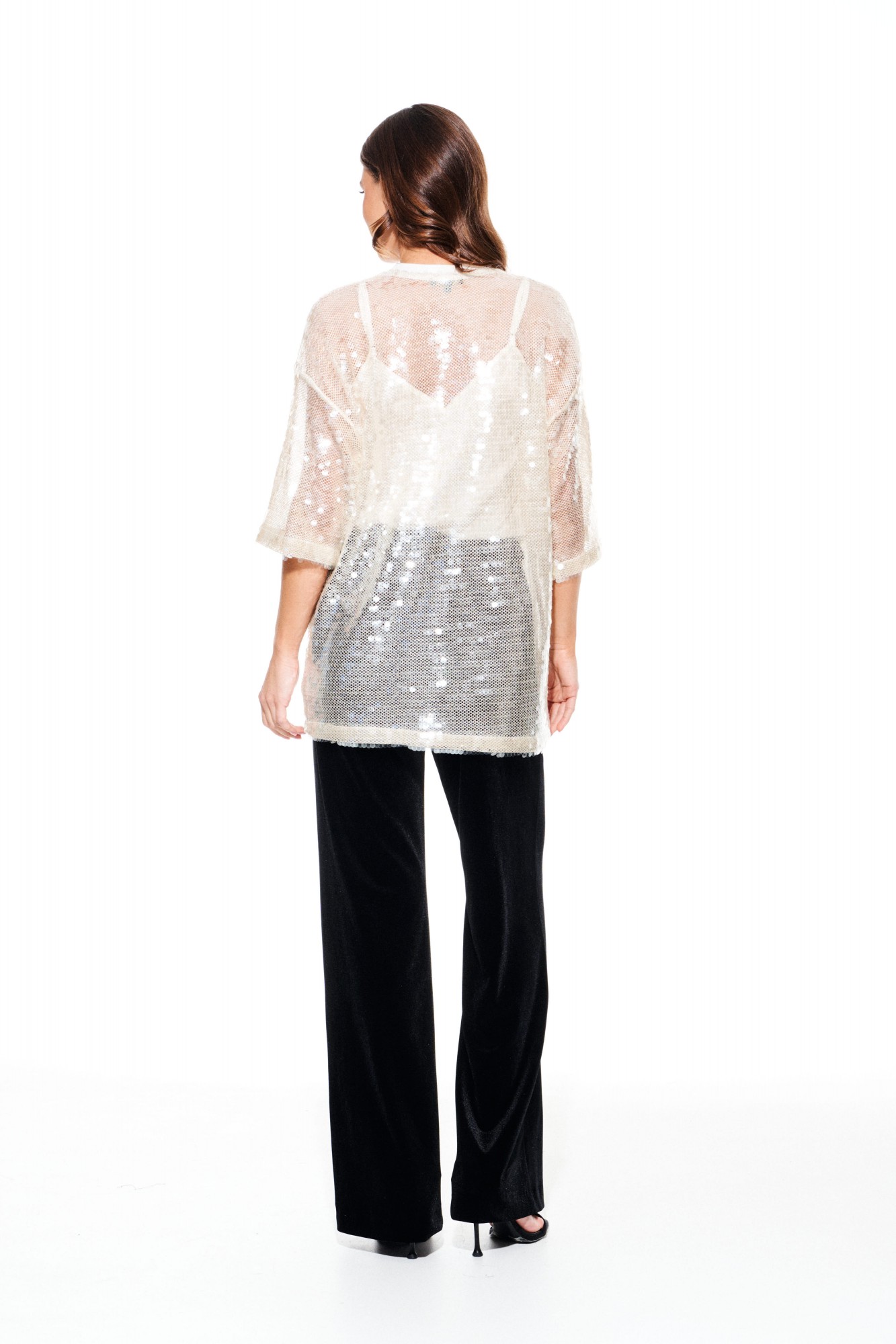 Блузка из различных материалов. Верхняя блузка из трикотажного полотна в пайетки, прямого силуэта, свободная, с круглым вырезом горловины. Перед и спинка цельные. Вырез горловины обработан довязом. Нижняя блузка выполнена из струящейся ткани с блеском, прямого силуэта, с V-образным вырезом горловины, на регулируемых бретелях. Перед с нагрудными вытачками. Спинка цельная.