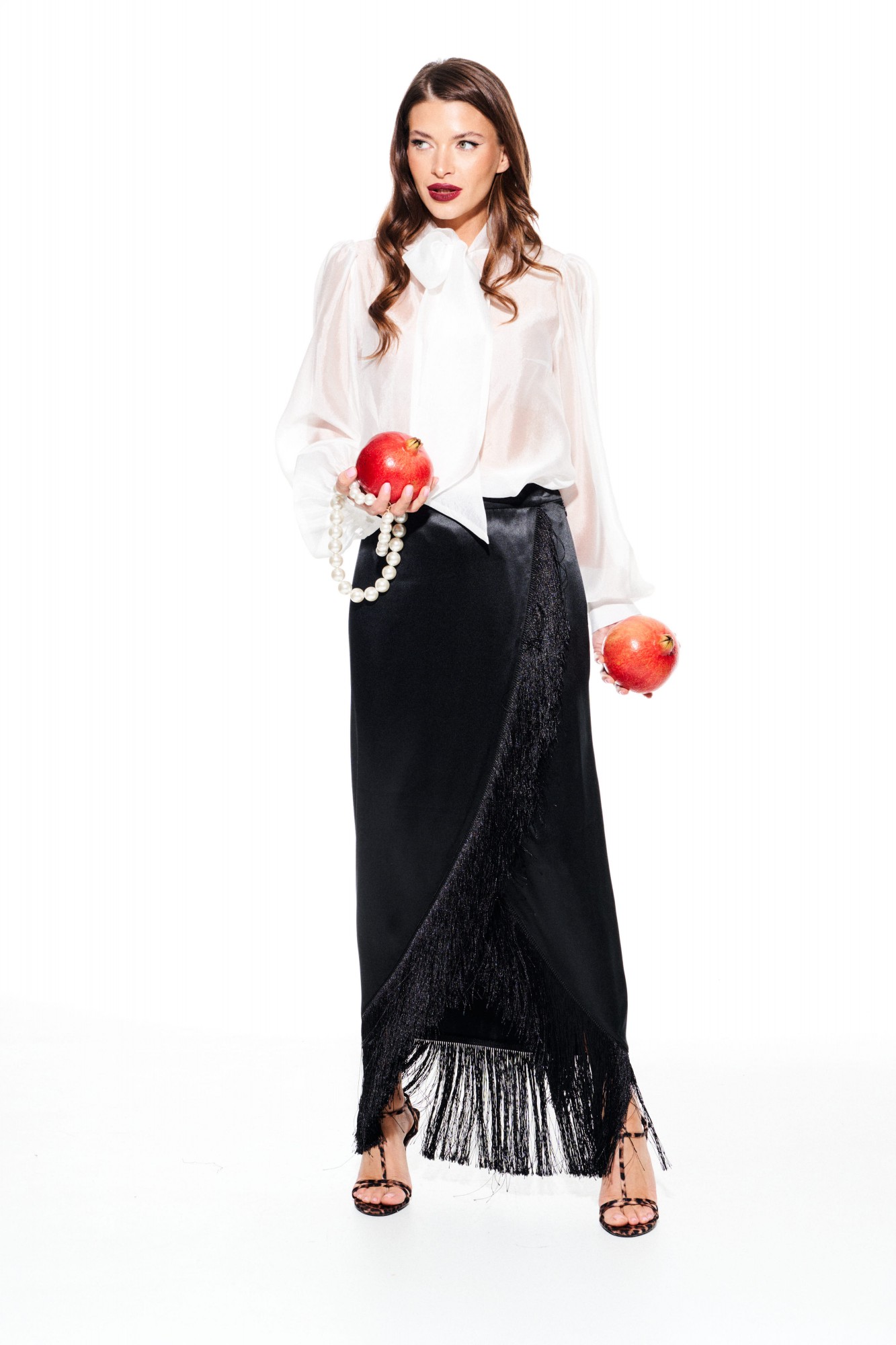 Блузка из органзы, умеренного объема, прямого силуэта. Перед с нагрудными вытачками. Воротник с отрезной стойкой, переходящей в завязку. Спинка с отрезной кокеткой и сборкой. Рукав втачной, длинный, с отрезной манжетой. Окат и шов притачивания рукава к манжете со сборкой. Манжета с застежкой на 1 петлю и 1 пуговицу.