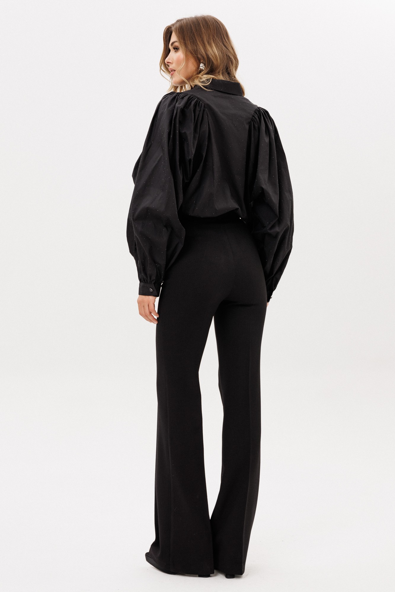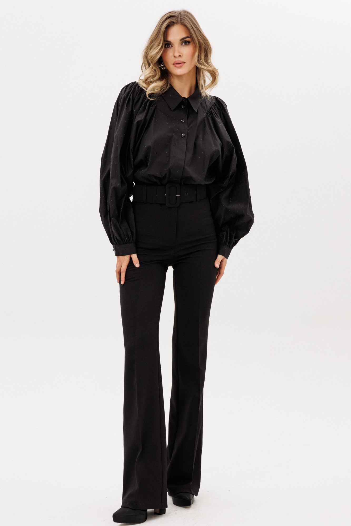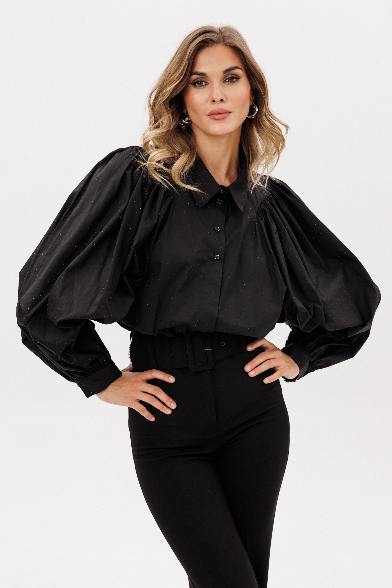 Блузка выполнена из блузочной ткани со стразами. Блузка О-образного силуэта, длиной до линии бедер. Спереди застежка на пришивные пуговицы, частично на потайной планке. Спинка цельная. Воротник стояче-отложной с отрезной стойкой. Плечевой шов заужен. Рукав цельнокроеный, с углубленной проймой. По окату и низу рукава сборка. Низ рукава на манжете, застегивающейся на пуговицу. В боковых швах разрезы.