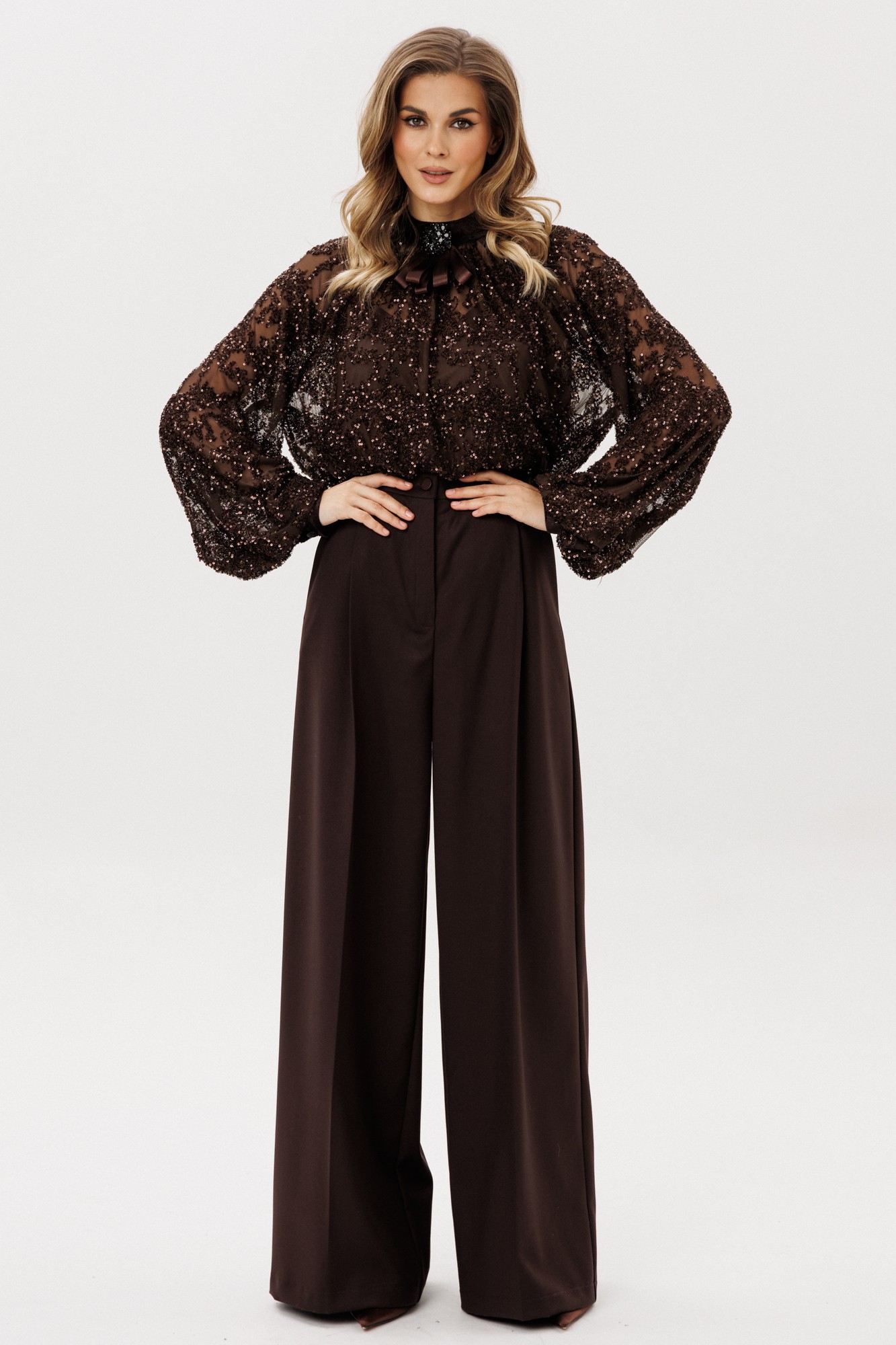 Блузка + топ. Блузка выполнена из сетки с вышивкой пайетками. Блузка прямого силуэта, длиной до линии бедер. Перед и спинка цельные, со сборкой по горловине. Воротник-стойка. Застежка сзади на две петли и пуговицы. Рукав покроя ""реглан"", одношовный, со сборкой по горловине и низу. Низ рукава на притачной манжете из велюра, застегивающейся на пуговицу. В комплект входит топ из трикотажной подкладки. Топ прямого силуэта, длиной до линии бедер, бретели регулируются по длине. В комплект входит декоративная брошь.