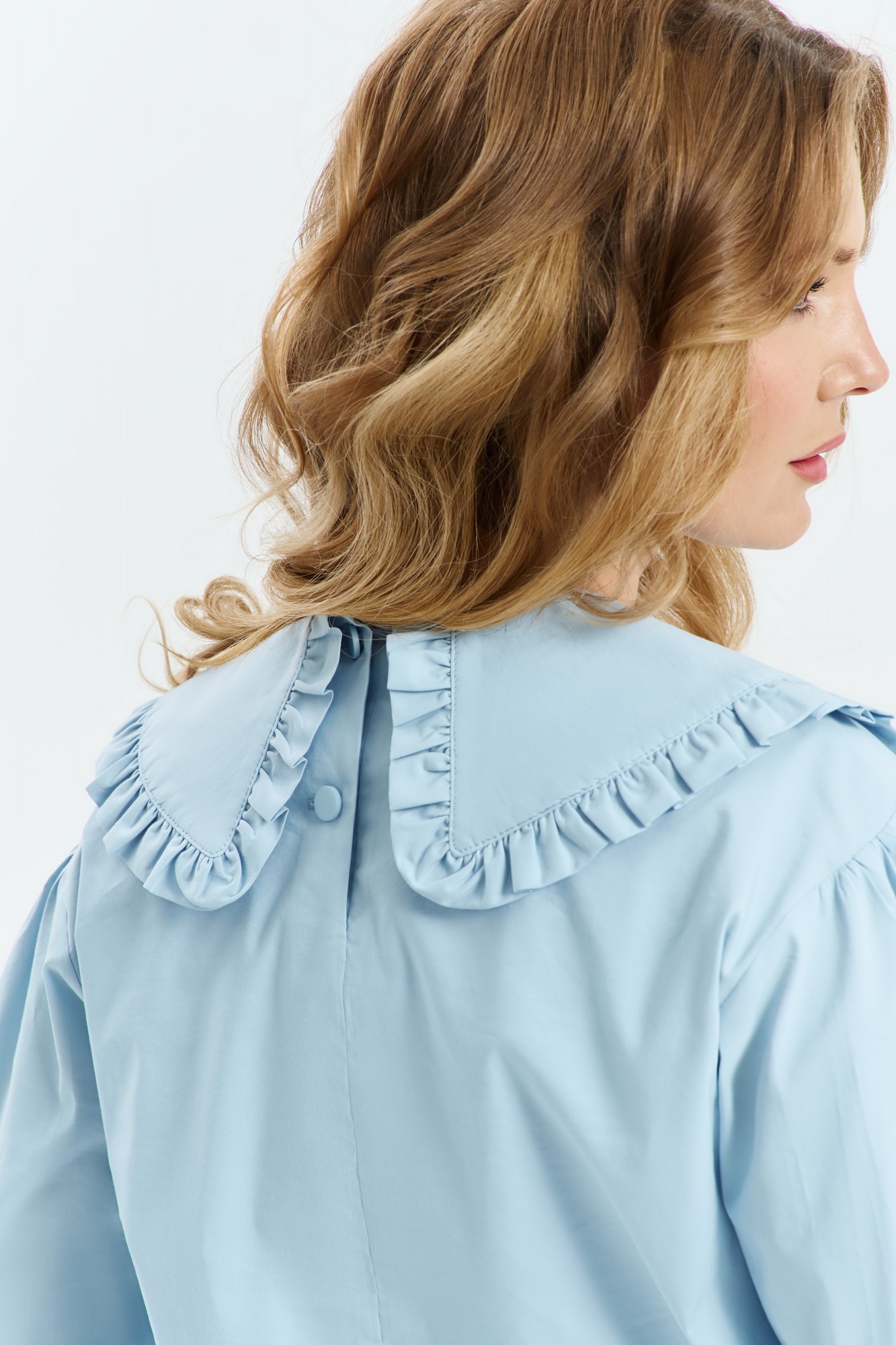 Блуза женская выполнена из хлопковой ткани, изделие свободного силуэта. По полочке расположены нагрудные выточки, горловина округлая, рукав втачной широкий с манжетой по низу рукава. Особенностью данной модели является: -объёмный воротник с рюшей по краю. застежка петли- пуговицы на спинке.