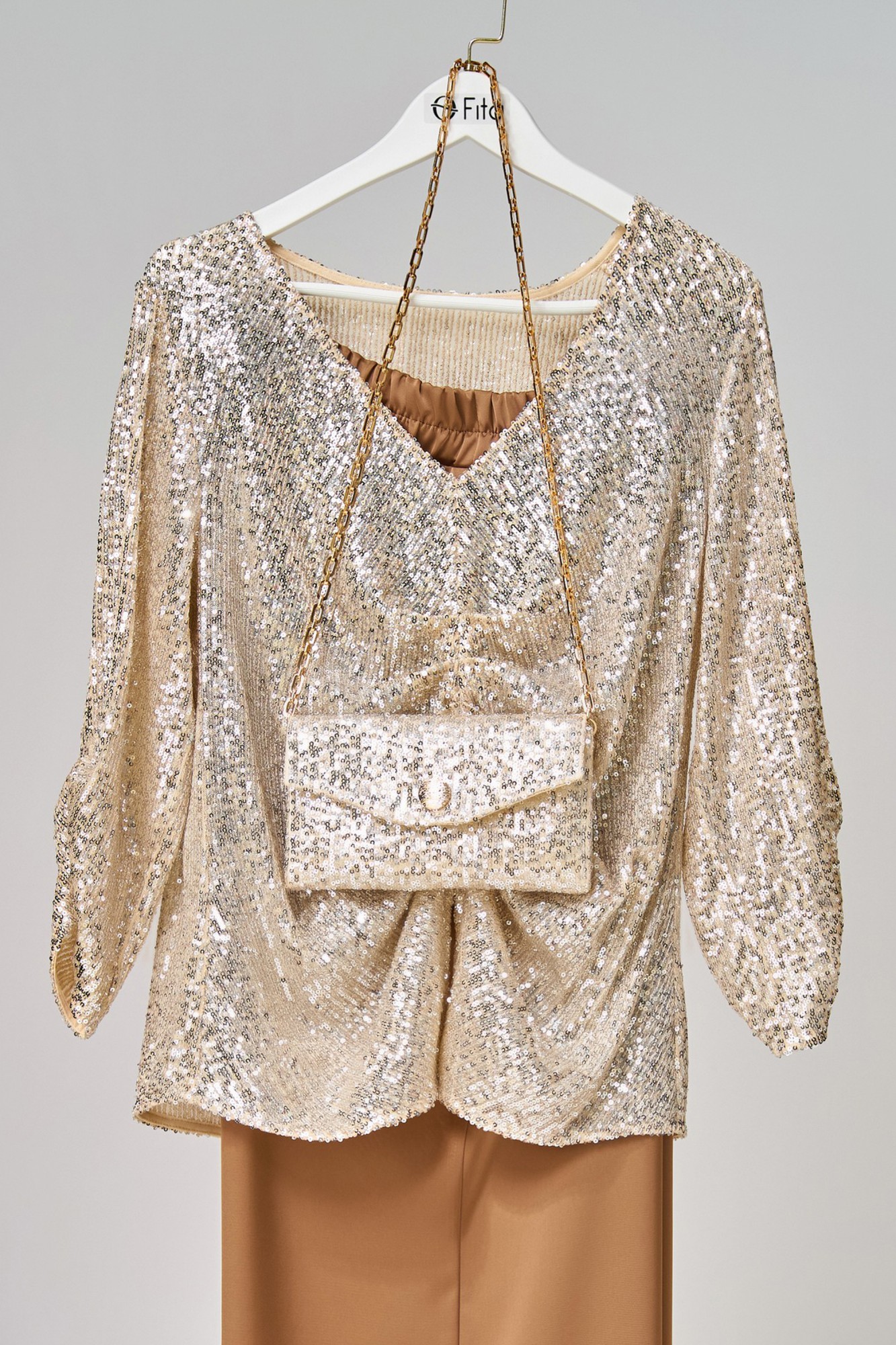 Нарядный комплект ""Зария"" состоит из нарядной блузки с пайетками и сумки-клатча.