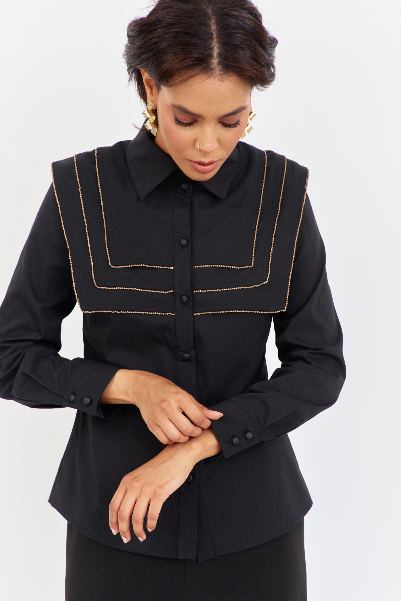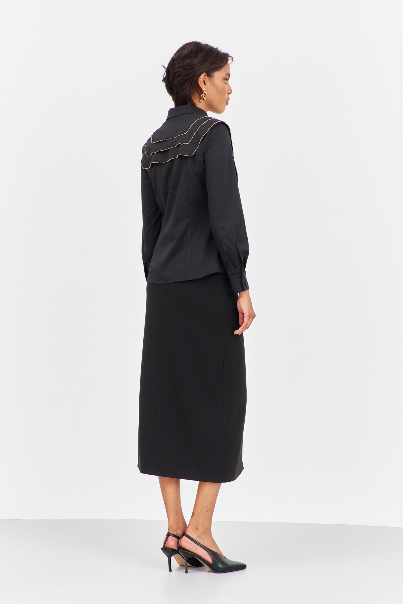 Блузка приталенного силуэта с декоративными кокетками. Характеристики: выполнена из блузочной ткани в черном цвете, центральная застежка на петли и пуговицы, по переду и спинке декоративные отлетные кокетки, низ рукава обработан манжетой.