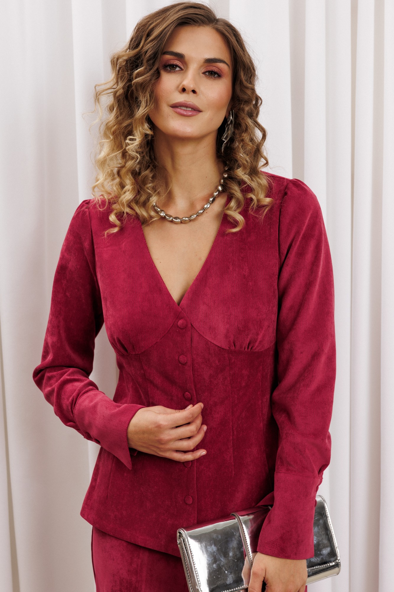 Блузка оригинальная приталенного силуэта из вельветовой ткани. Перед с подрезом под грудью, сборкой в районе груди и таллиевыми вытачками. Застёжка на петли и пуговицы. Горловина V-образной формы. Спинка со средним швом и таллиевыми вытачками. Рукав втачной со сборкой по окату и с манжетой по низу. Манжета высокая с двумя петлями и пуговицами.