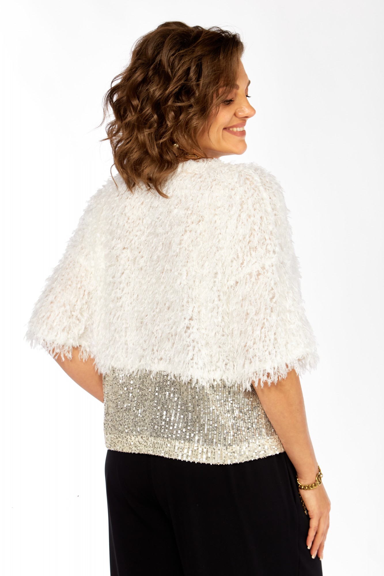 Блузка нарядная прямого силуэта, из интересной ткани с бахромой и отделкой из пайеток. Вырез горловины округлой формы, со спущенным рукавом длиной 3/4.