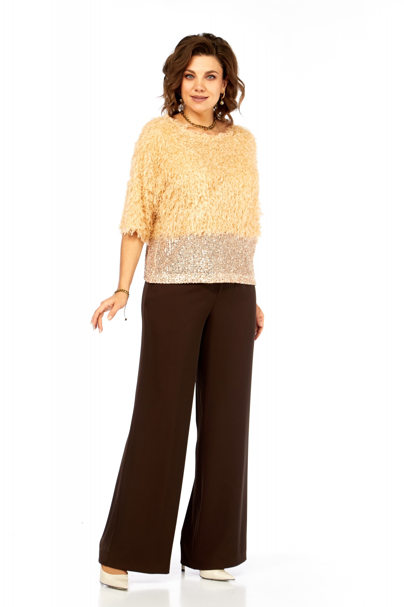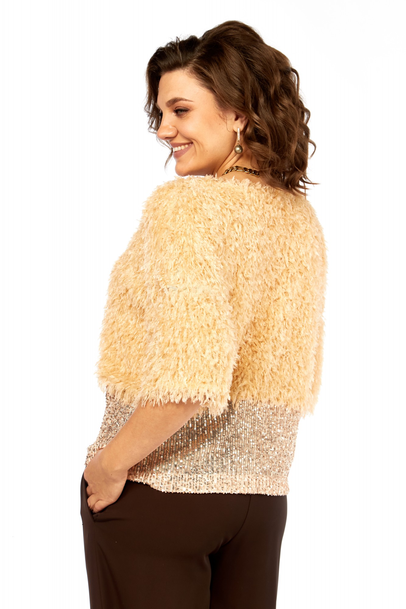 Блузка нарядная прямого силуэта, из интересной ткани с бахромой и отделкой из пайеток. Вырез горловины округлой формы, со спущенным рукавом длиной 3/4.
