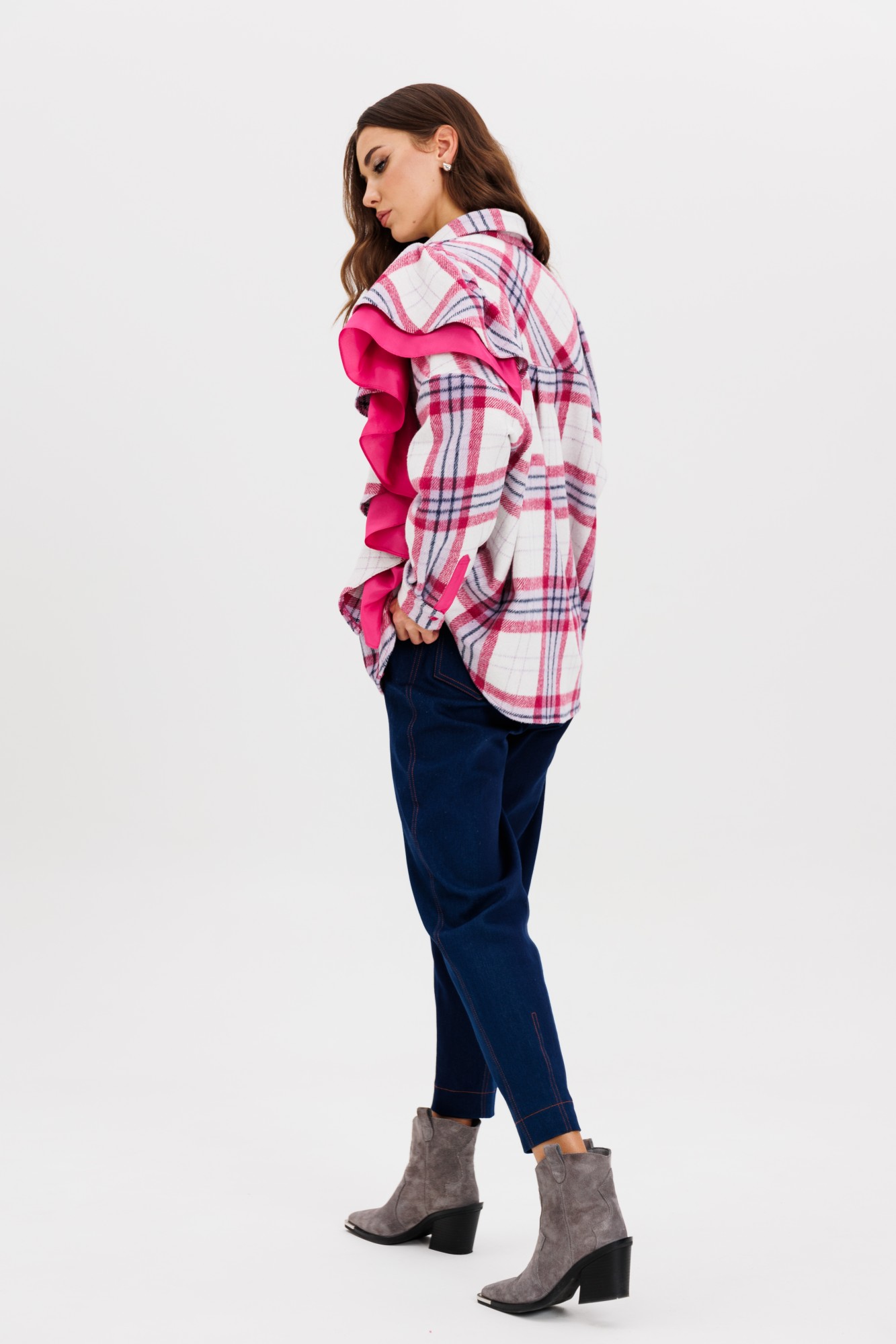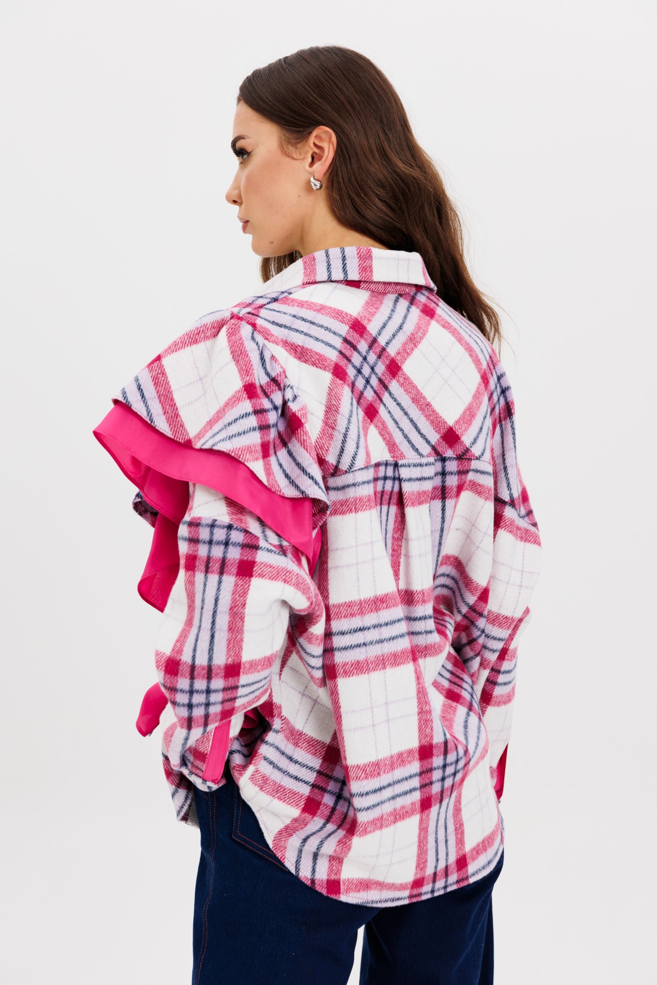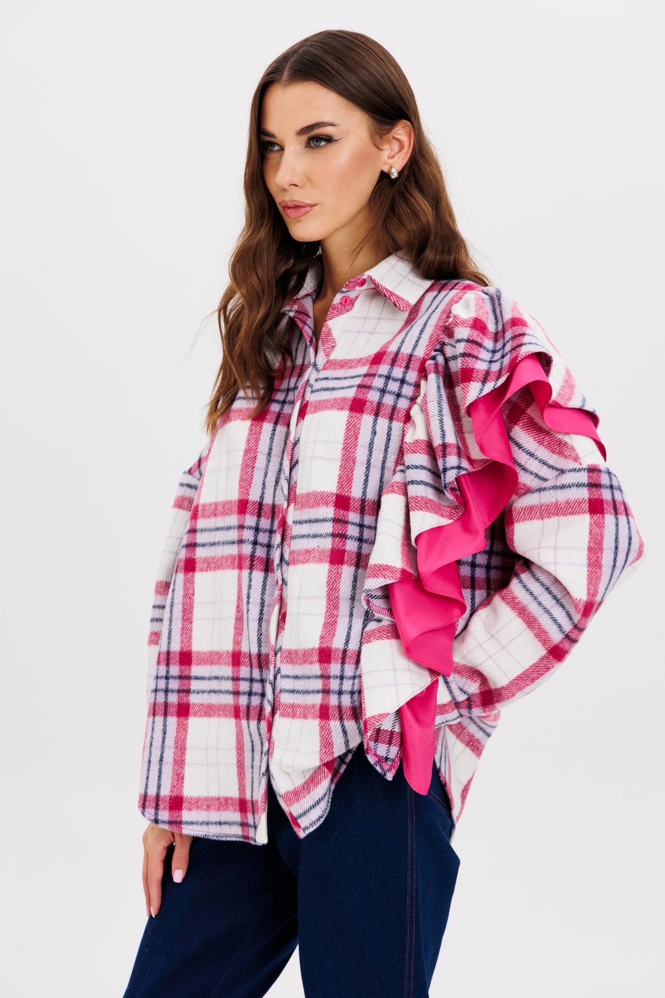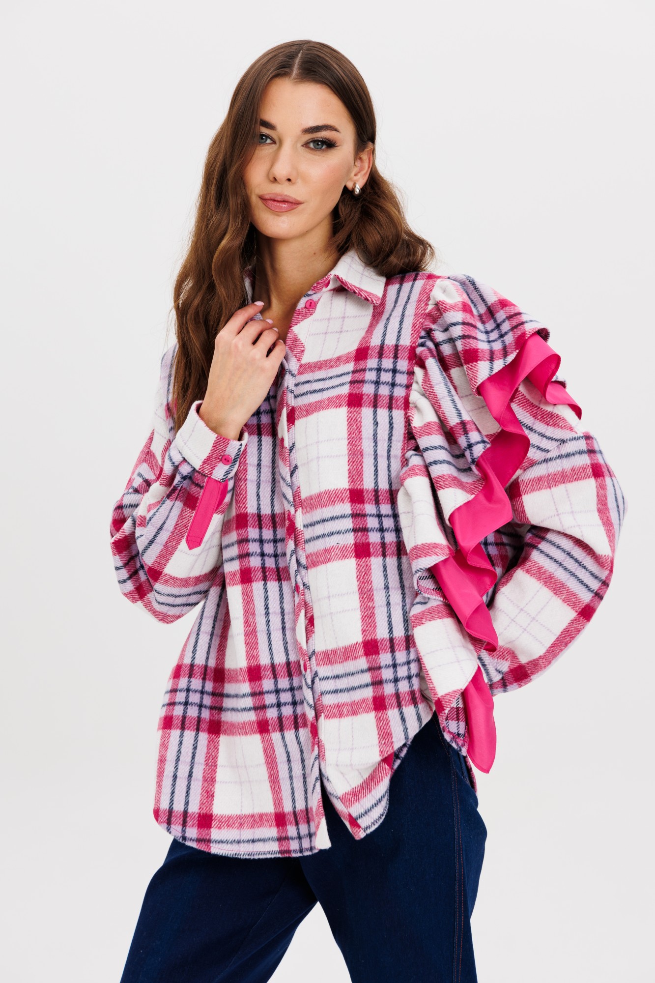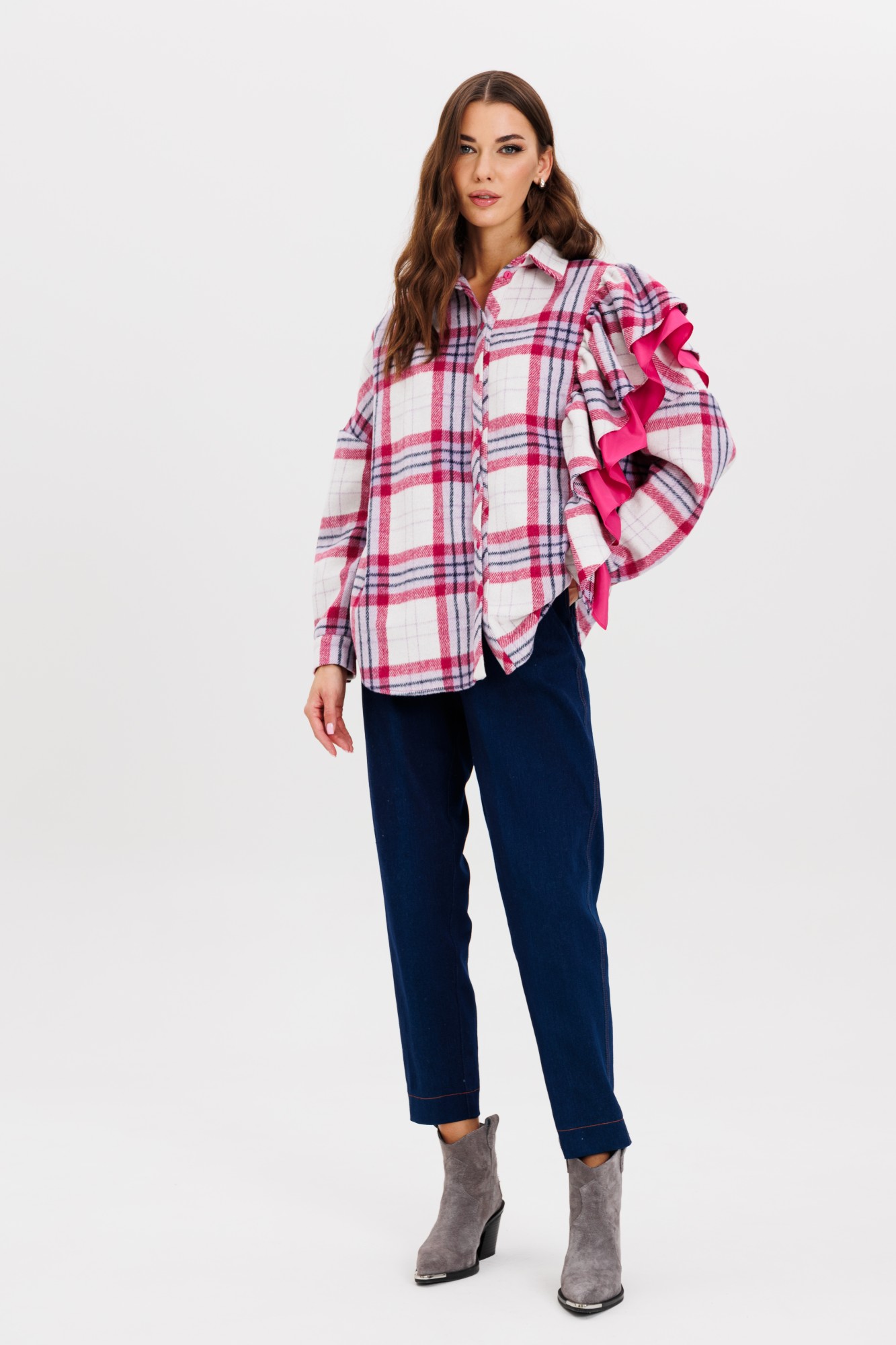 Блуза актуального принта: клетка, прямого свободного силуэта с рубашечным воротником на стойке и зауженным рукавом на манжете со спущенной линией плеча. Акцентная фронтальная деталь два волана, которые имеют сборку и втачены вертикально в одну из деталей полочки и кокетку спинки. Спереди на функциональной планке расположена застежка на петли/пуговицы. Спинка изделия имеет горизонтальную плечевую кокетку и встречную складку для свободы облегания. По плечевым швам заложены неглубокие складки. Низ блузона слегка фигурный: спинка и полочка чуть длиннее бокового шва. Длина изделия блузона по спинке 73 см. Рукав рубашечный одношовный, завершается манжетой (высота 5 см) с застежкой петля/пуговица. Внутренние планки блузы, внутренняя стойка воротника, манжет, отделочная деталь разреза рукава-созданы в тон одного из воланов. Длина спущенного плечевого шва 33 см. Длина рукава с манжетой 41 см. (фурнитура может отличаться от представленной на рекламном фотоматериале). Особые рекомендации: рекомендуется холодная деликатная ручная стирка, без использования отбеливающих СМС, без интенсивного трения. Сушка в вертикальном положении. ВТО с минимальным паром.