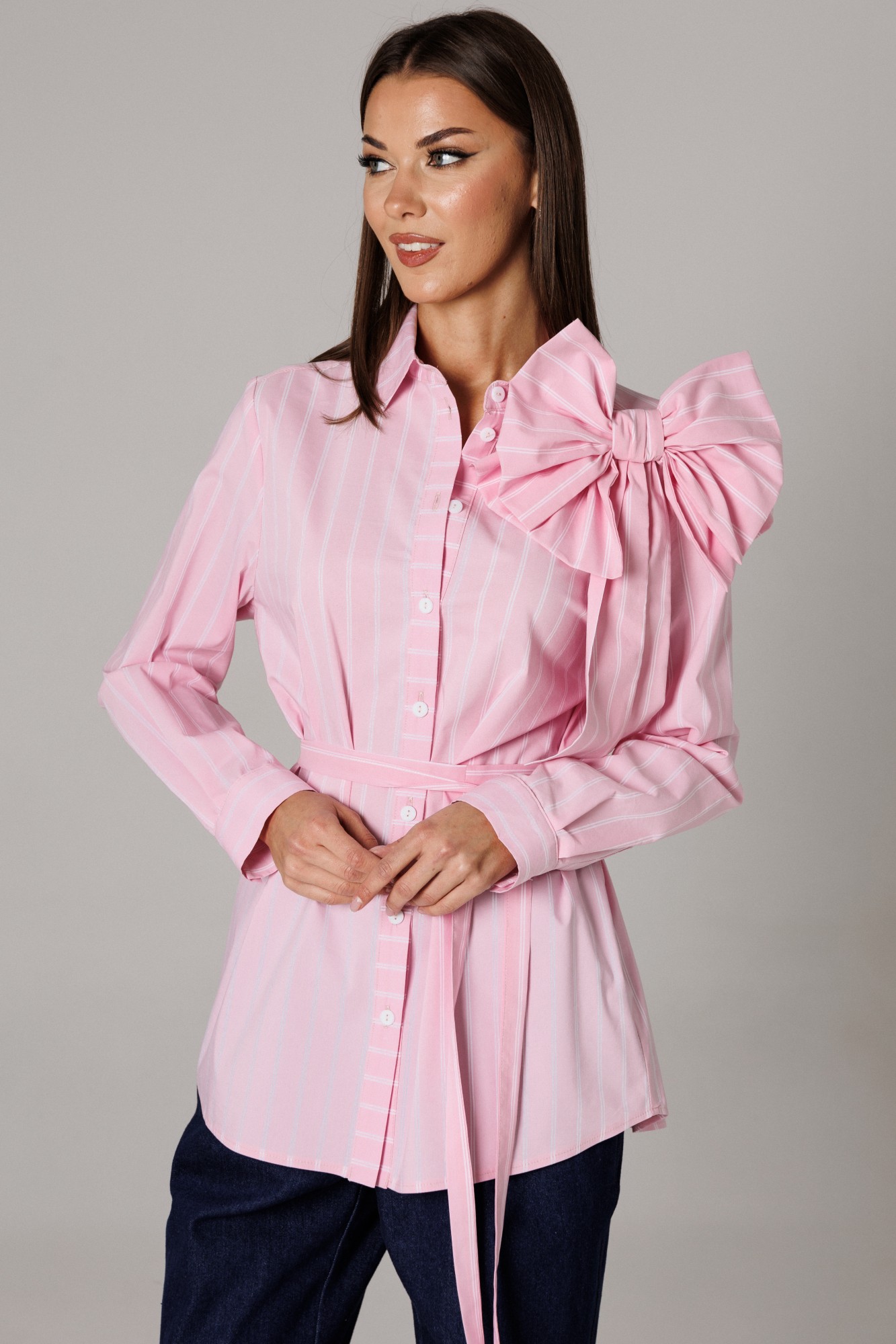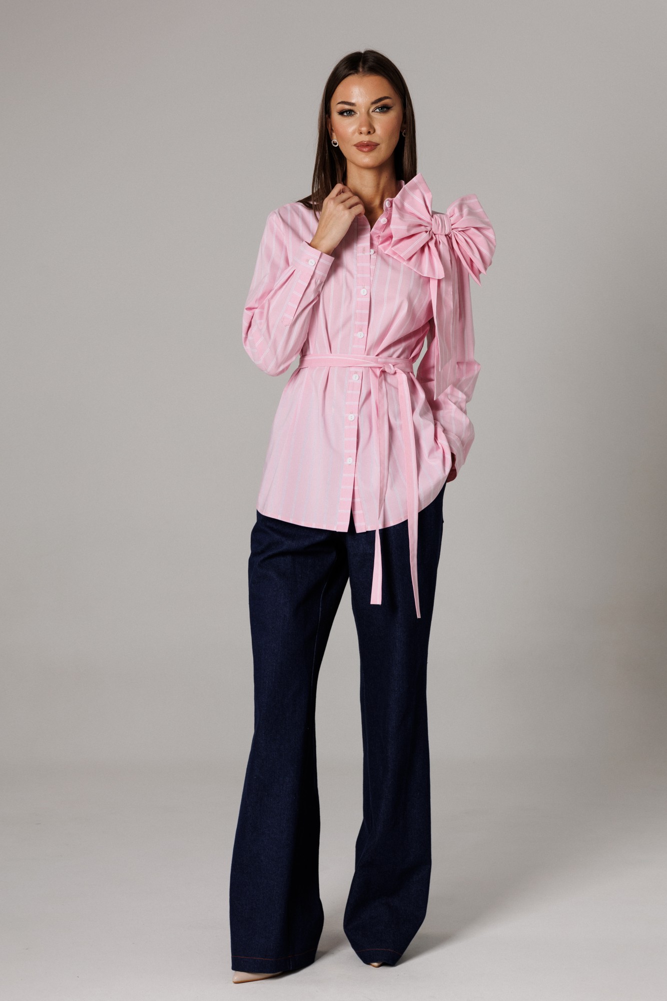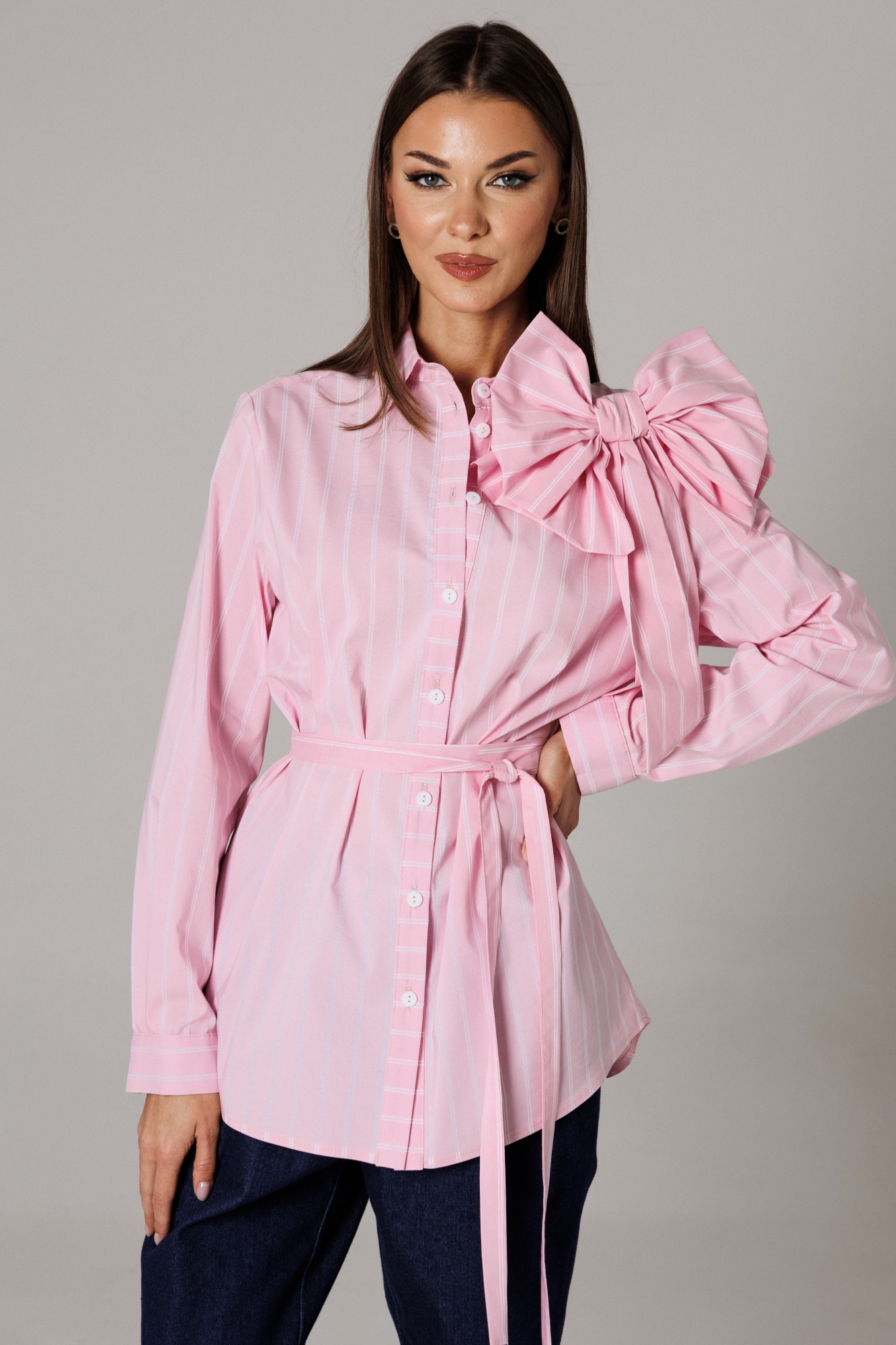 Блуза рубашечного покроя с втачным одношовным рукавом с манжетой. Спинка изделия состоит из горизонтальной кокетки и основной детали, на которой расположены две складки для свободы движения. Линия низа: фигурная. Рукав втачной, одношовный, с притачной манжетой, высотой 5,5 см и разрезом-планкой для петли/пуговицы. Высота планки 11 см. Длина рукава в готовом виде 61 см. Горловина оформлена стойкой с рубашечным воротником. Застежка вертикальная на планках петли/пуговицы. В комплекте присутствуют съемные текстильные дополнения: пояс и декоративная брошь в виде банта. (фурнитура может отличаться от представленной на рекламном фотоматериале). Особые рекомендации: рекомендуется холодная деликатная ручная стирка, без использования отбеливающих СМС, без интенсивного трения. Сушка в вертикальном положении. ВТО с минимальным паром.