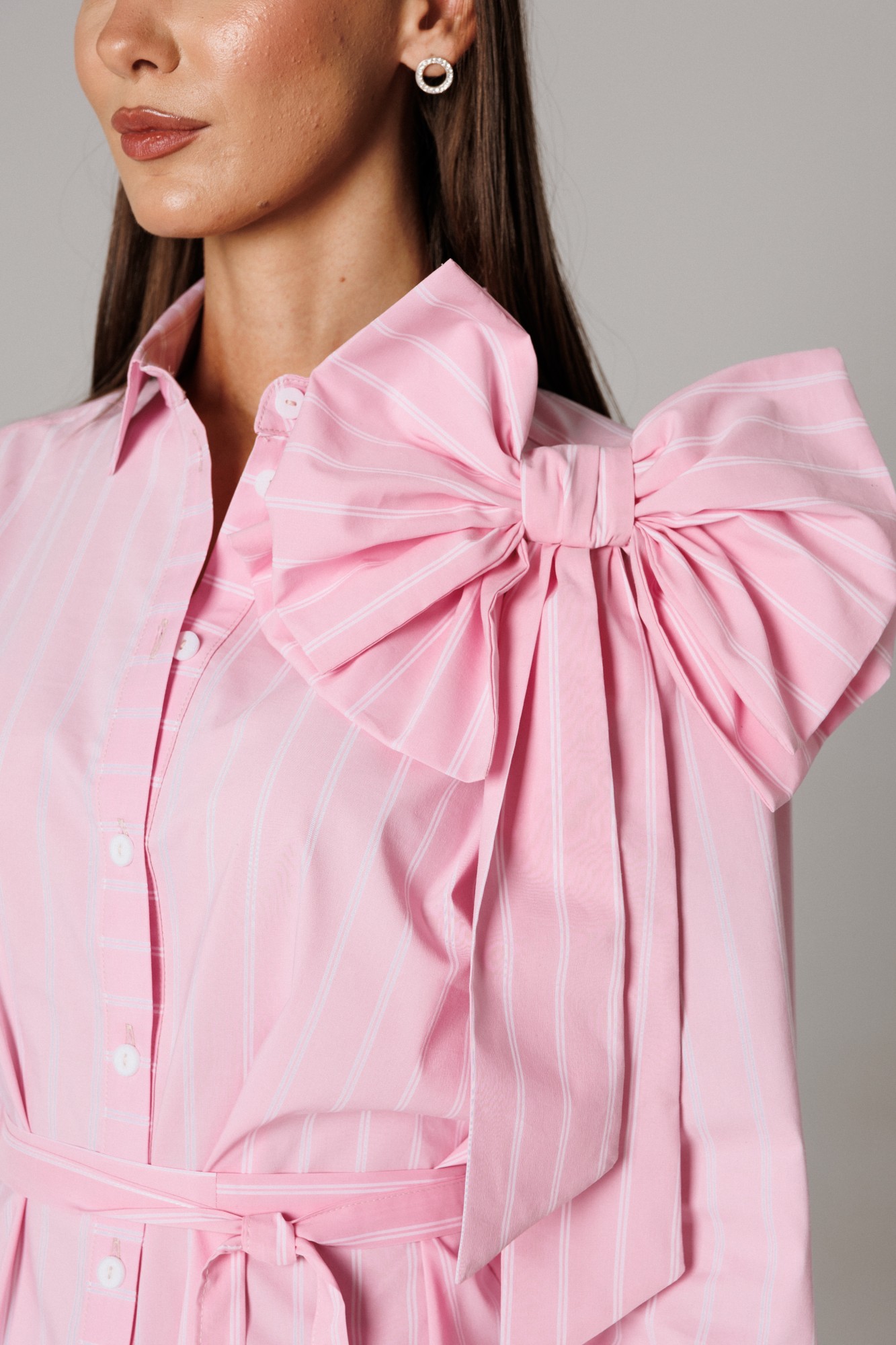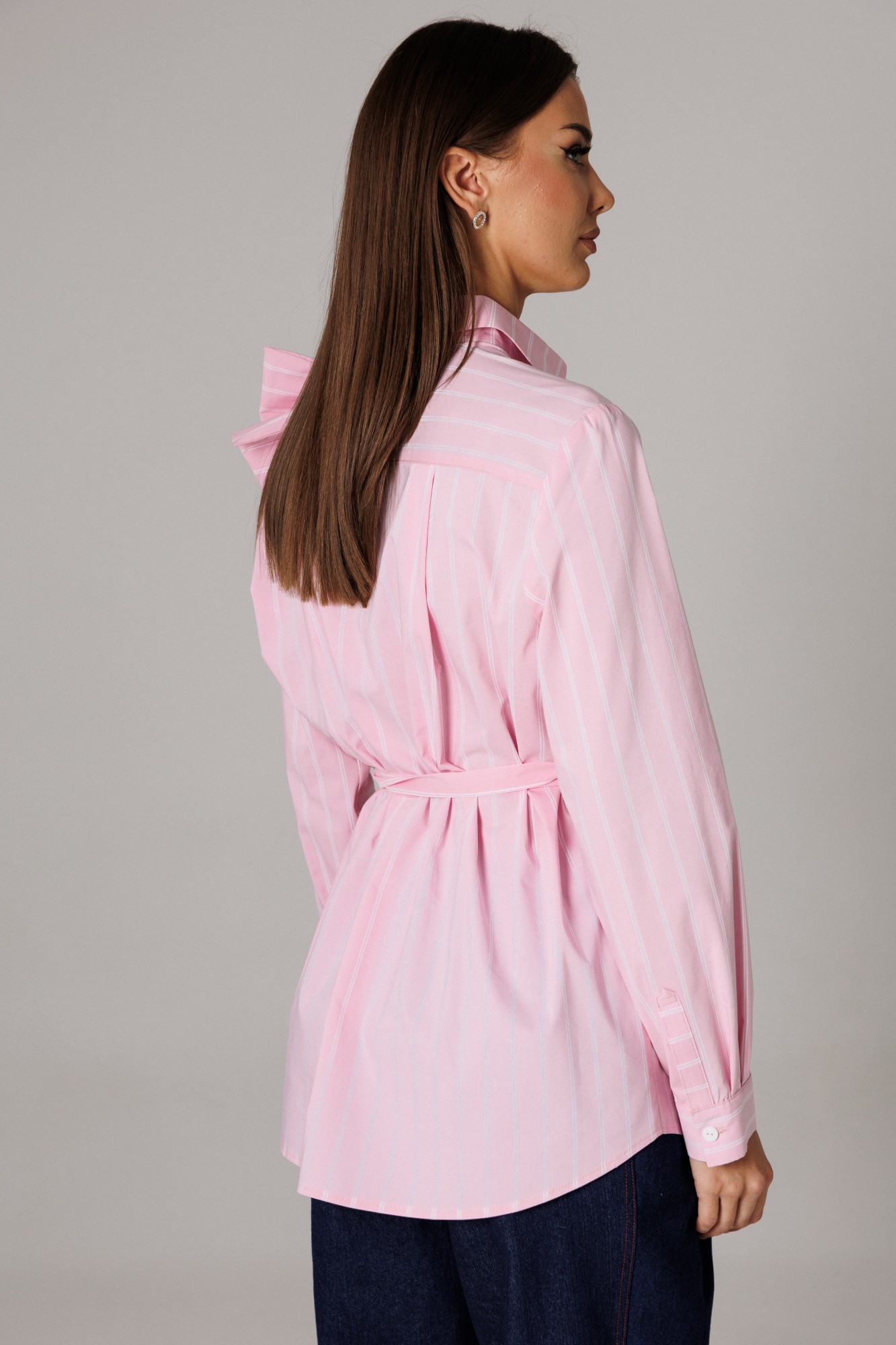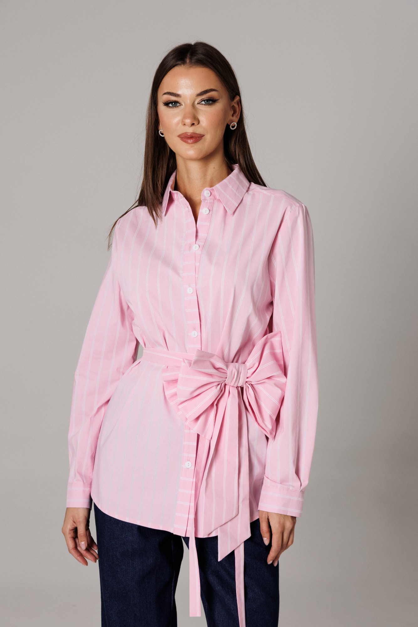 Блуза рубашечного покроя с втачным одношовным рукавом с манжетой. Спинка изделия состоит из горизонтальной кокетки и основной детали, на которой расположены две складки для свободы движения. Линия низа: фигурная. Рукав втачной, одношовный, с притачной манжетой, высотой 5,5 см и разрезом-планкой для петли/пуговицы. Высота планки 11 см. Длина рукава в готовом виде 61 см. Горловина оформлена стойкой с рубашечным воротником. Застежка вертикальная на планках петли/пуговицы. В комплекте присутствуют съемные текстильные дополнения: пояс и декоративная брошь в виде банта. (фурнитура может отличаться от представленной на рекламном фотоматериале). Особые рекомендации: рекомендуется холодная деликатная ручная стирка, без использования отбеливающих СМС, без интенсивного трения. Сушка в вертикальном положении. ВТО с минимальным паром.