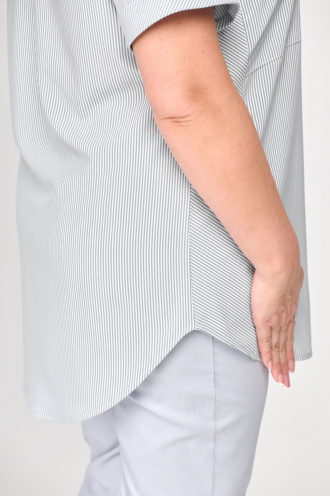 Красивая, практичная женская блуза подойдет как для работы так и для романтических прогулок. Перед блузы – с бочком и нагрудной выточкой, выходящей из него, карман накладной, горловина – круглая. По центру переда функциональная застежка на 6 пуговиц и 6 пробивных пуговиц. Спинка без среднего шва, рукав короткий, одношовный, с манжетой. Низ блузы спереди и сзади закругленный.