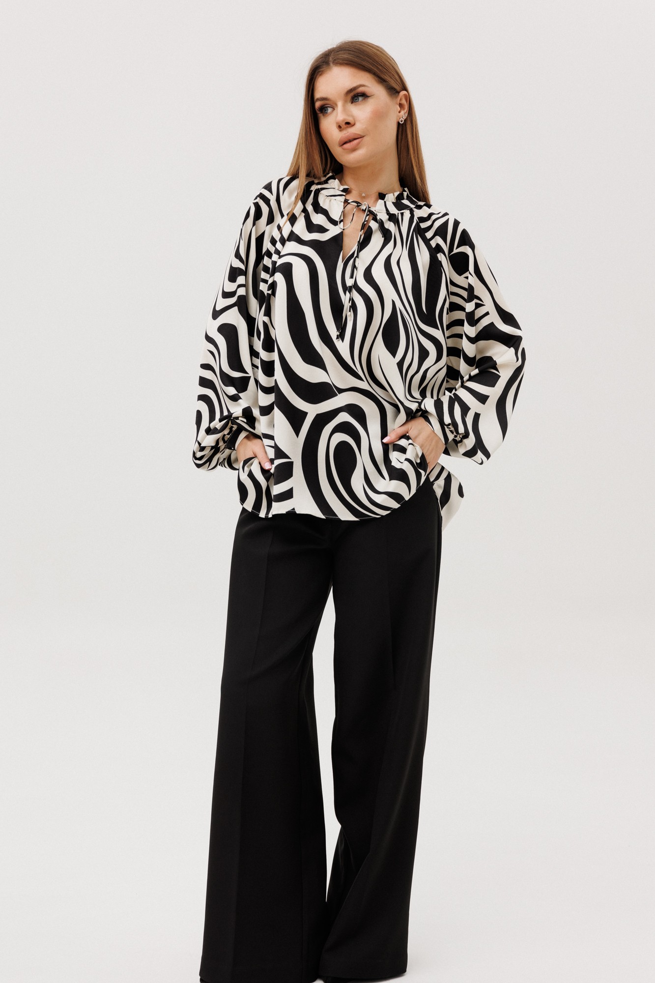 Блузка свободного силуэта (стиль оверсайз) с рукавом реглан. Горловина с разрезом спереди и притачной планкой с рюшей. Рукав на манжете. Модель без подкладки, не просвечивает.