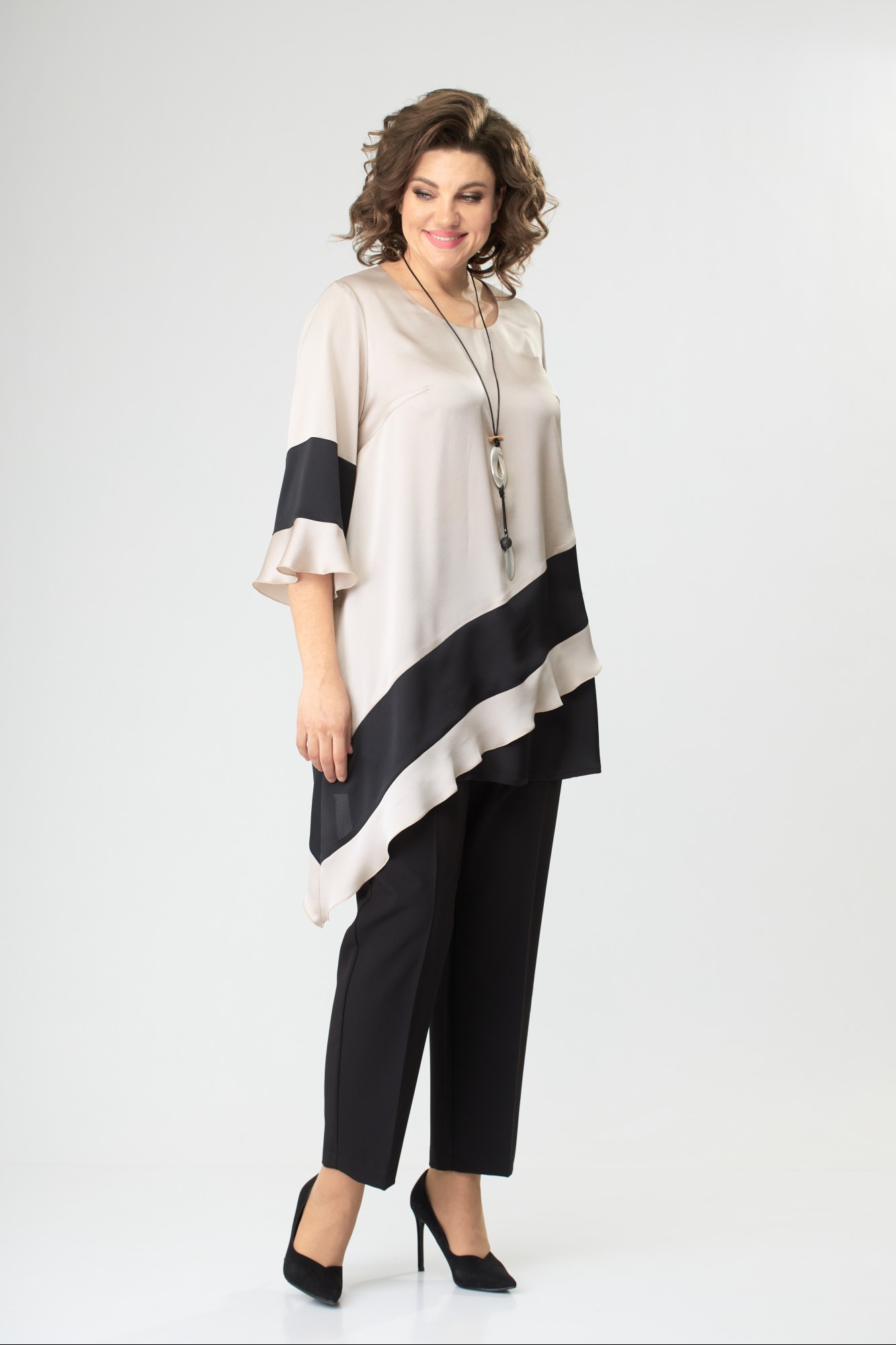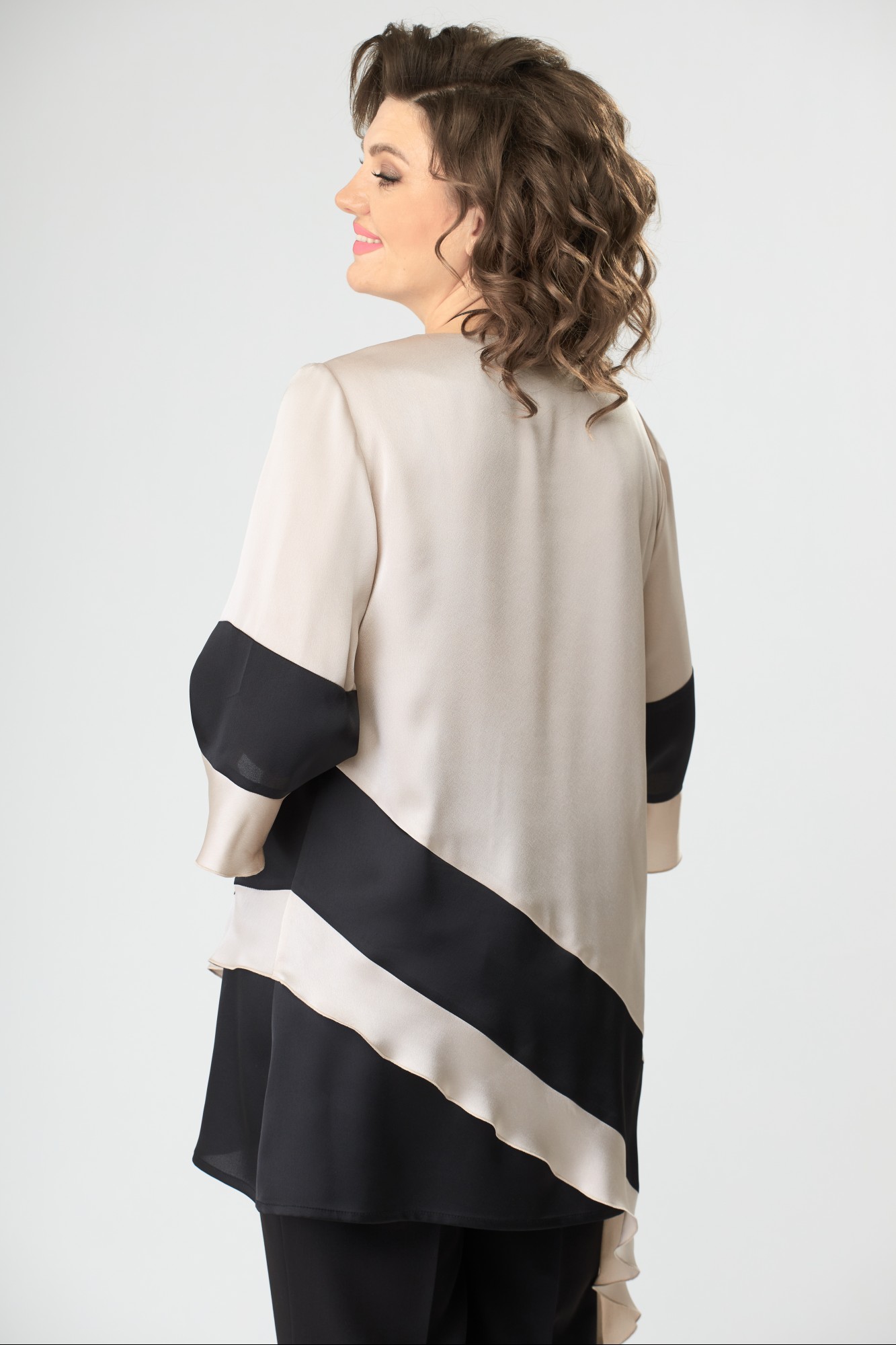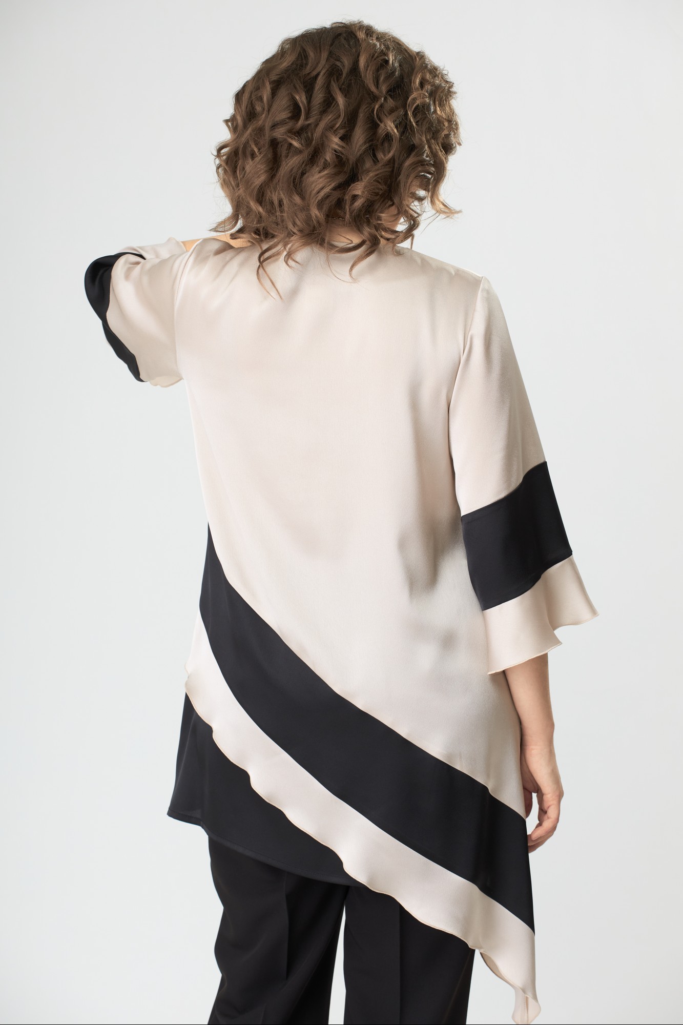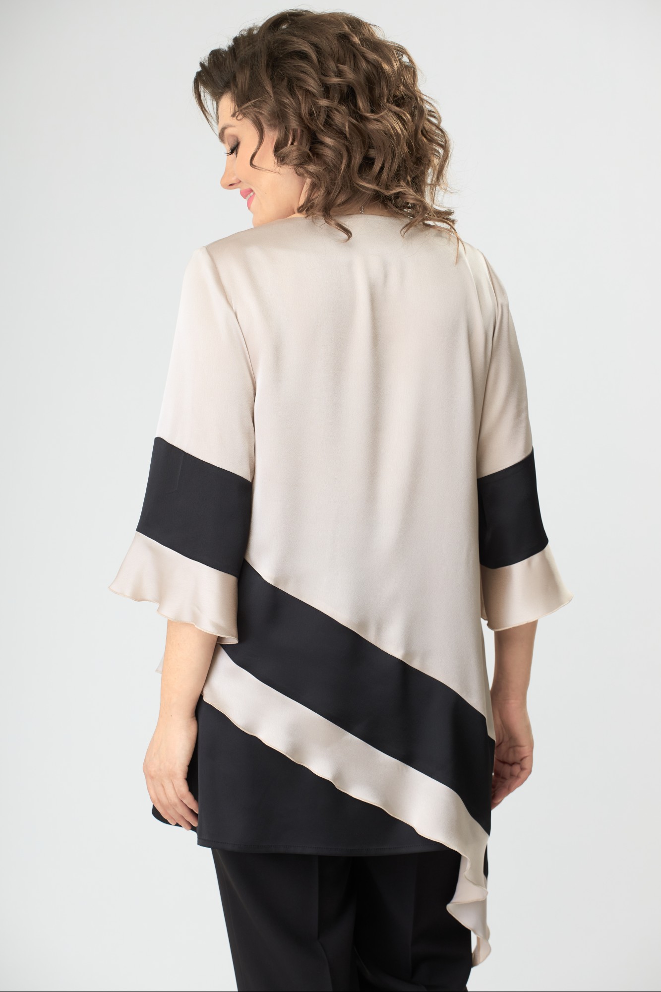 Блузка А-образного силуэта, выполнена из блузочной ткани контрастных цветов. Полочка блузки с нагрудными вытачками, горловиной круглой формы. Нижняя часть полочки и спинки с ассиметричной диагональной планкой и нижней частью из контрастной по цвету ткани. Рукав длиной ниже локтя, с планкой из контрастной ткани и воланом по низу.