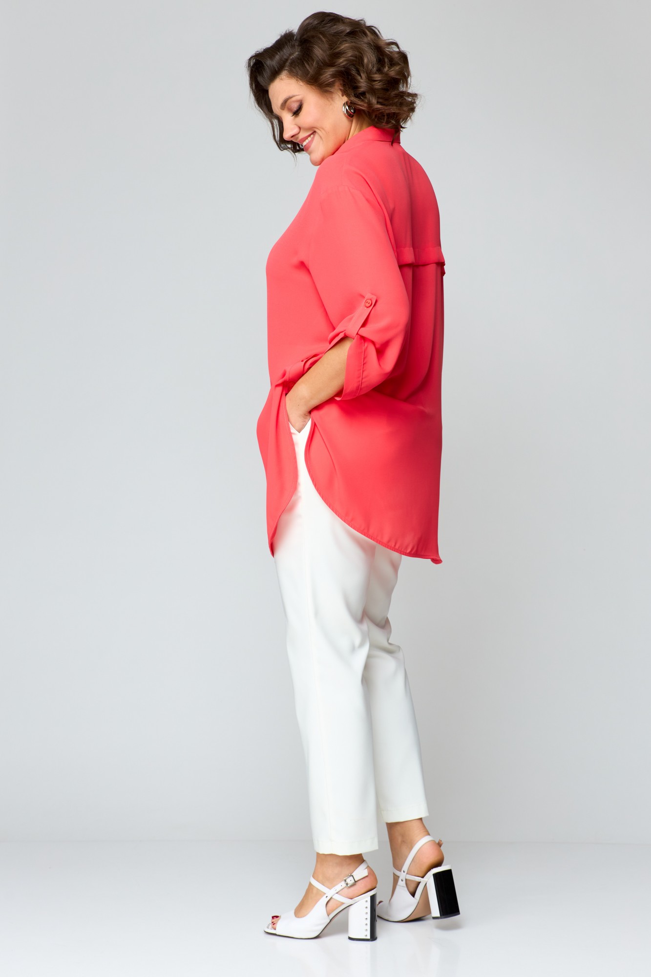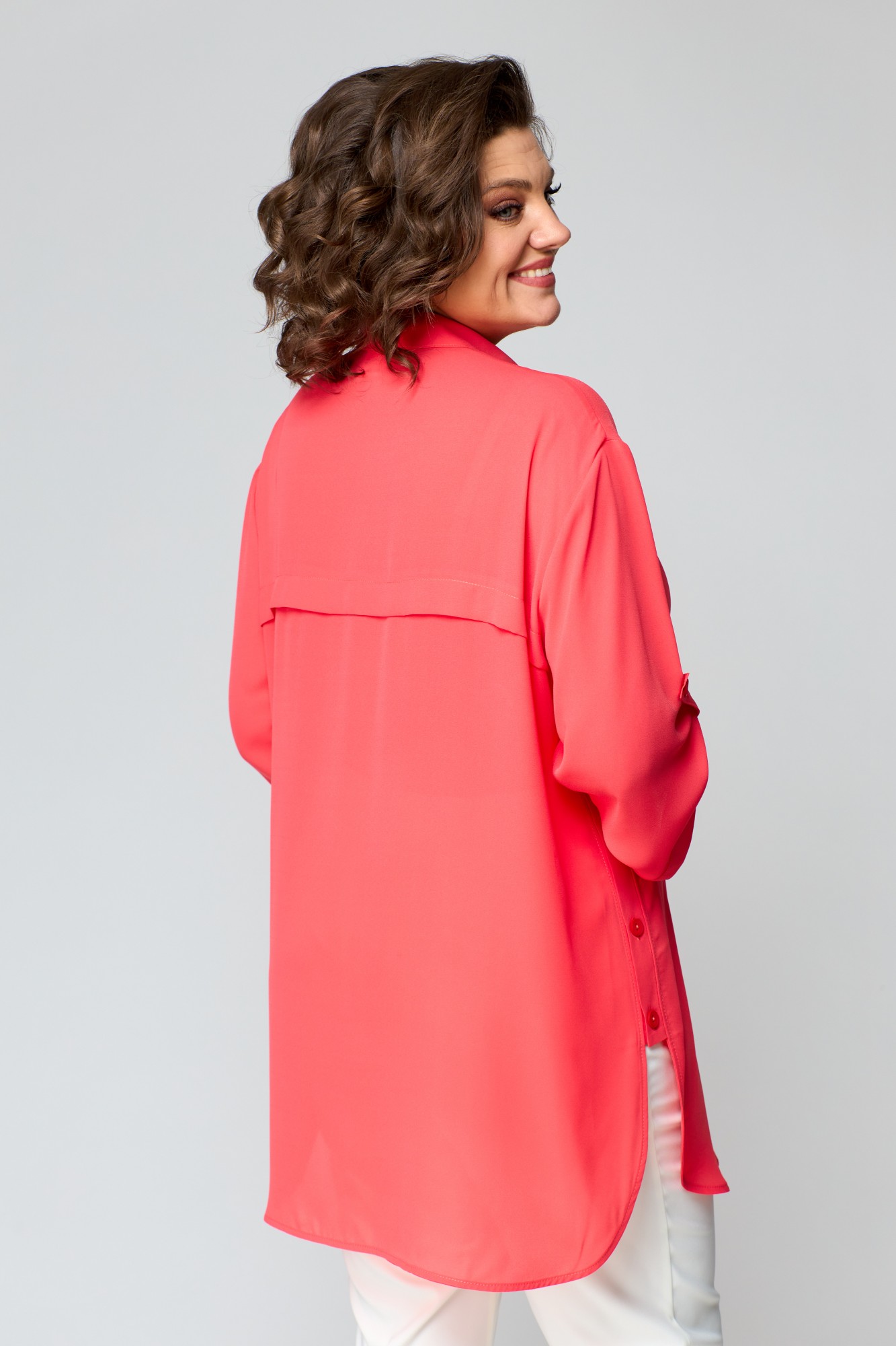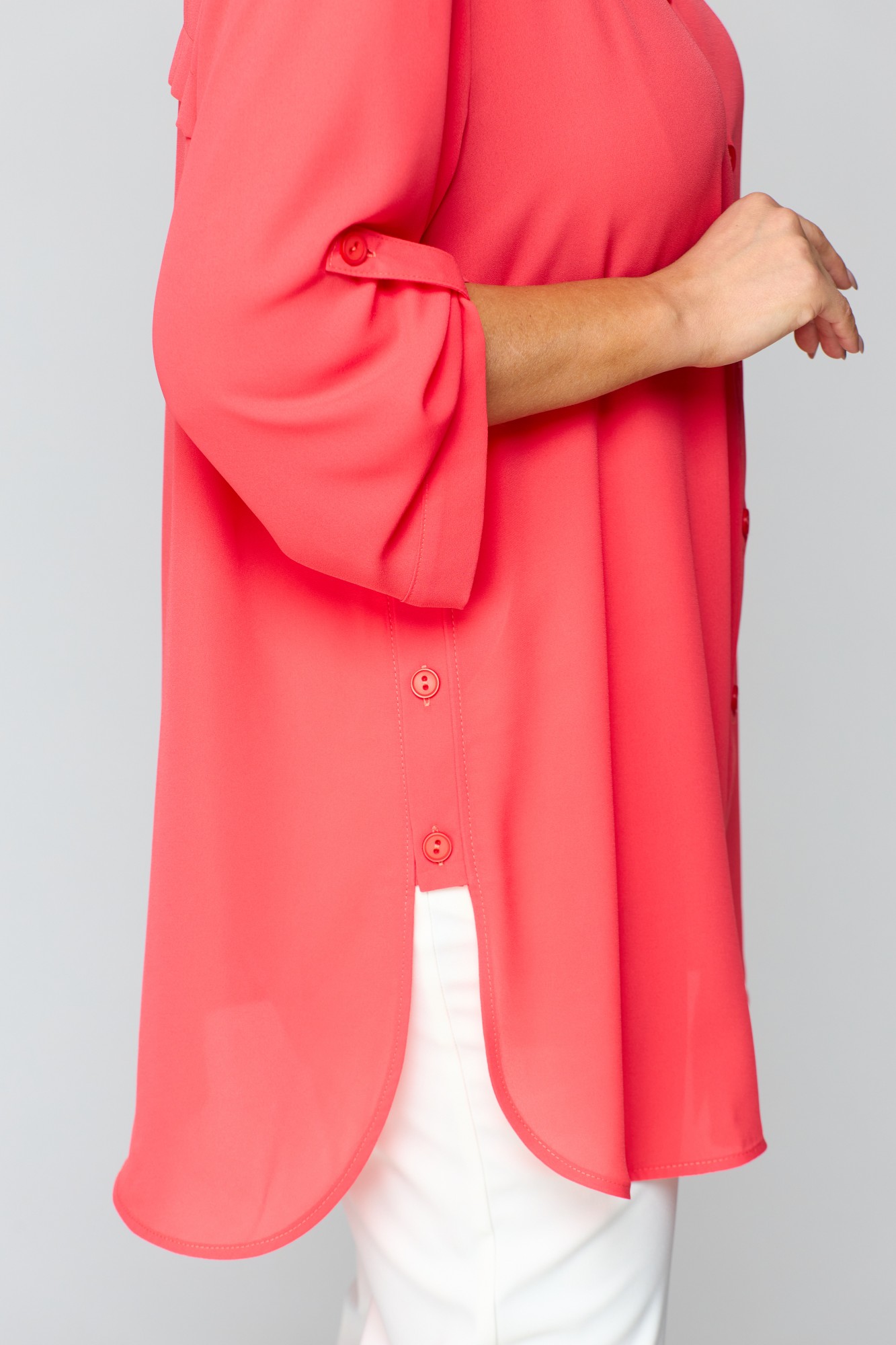 Блузка прямого силуэта, длиной ниже бедер, выполнена из однотонной ткани. Полочка с застежкой на петли и пуговицы, по правой нижней части декор в виде принта. Спинка с отрезной кокеткой, но которой выполнен декор в виде принта. Воротник рубашечного типа, стояче-отложной. Низ блузки ассиметричный, по боковым швам обработана застежка. Пройма углубленной формы, рукав рубашечного типа, длиной 7/8 по низу с патами.