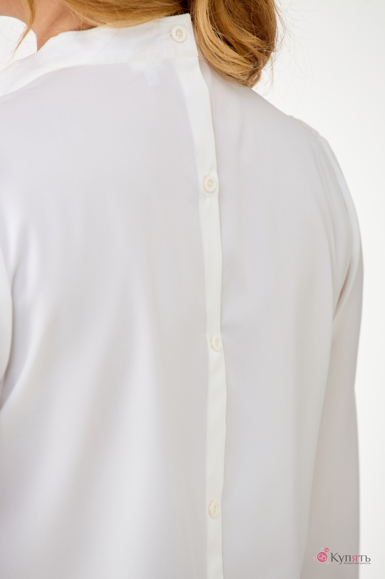 Прямой силуэт,втачные длинные рукава с небольшой сборкой по окату,низ рукава на резинке.Воротник-стойка,от шва притачивания которого небольшие кокетливые складочки.Застёжка на пуговицы в среднем шве спинки.